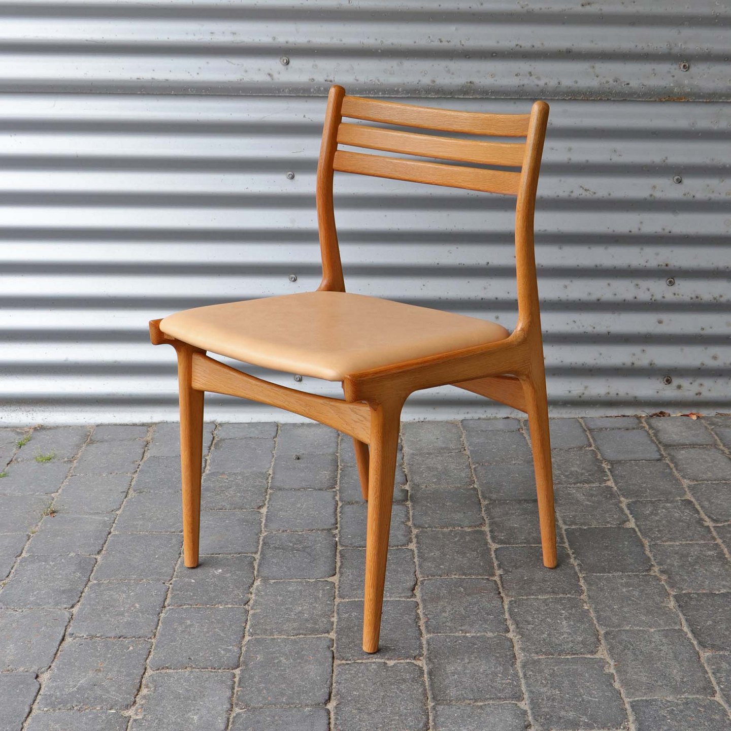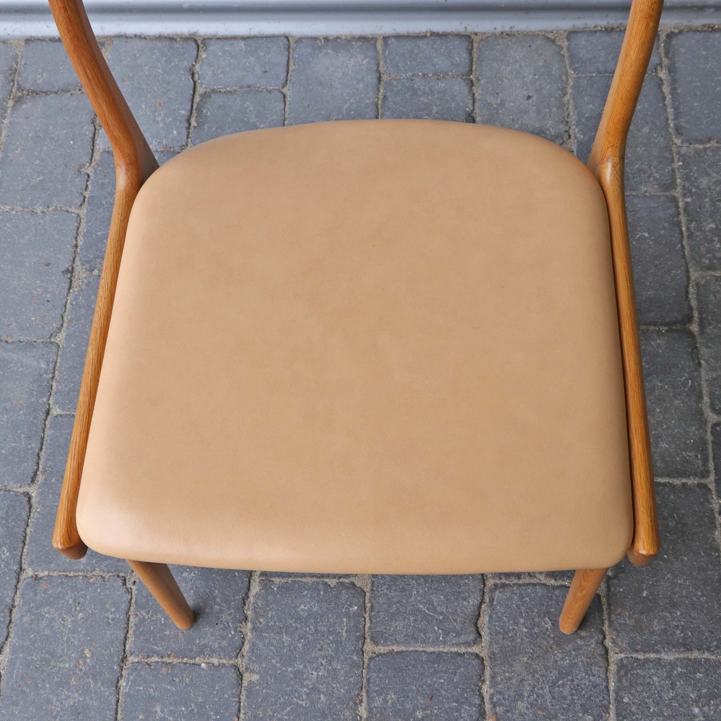 Sæt med 8 spisebordsstole i lakeret egetræ og sæder med beigefarvet læder