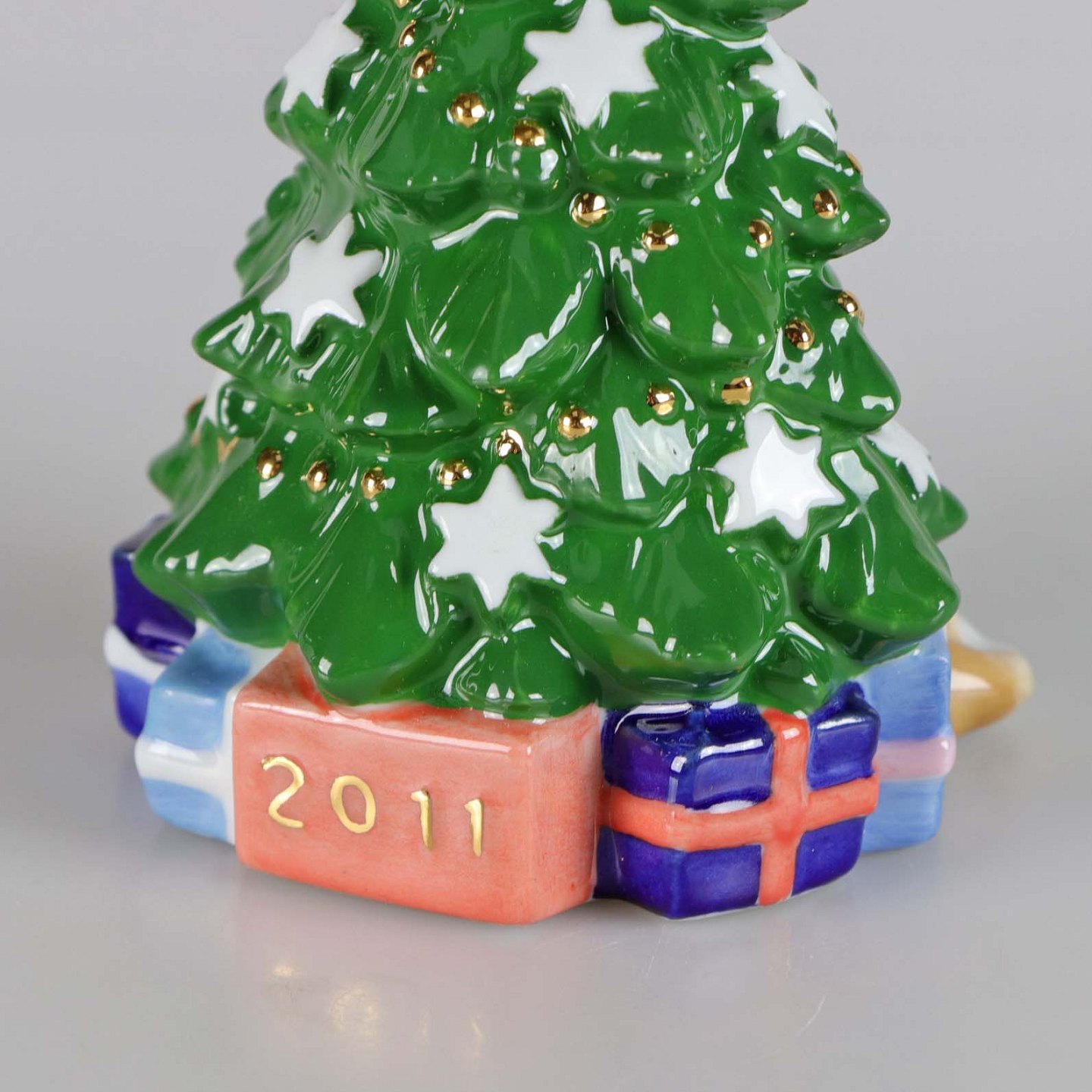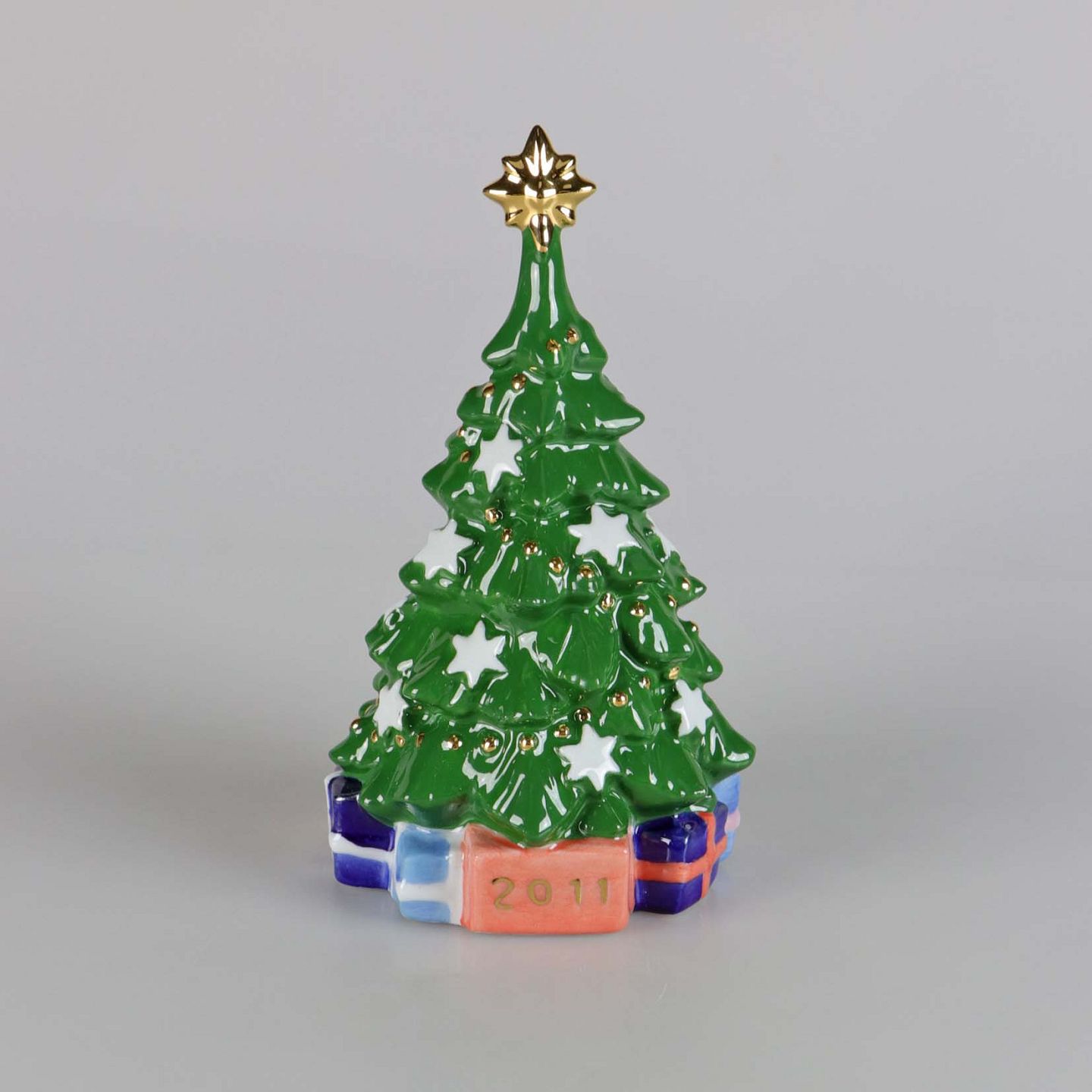 Årets juletræ i porcelæn År 2011 pyntet med hvide stjerner og guld ranke. Nr. 837