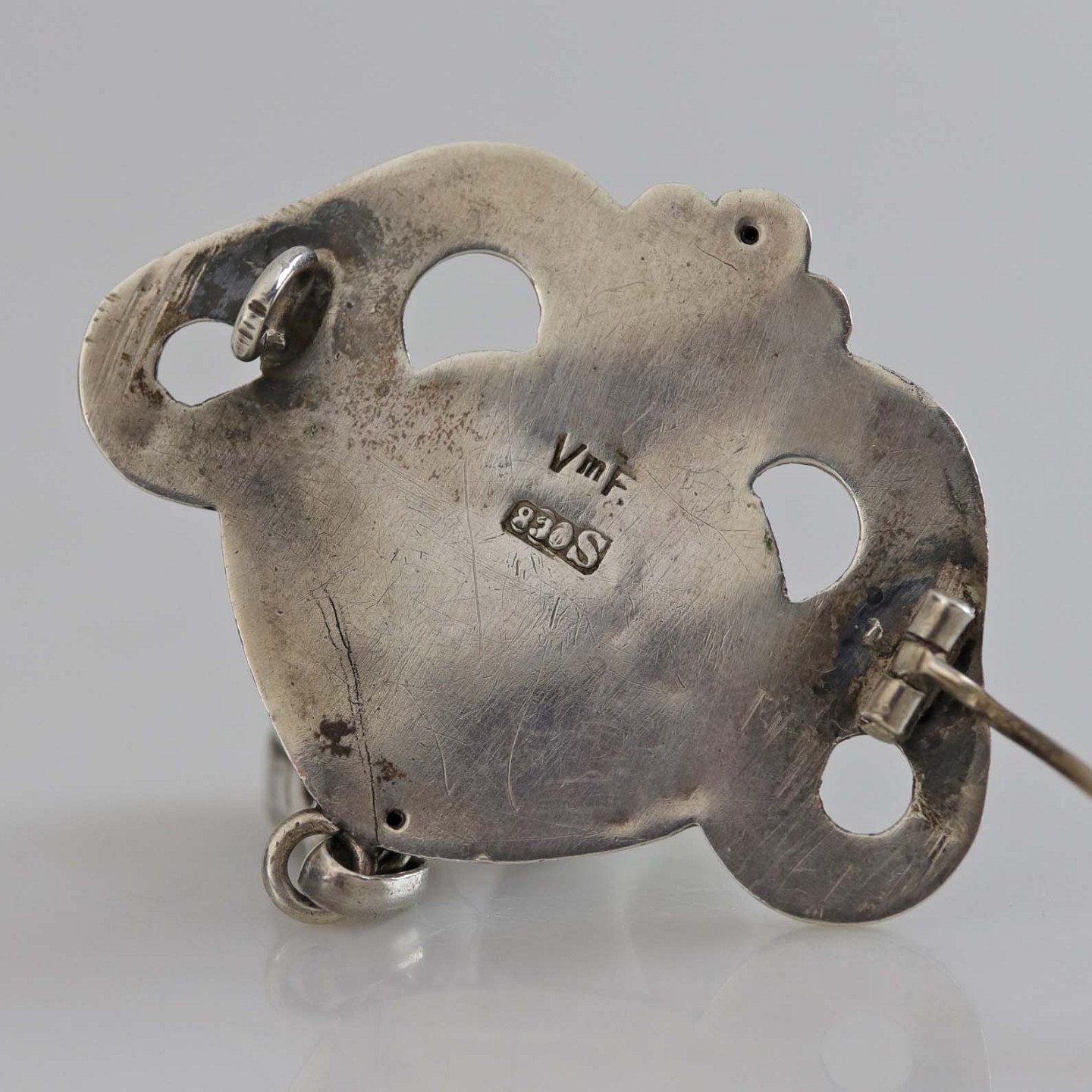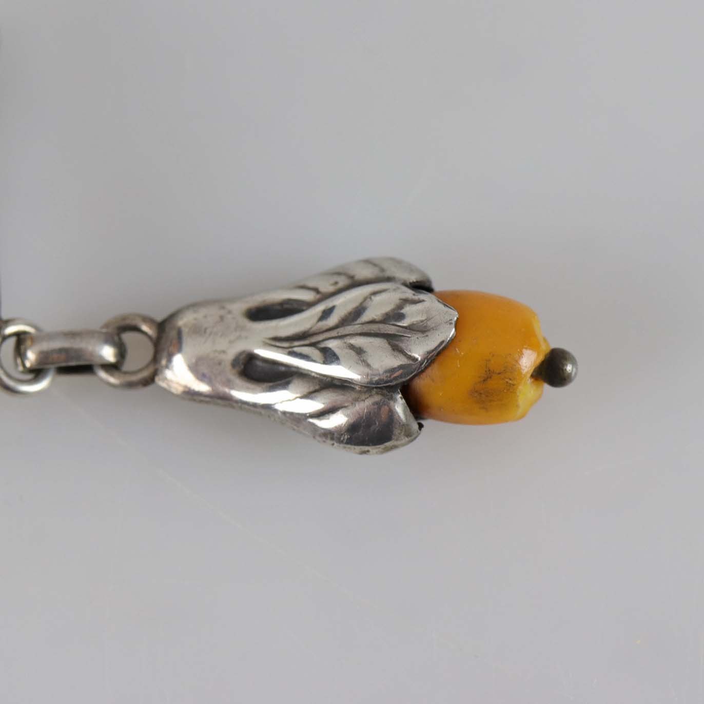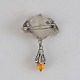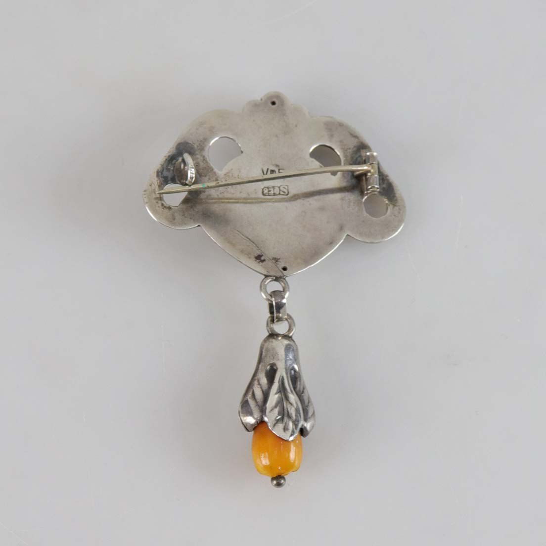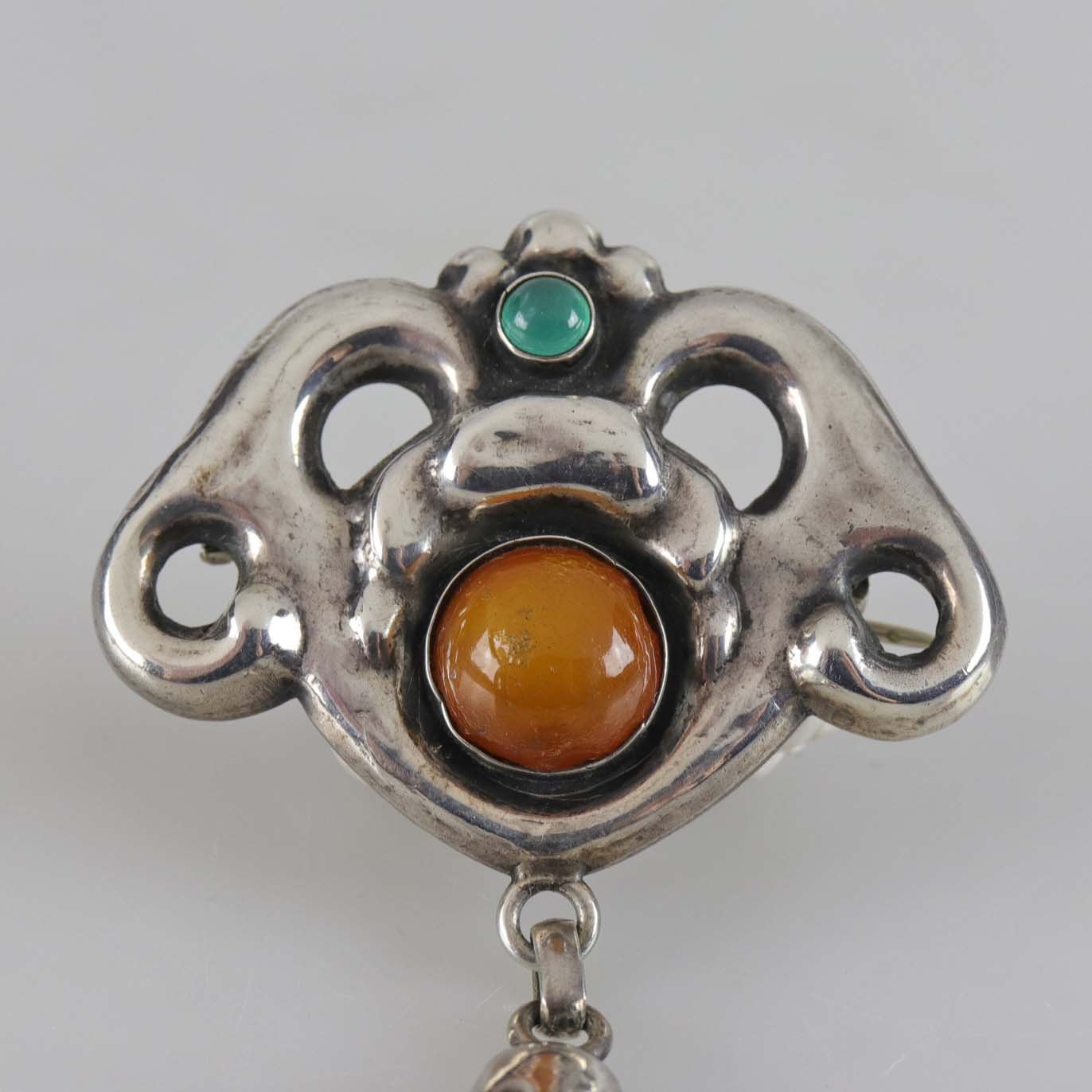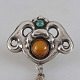 Jugendbroche af sølv dekoreret med rav og cabochon slebet grøn Agat.
