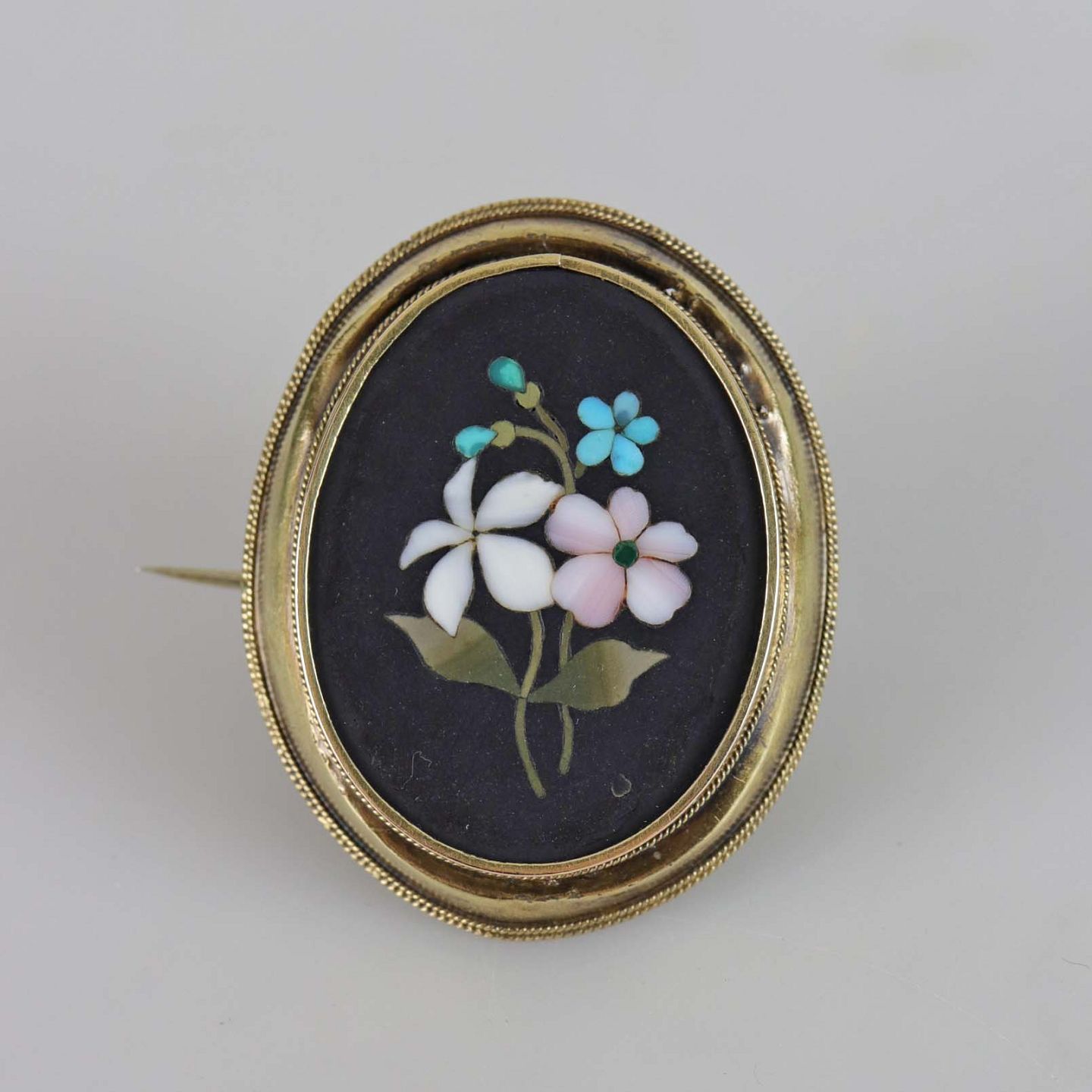 Motiv med blomster af små stykker mosaik i halv-ædelsten indlagt i den sorte baggrund.