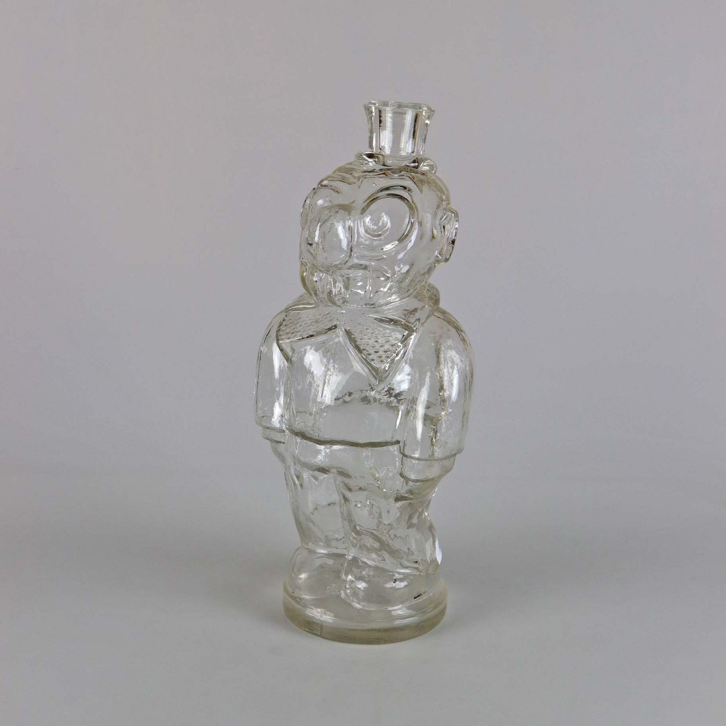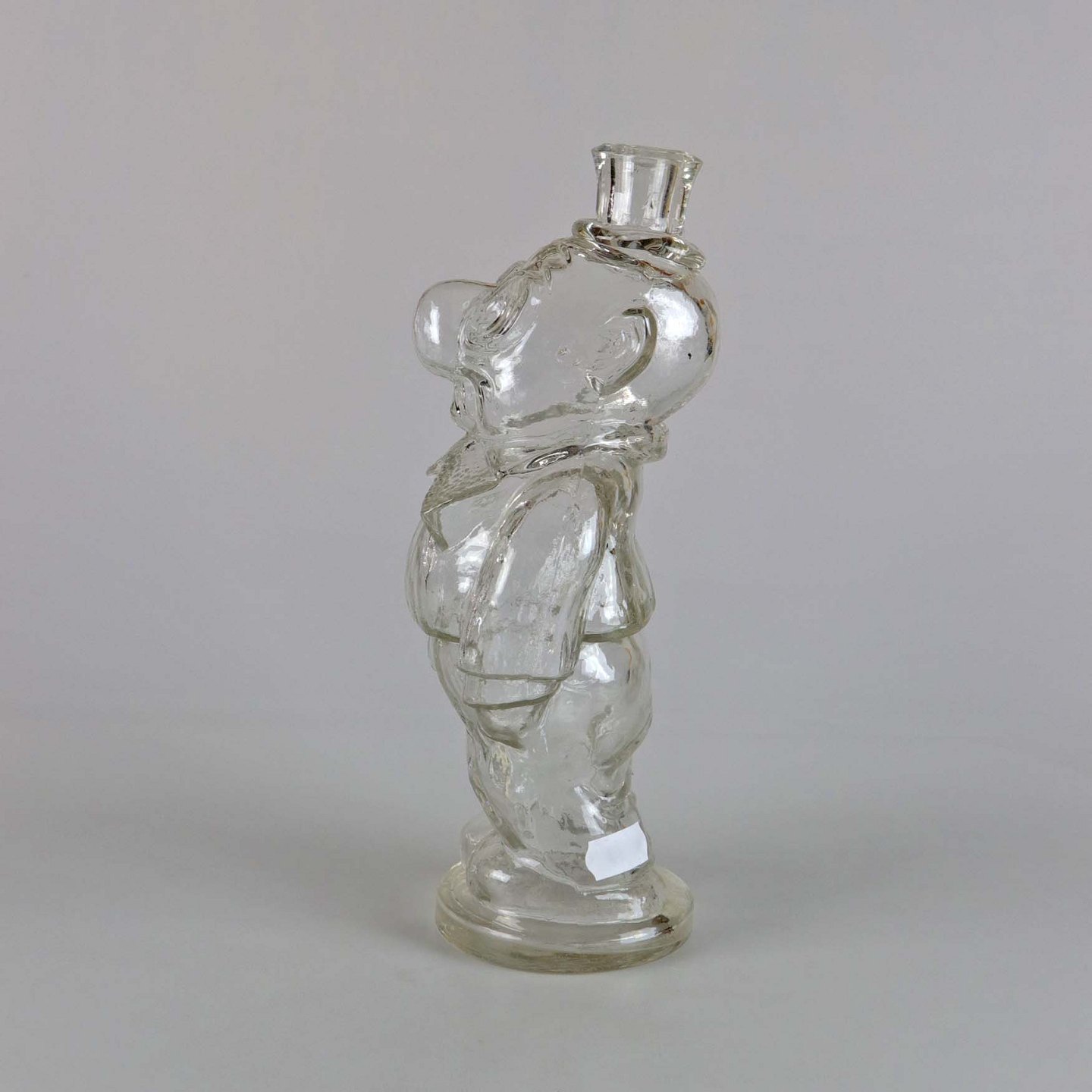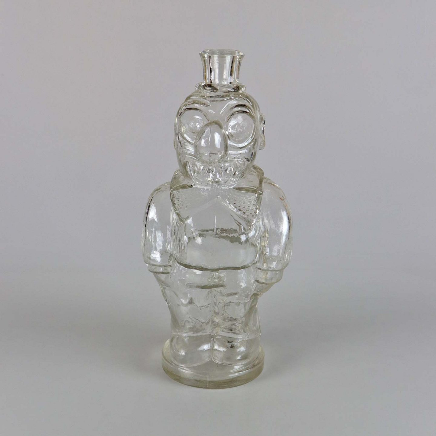 Meget sjælden mundblæst figurflaske af glas, formet som Storm Petersen figuren "Peter" med lille hals og munding til korkprop.