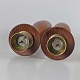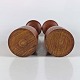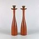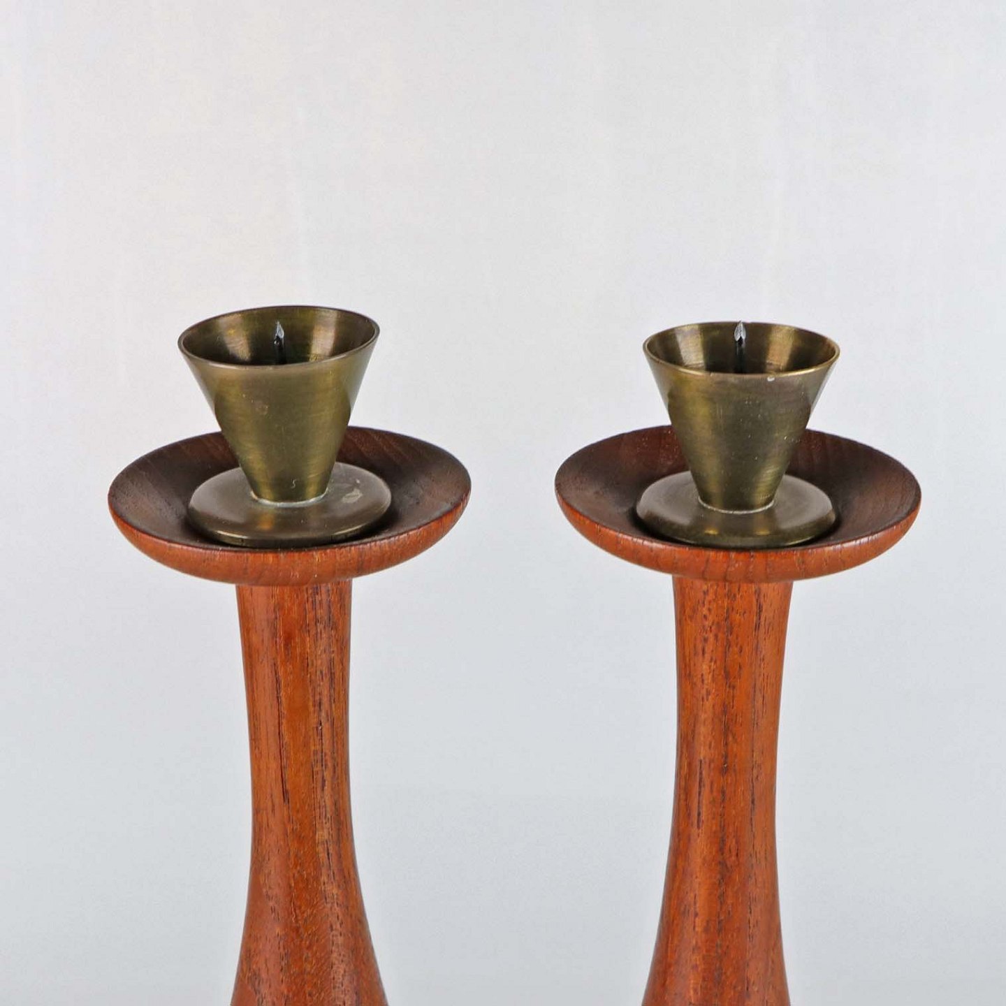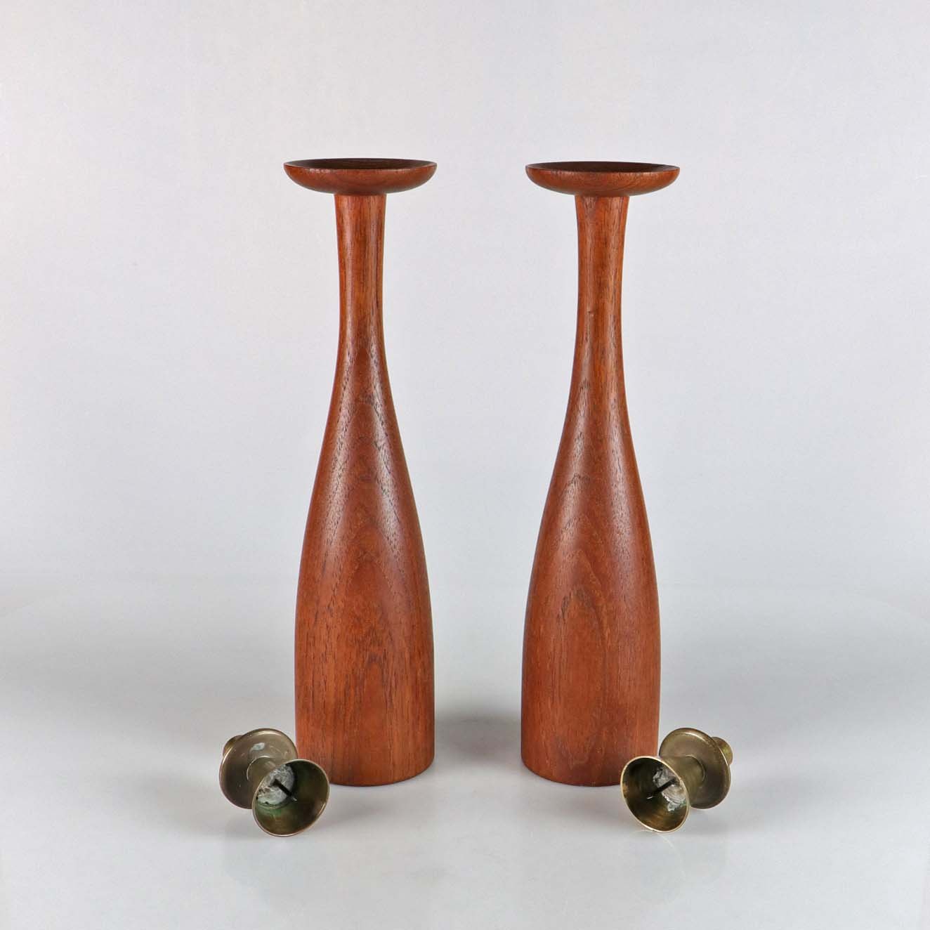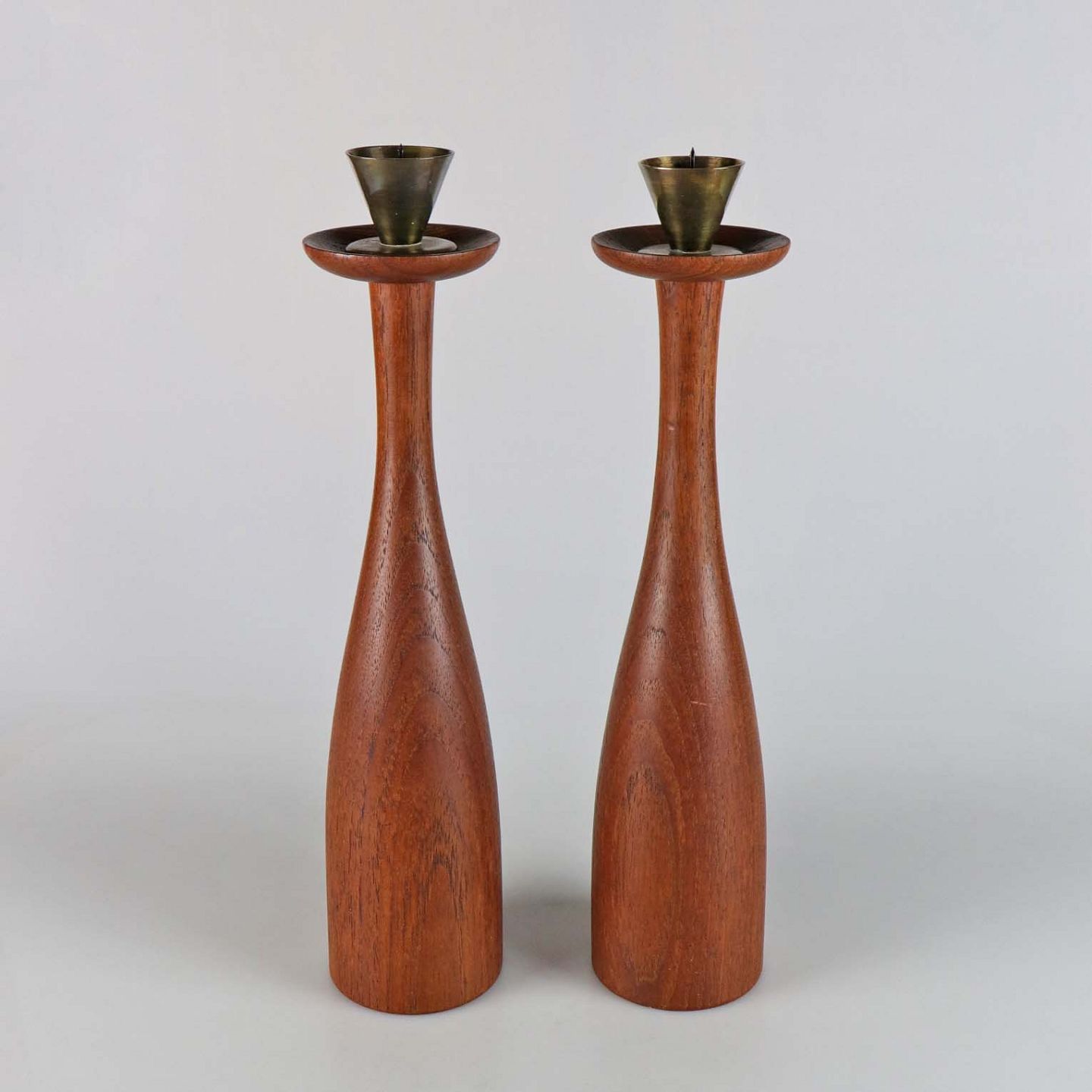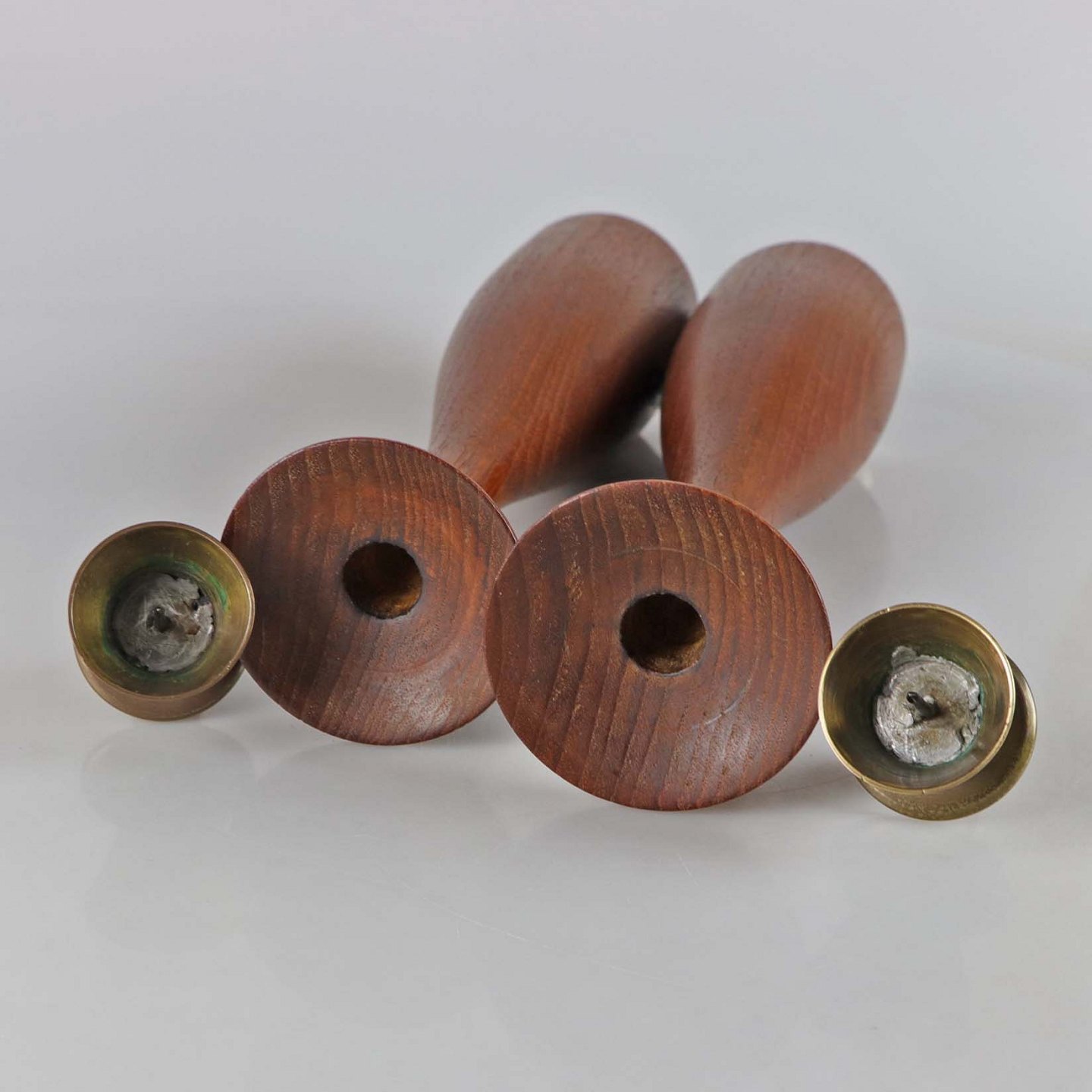 Lysestager i teak med aftagelig top af messing. 2 styk