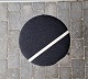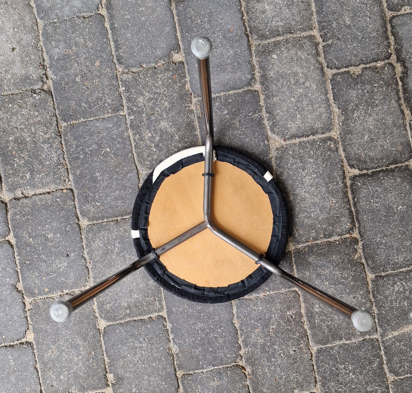 Skammel med rundt sæde og ben af metal. Nypolstret sort betræk med smalle hvide striber.