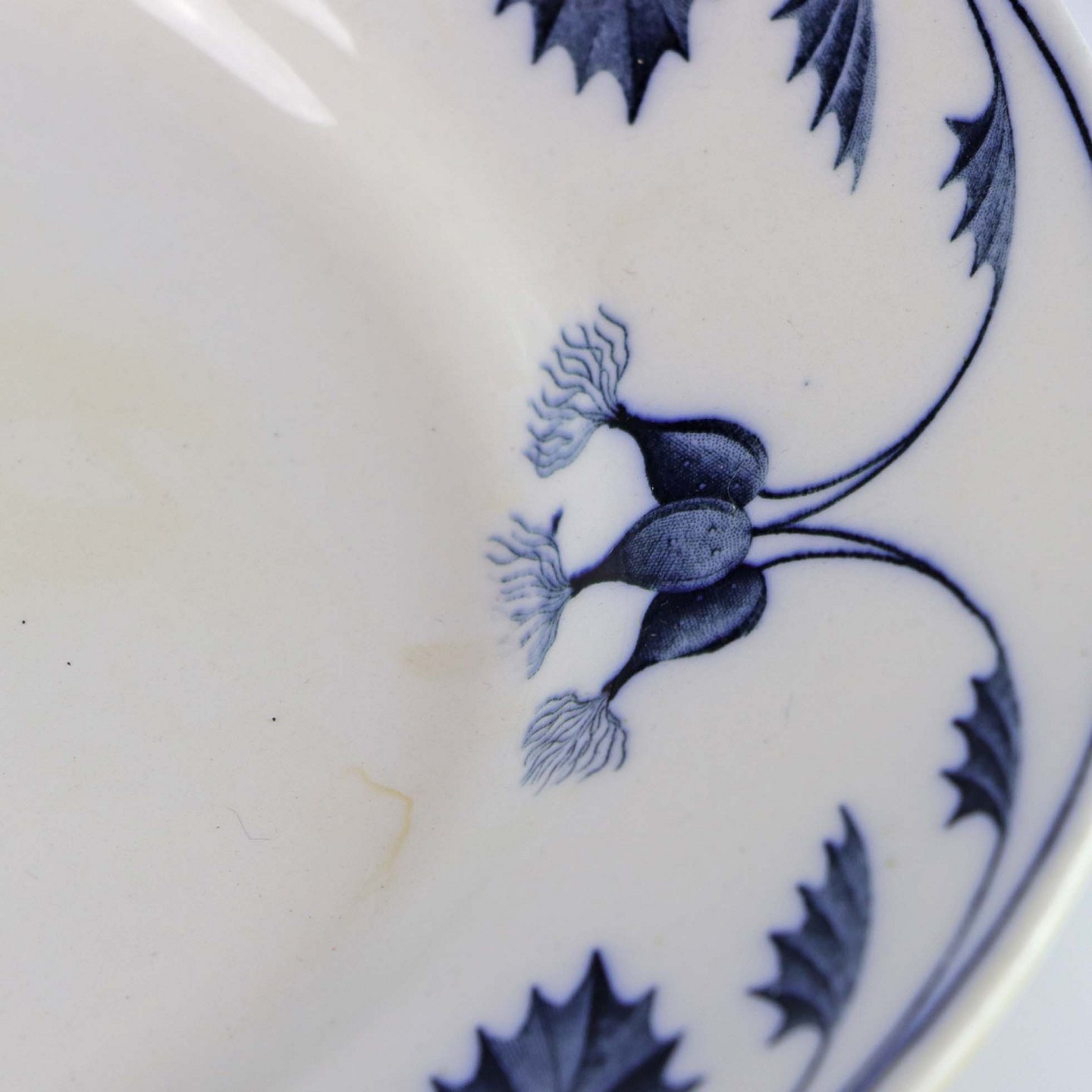 Stellet Tidsel er tysk og er lavet i fajance. Stellet er hvidt og dekoreret med en ranke af blade og tidsler i grå blå farver