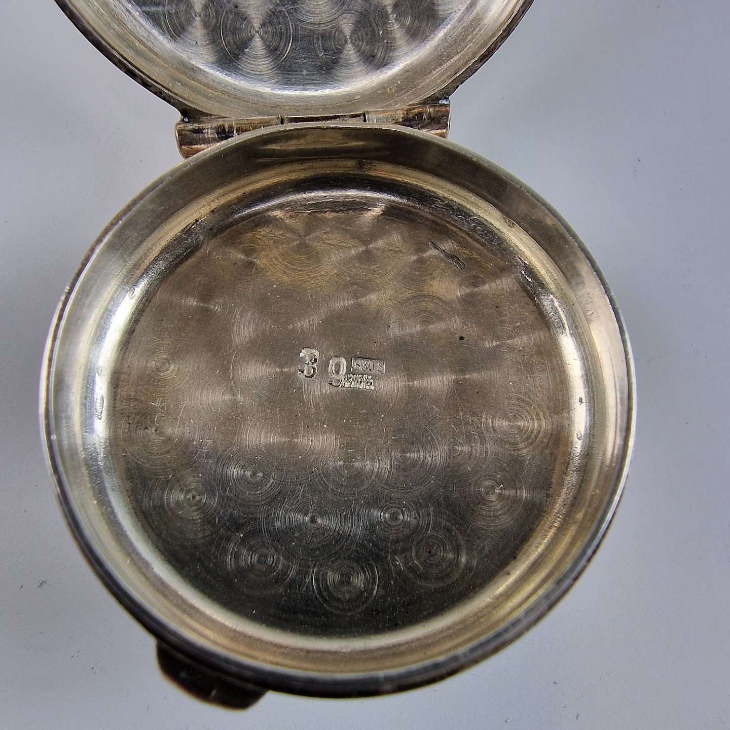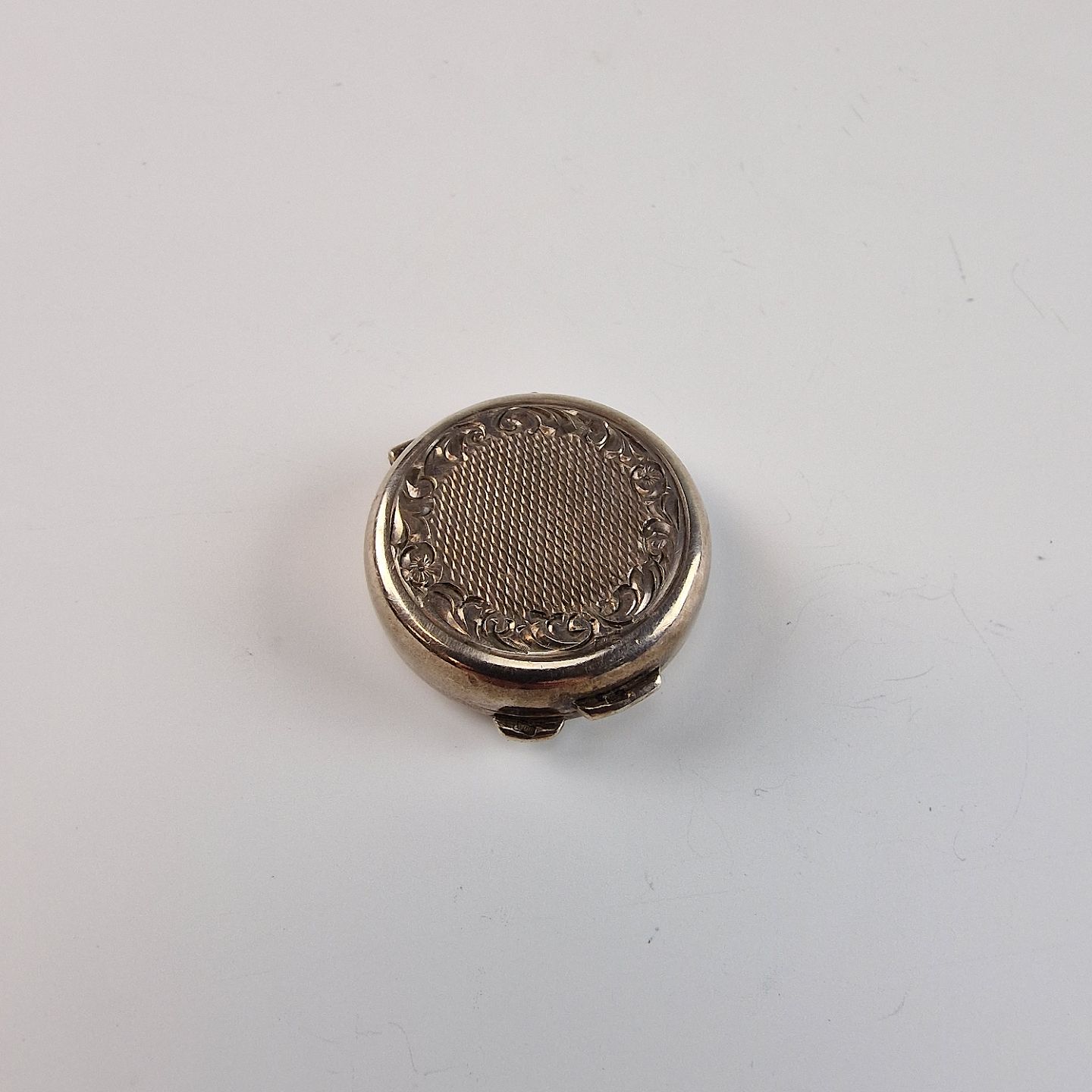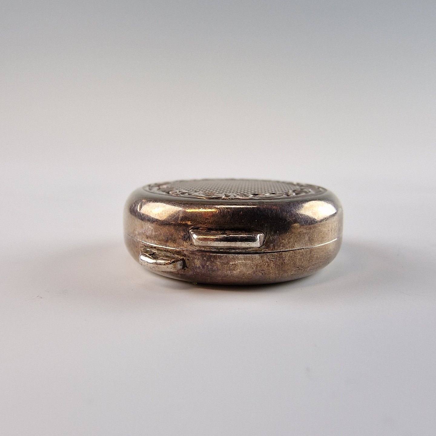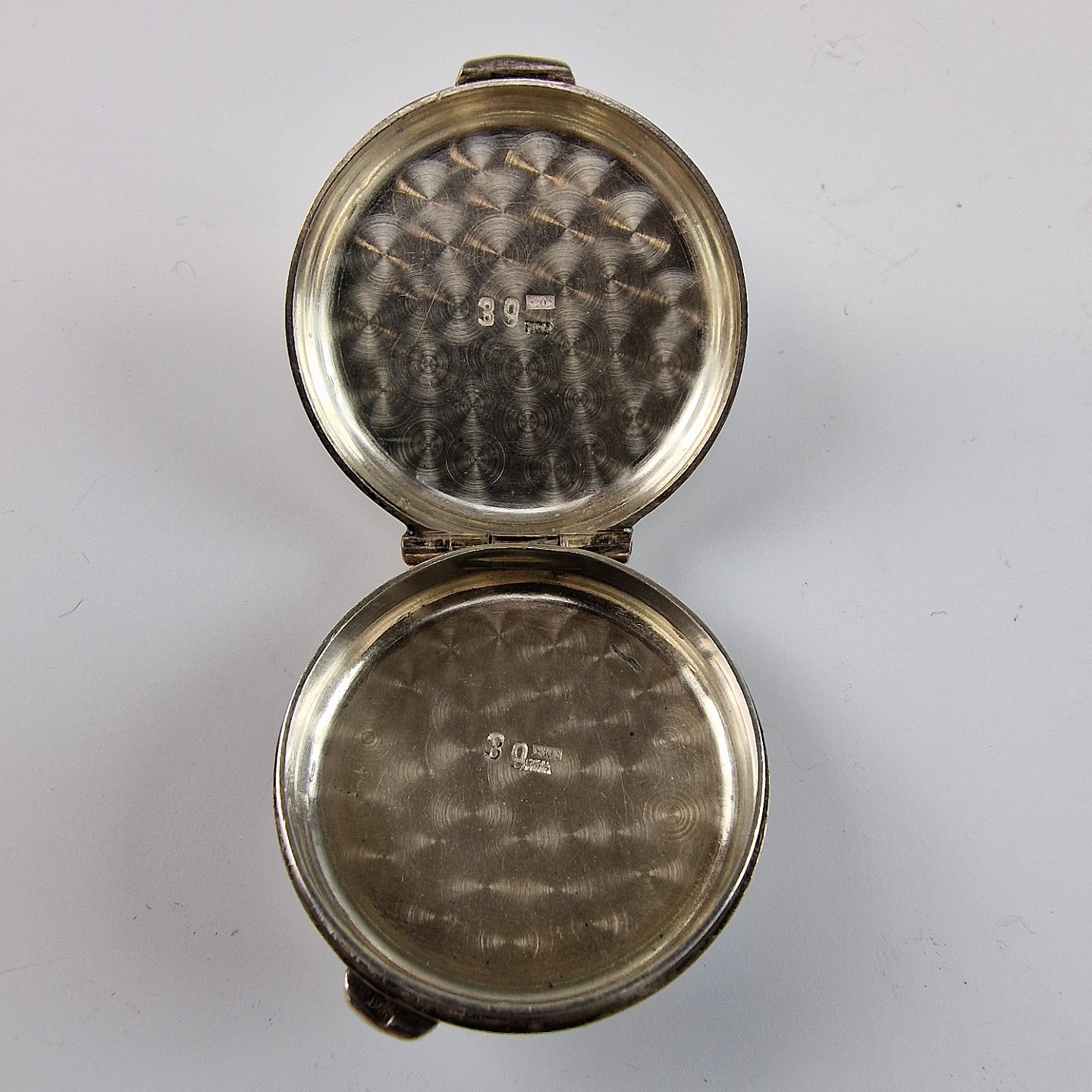 Rund pilleæske af sølv med forskellige mønstre på låget. Tallet 39 er stemplet i låget