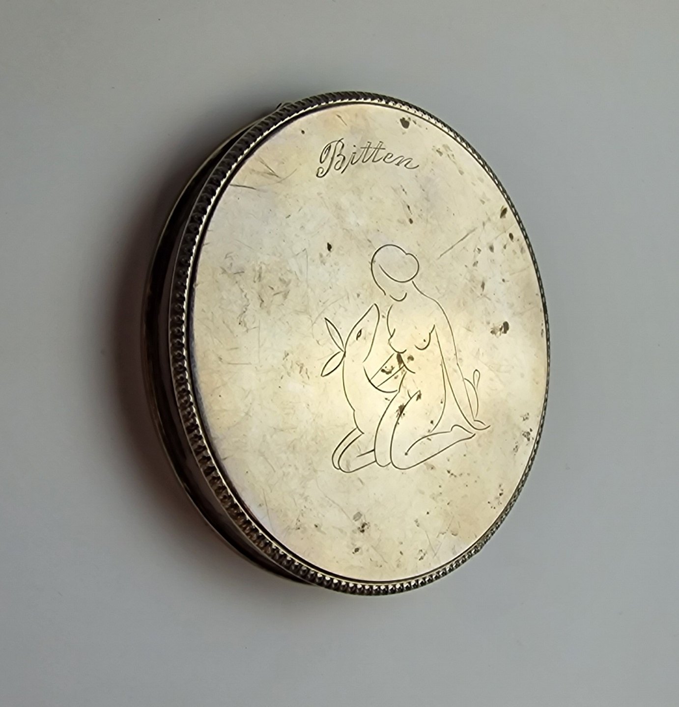 Rund pudderdåse i sølv med spejl og motiv af nøgen kvinde med dådyr.