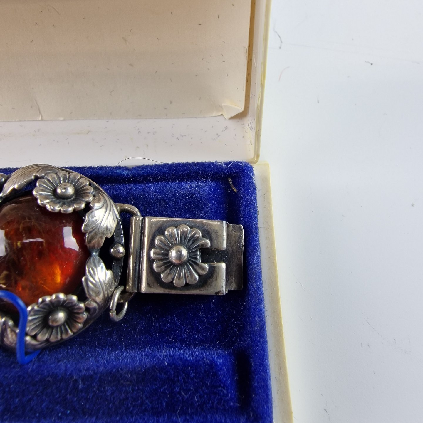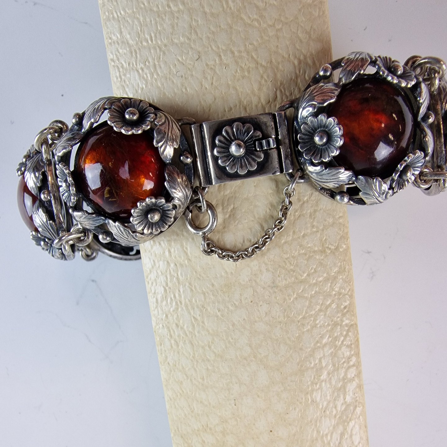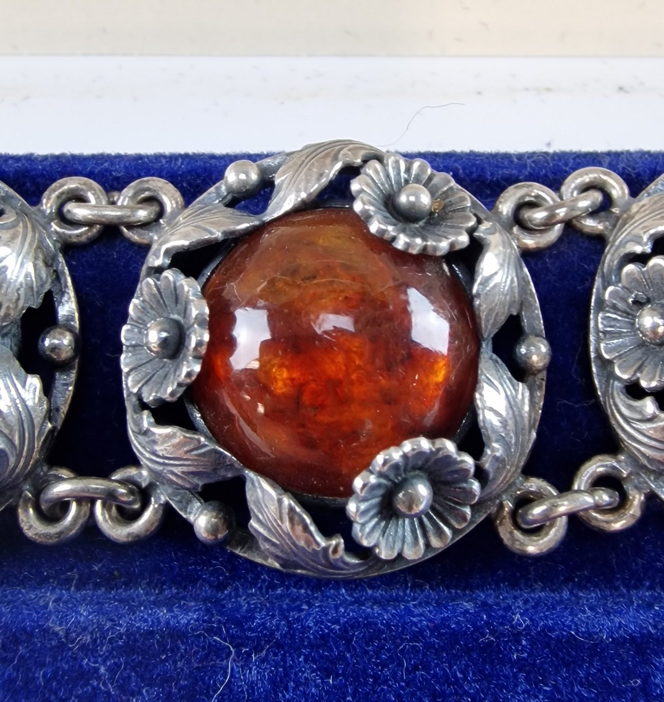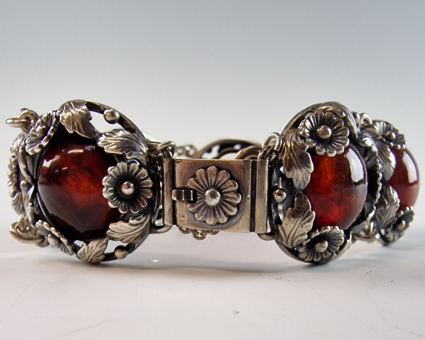 Armbånd i sterlingsølv med 7 stykker rav isat i kranse af blomster. Armbåndets lås er med ekstra sikkerhedslås på.
