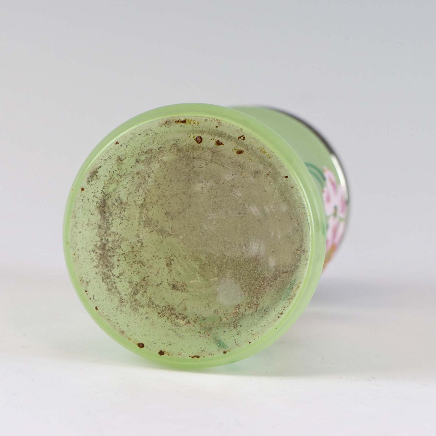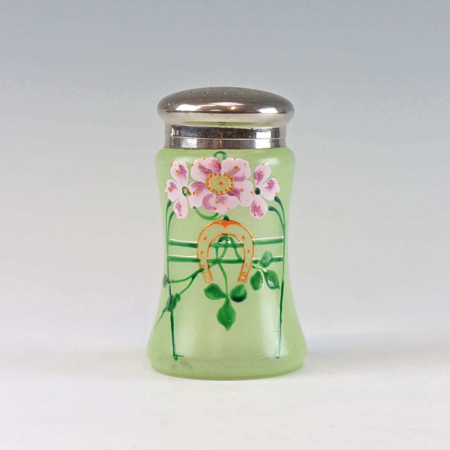Sukkerstrø i malet glas med motiv af blomster og gylden hestesko