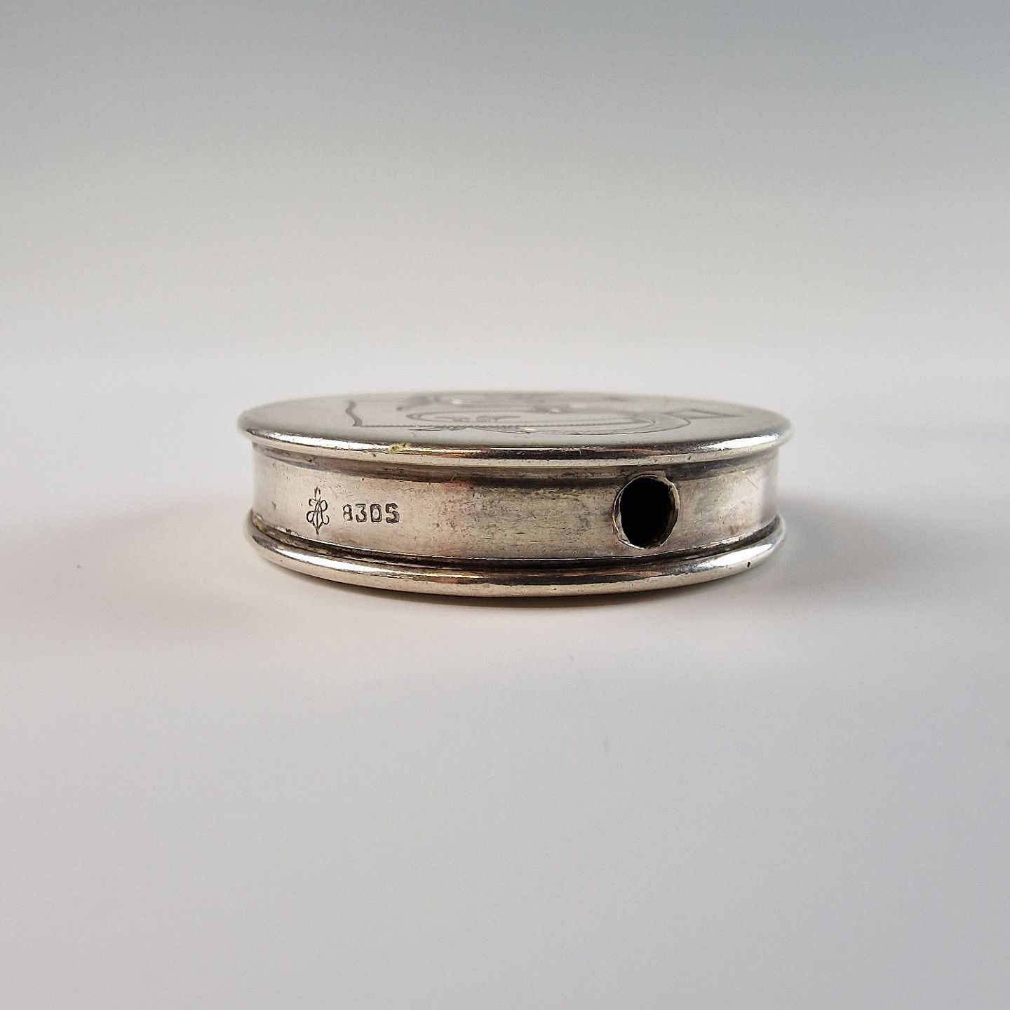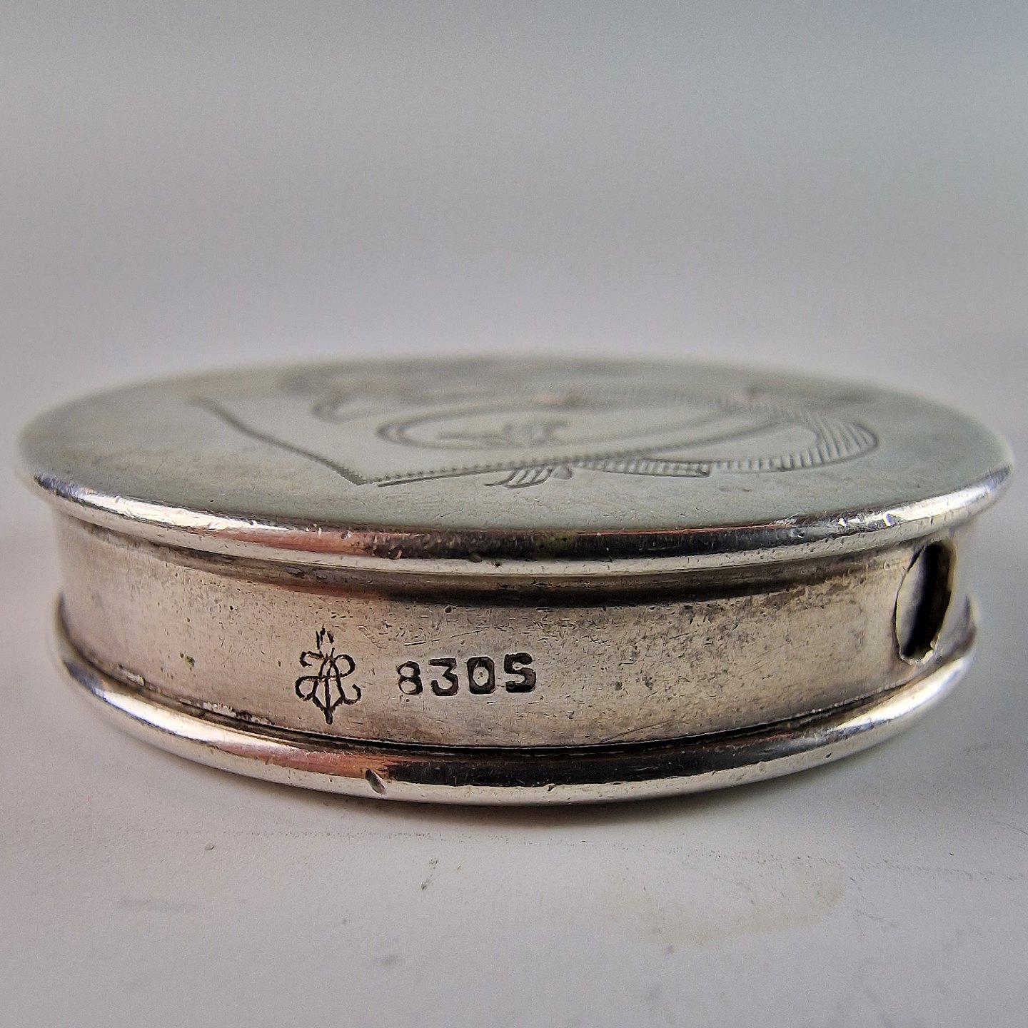 Rund pilleæske i sølv med indgraveret ES på låget