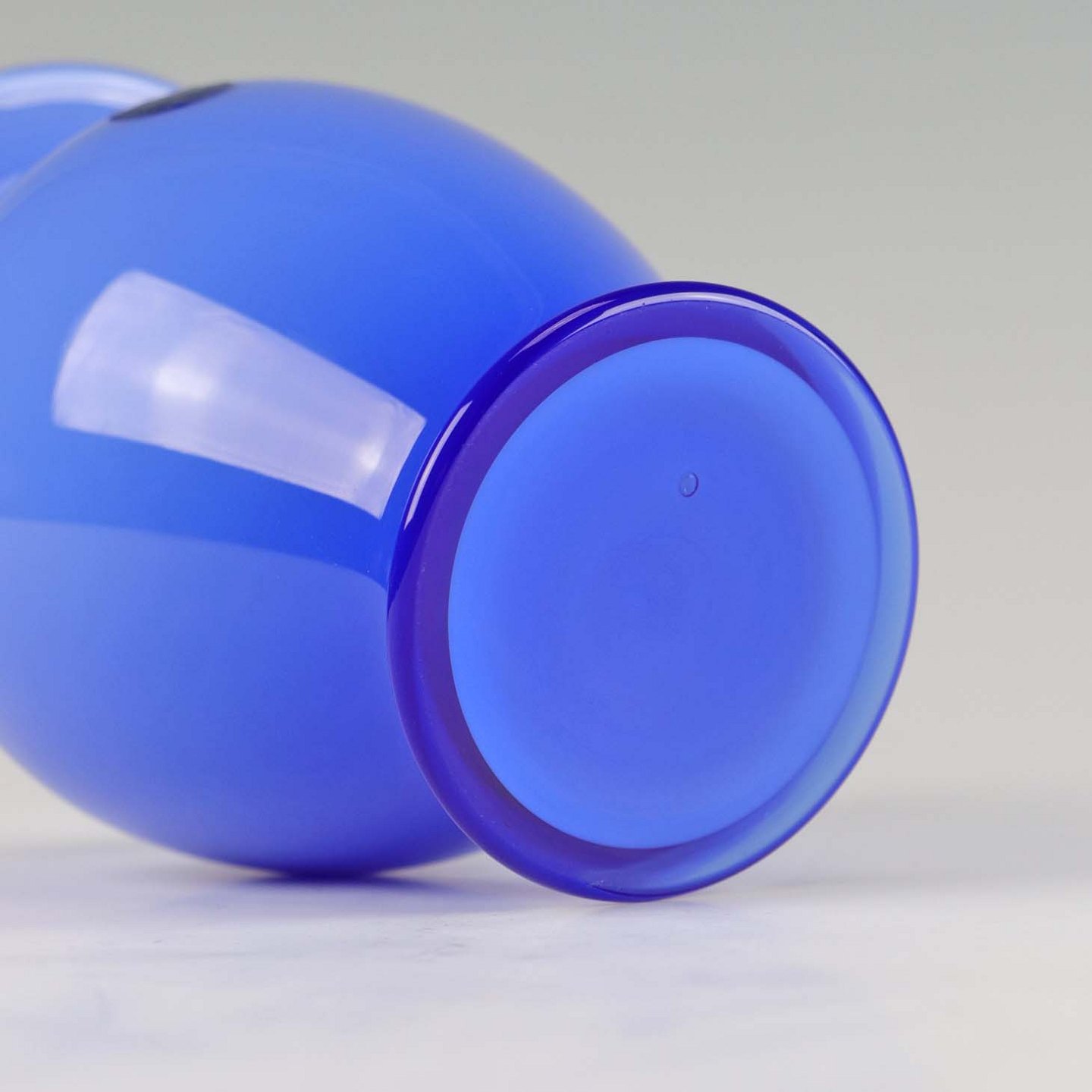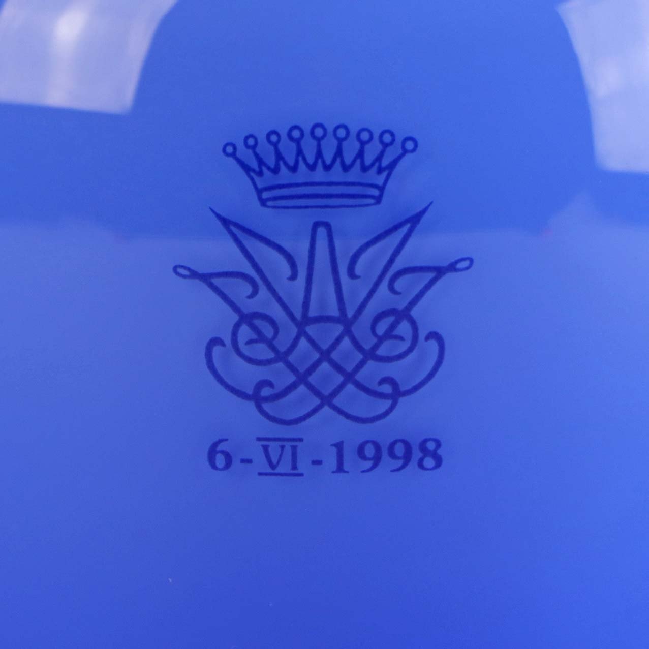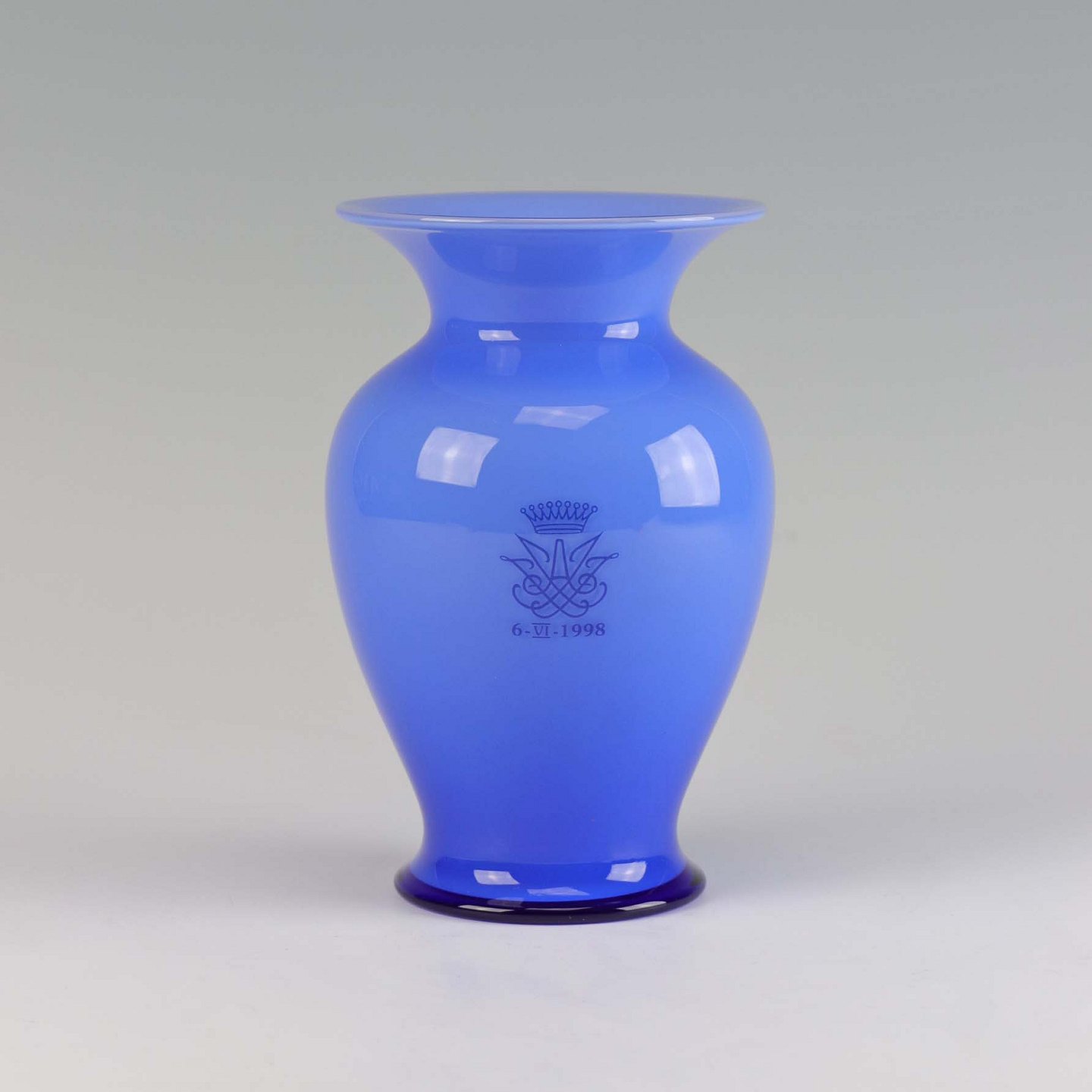 Amfora vase i opal blå glas. Vasen er mundblæst ved Holmegaard glasværk og var en gave til de kongelige medarbejdere ved det danske hof. Indgraveret monogram og 6 - VI - 1998