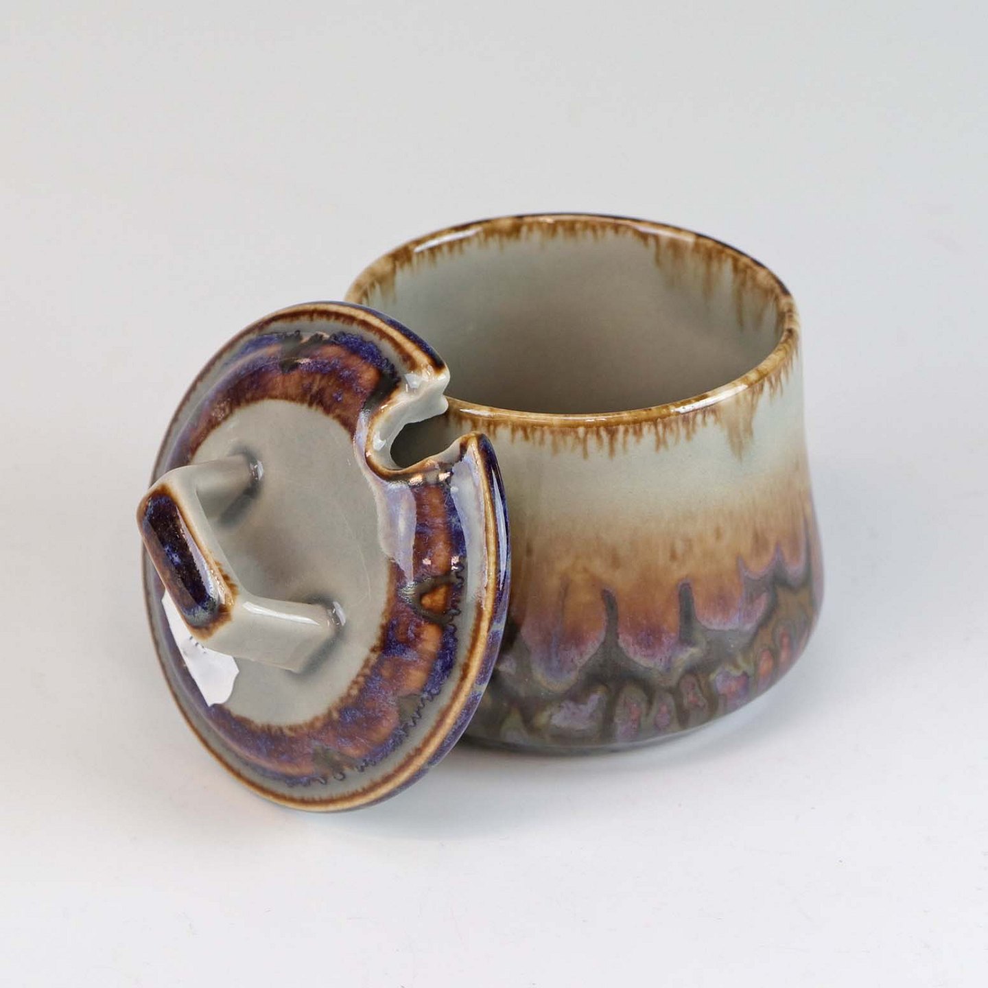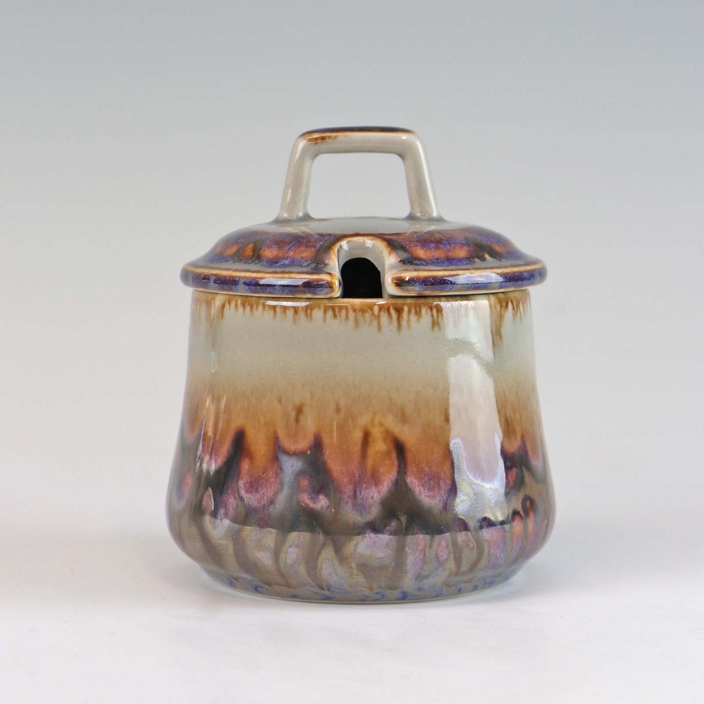 Krukke af stentøj, med låg og hul til ske, fra stellet Mexico. No 302
