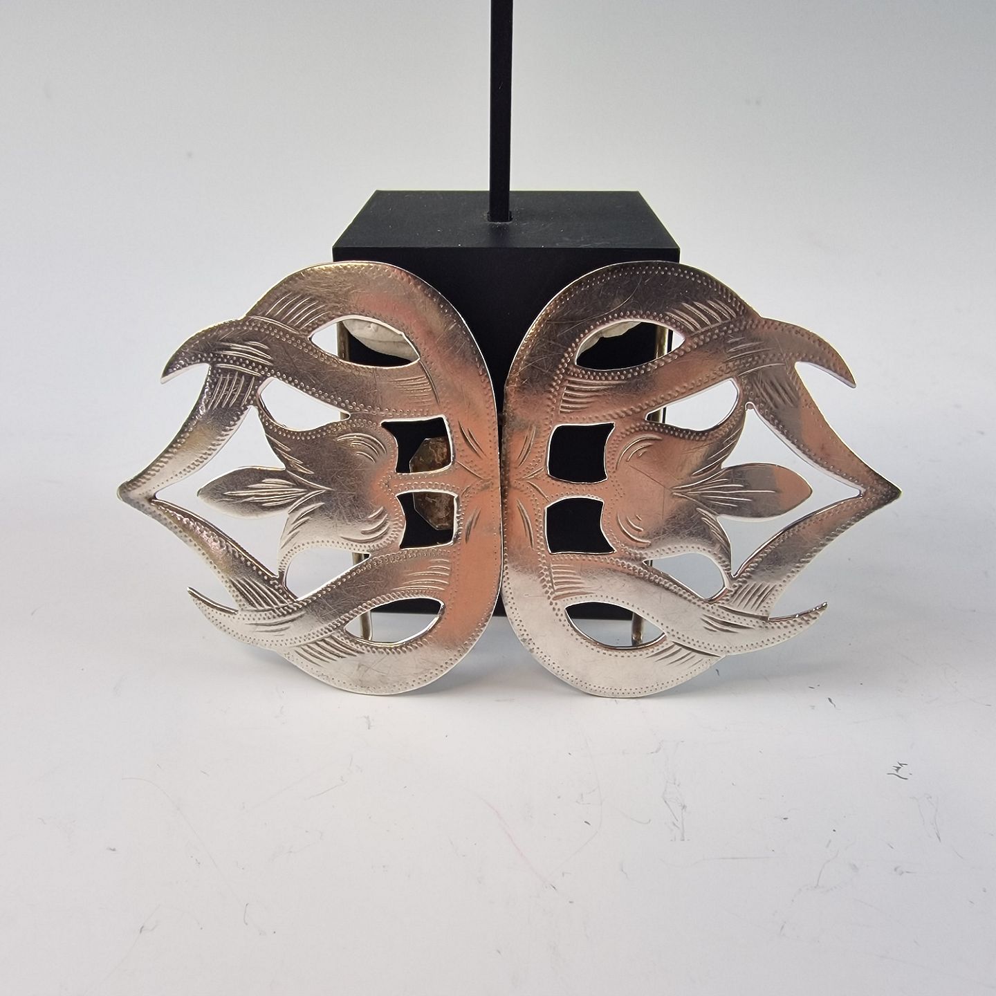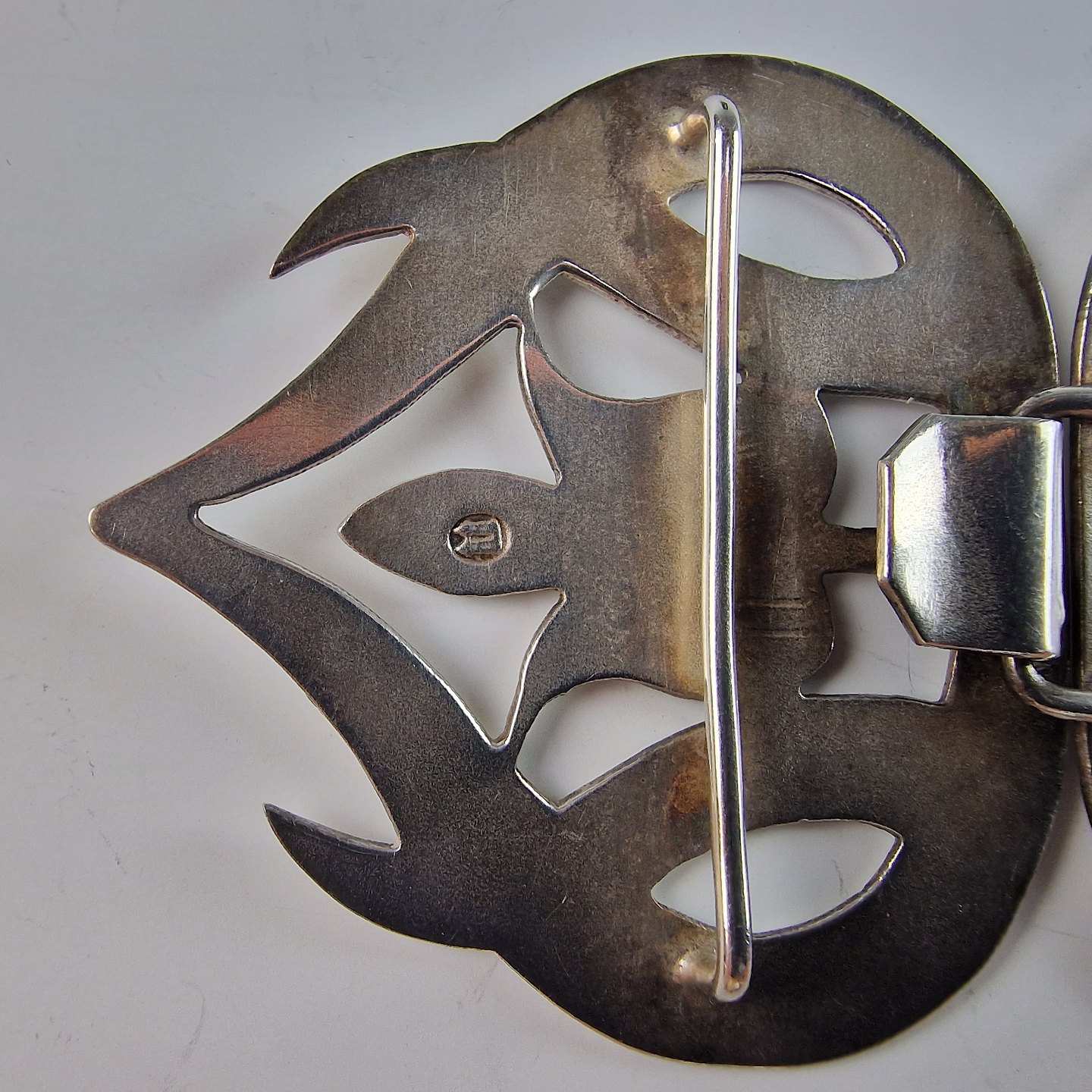 Bæltespænde i to tårnet sølv med motiv af tulipanblomster og graveret mønster