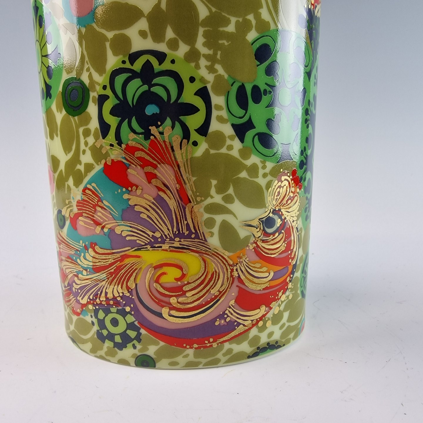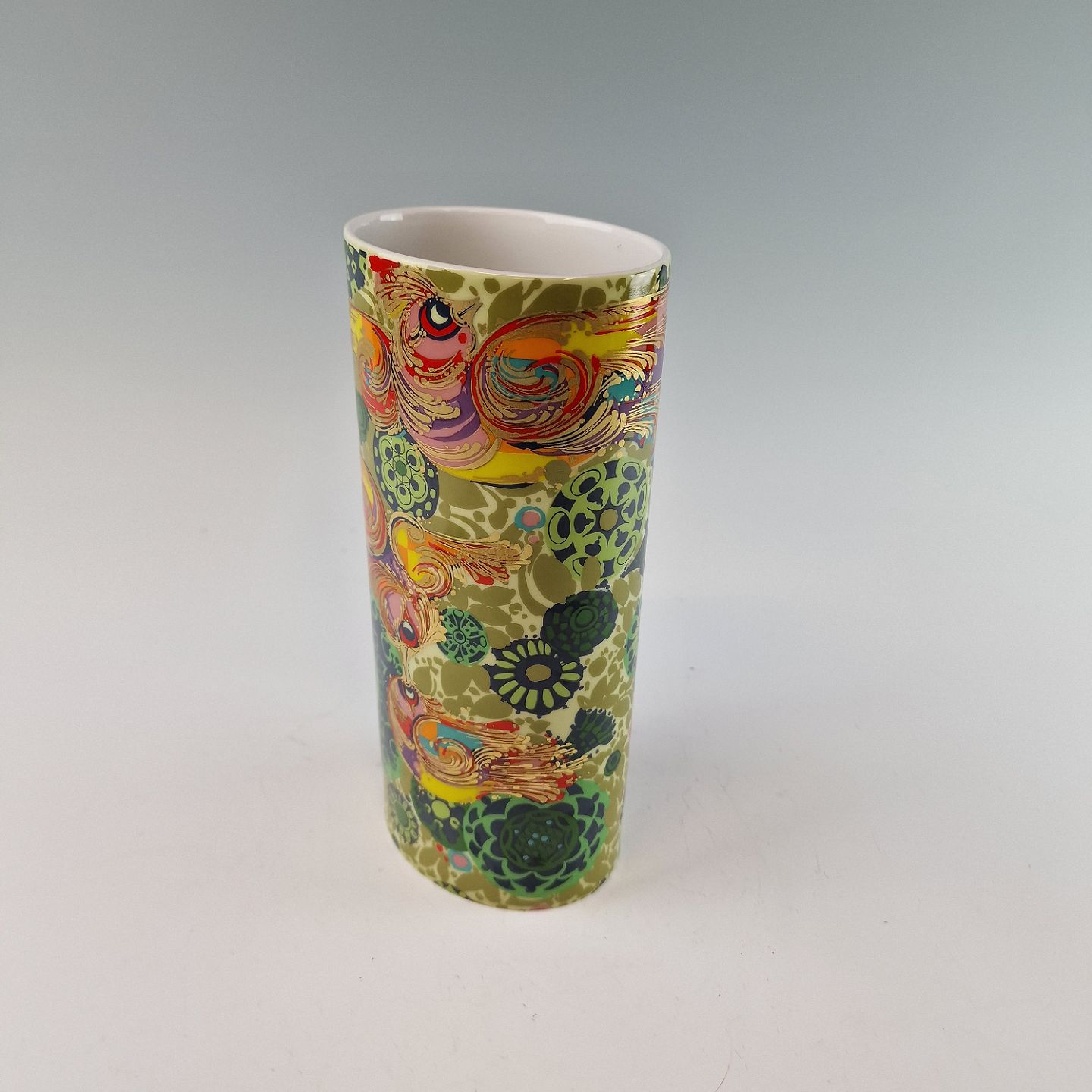 Oval porcelænsvase dekoreret med mange farver, mønstre og føniks fugle
