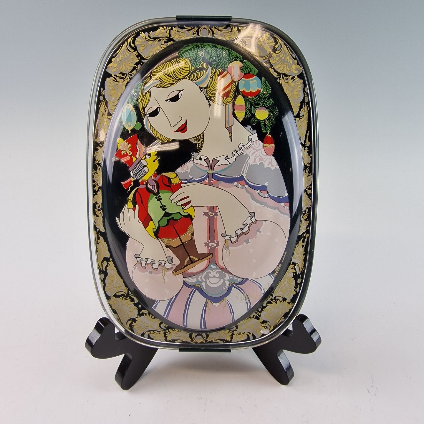 Sjælden glasplatte-serie lagt i farver under beskyttende metalbaggrund. Forestiller eventyret "Nøddeknækkeren" hvor Clara sidder med nøddeknækkeren