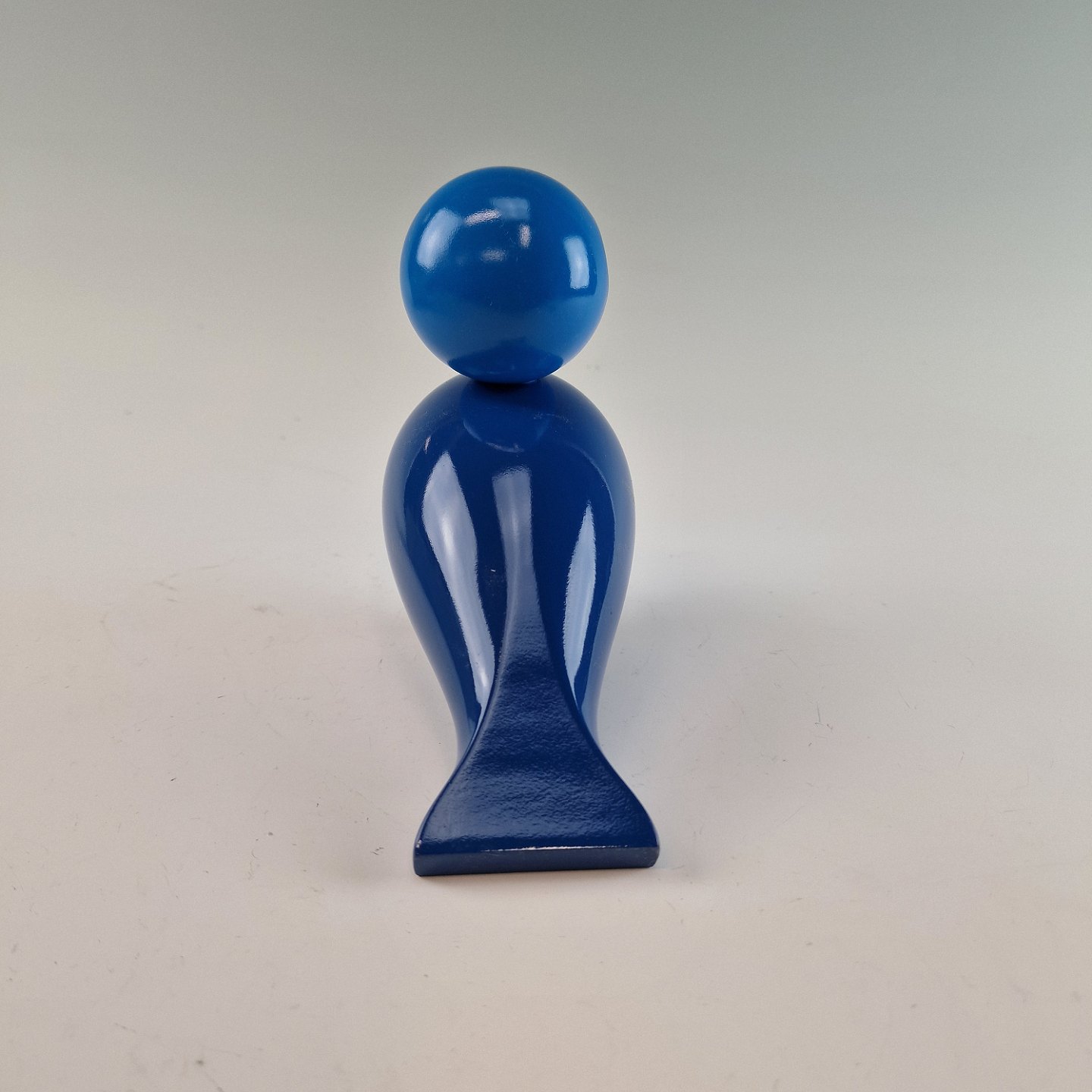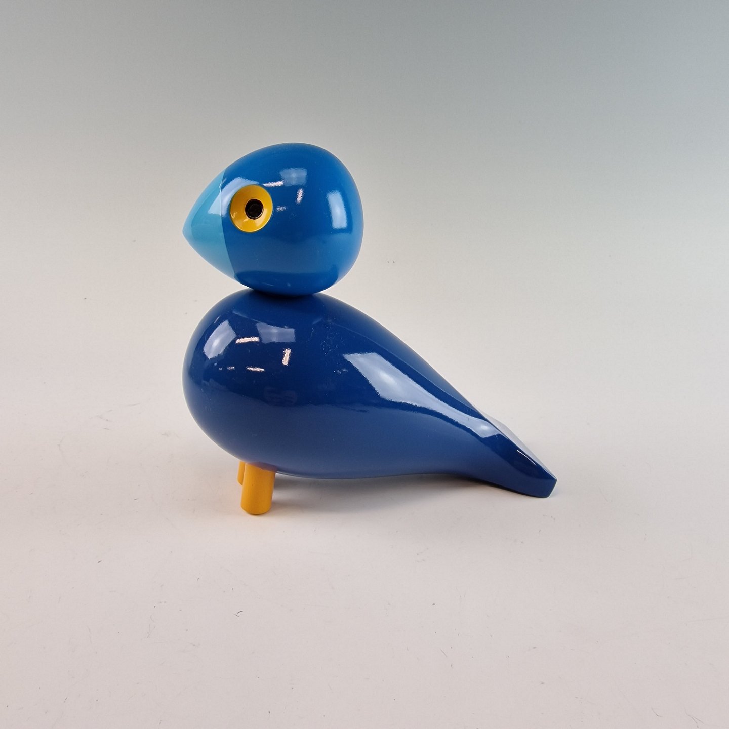 Figur af bøgetræ fra serien Sangfugl. Sangfuglen Kay er blå med lys blå næb og orange ben.