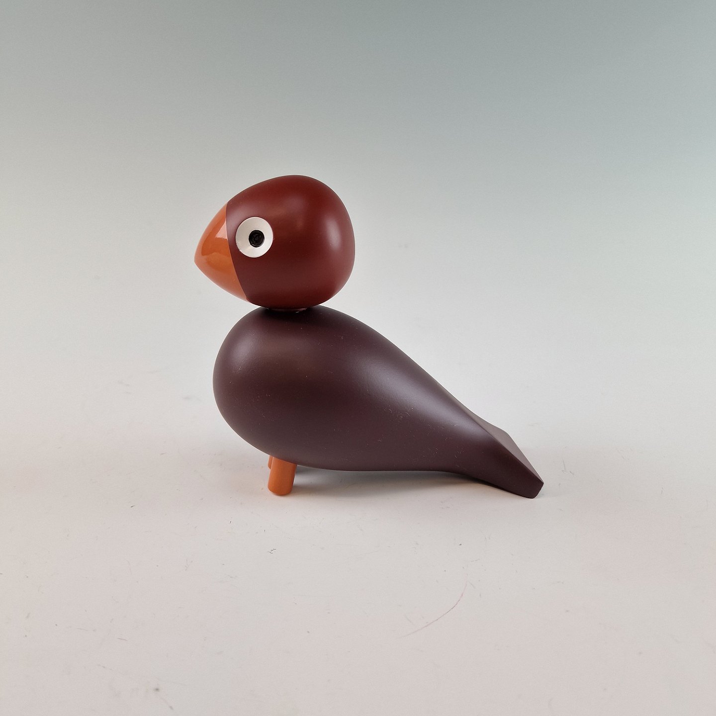 Figur i malet bøg fra serien Sangfugl. Poppy er vinrød med orange næb og ben. Årets sangfugl 2022