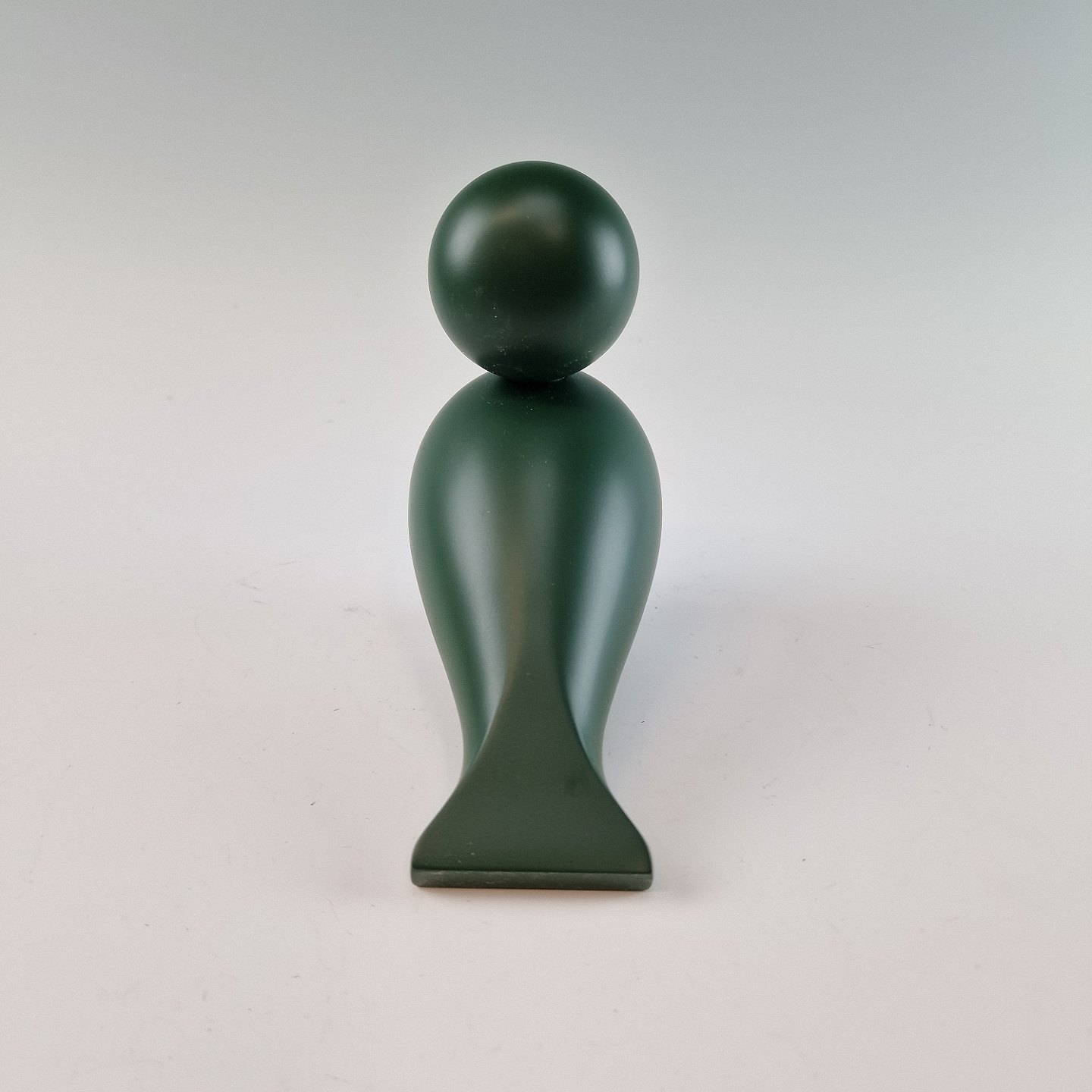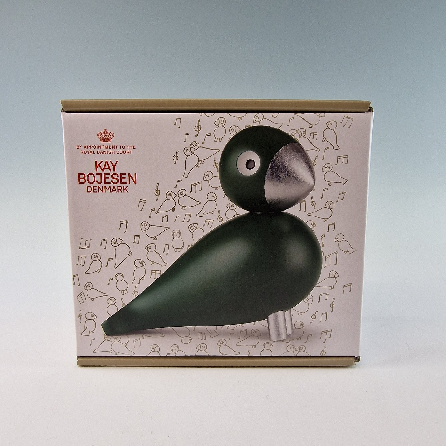 Figur af malet bøgetræ fra serien Sangfugl. Georg er mørk grøn med ben og næb beklædt med bladsølv.