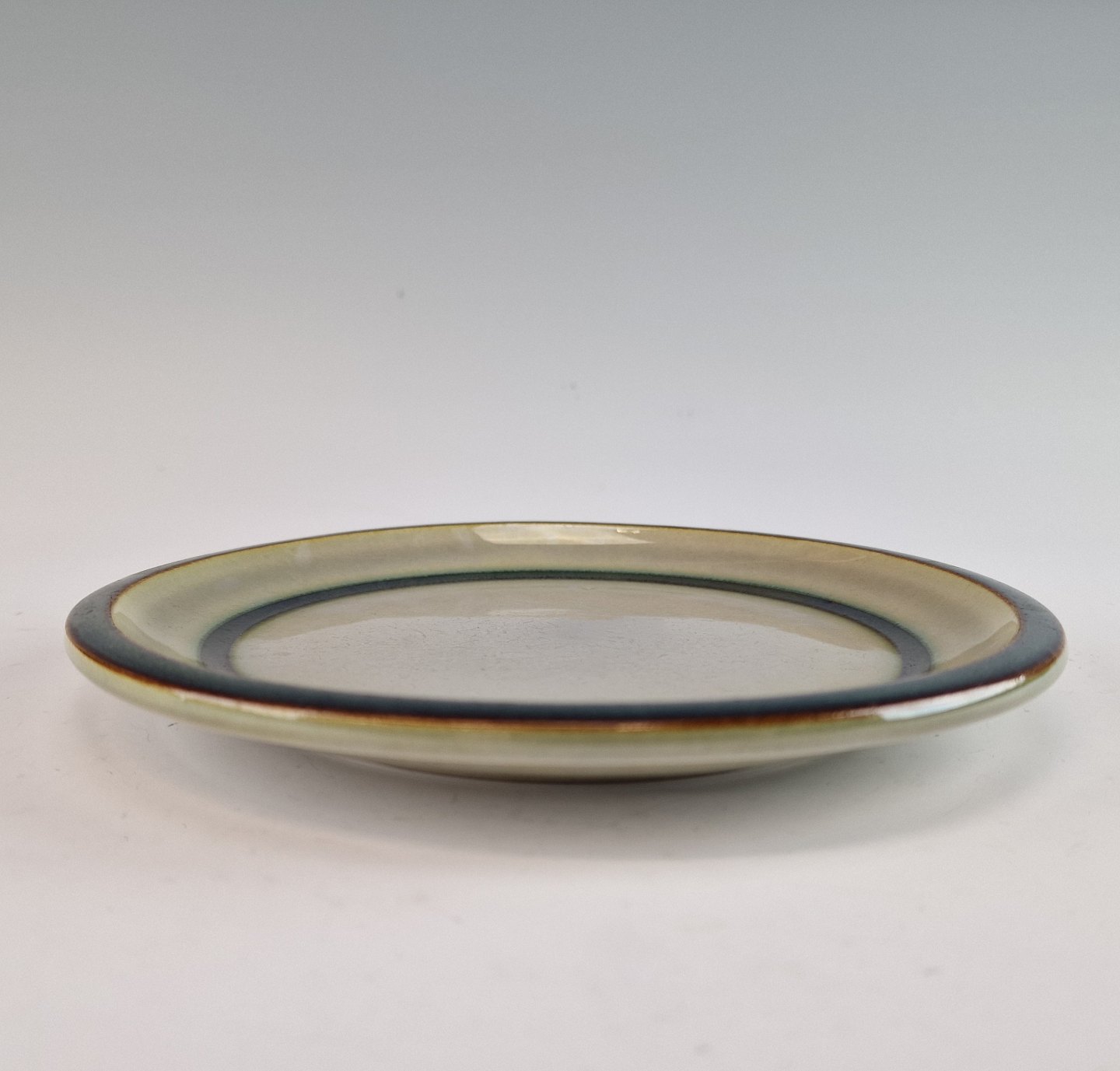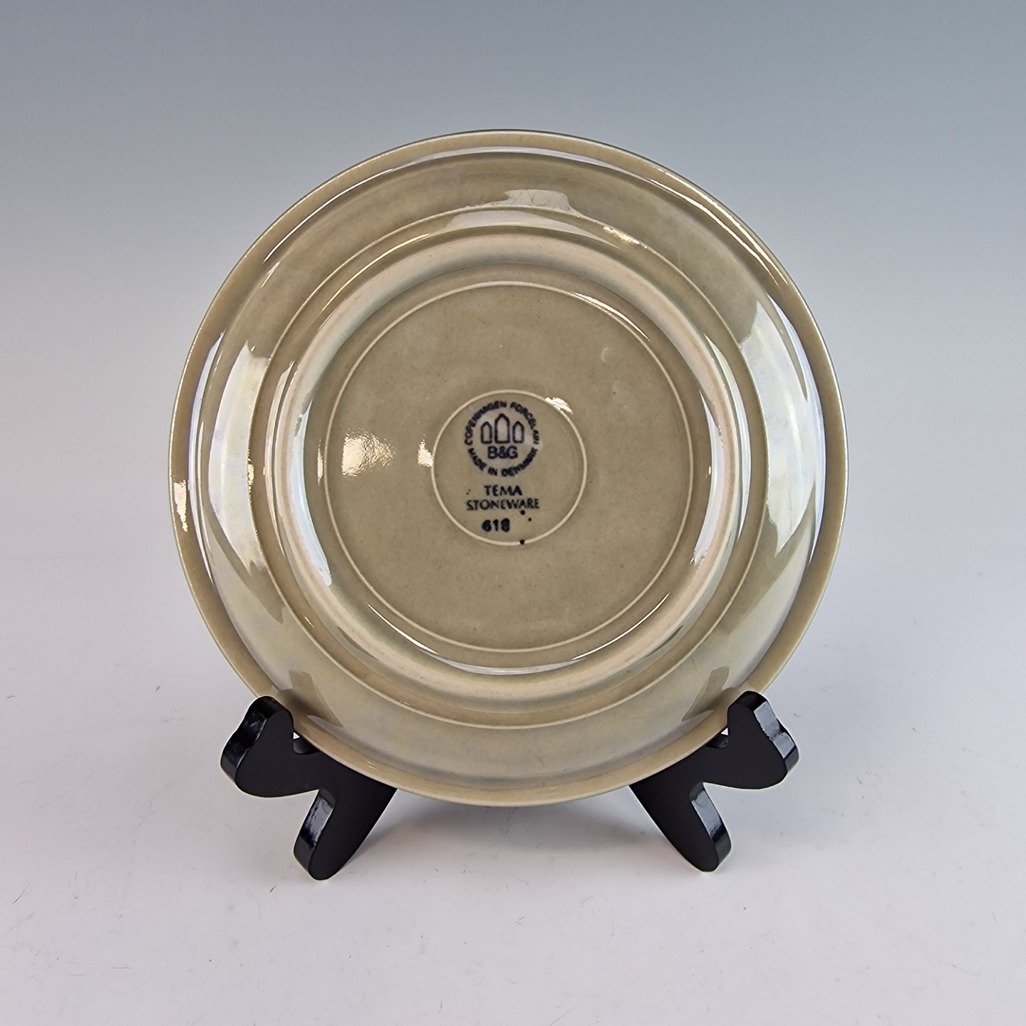 Stellet Tema er af stentøj, glaseret med lys grå og dekoreret med kanter af grønne og brune farver