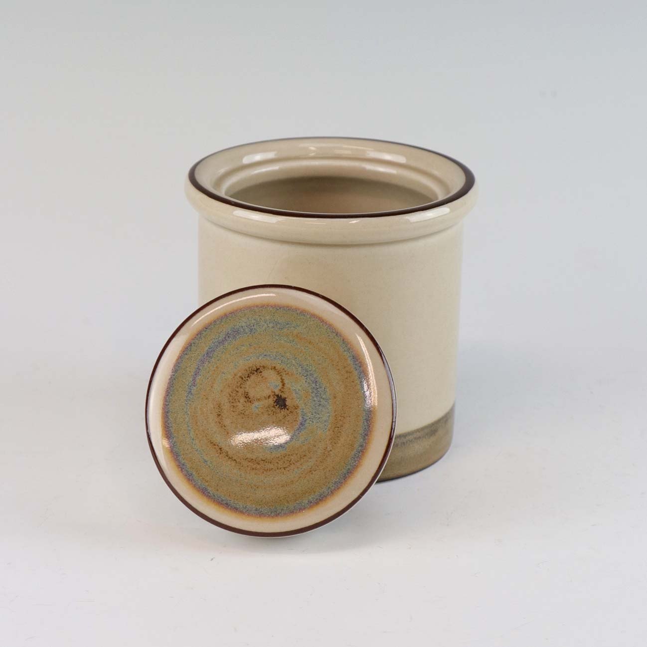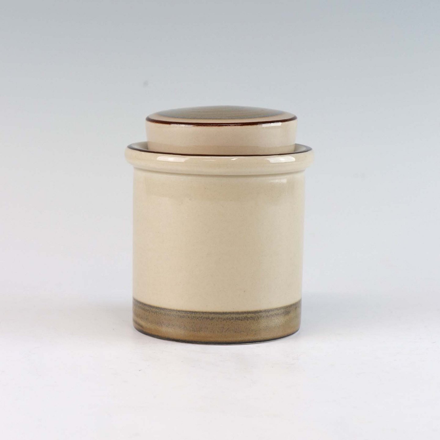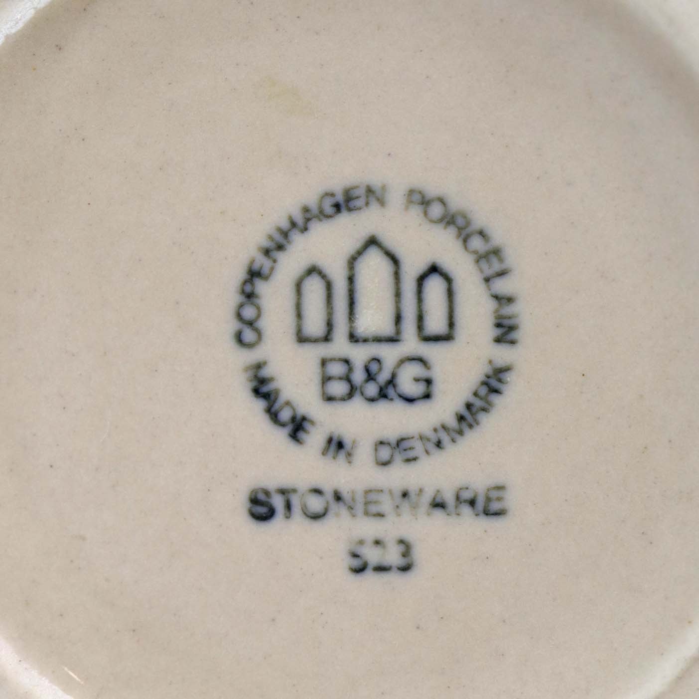 Stellet Peru er af stentøj, glaseret med lys grå farve og dekoreret med bånd af grøn/brunlige farve