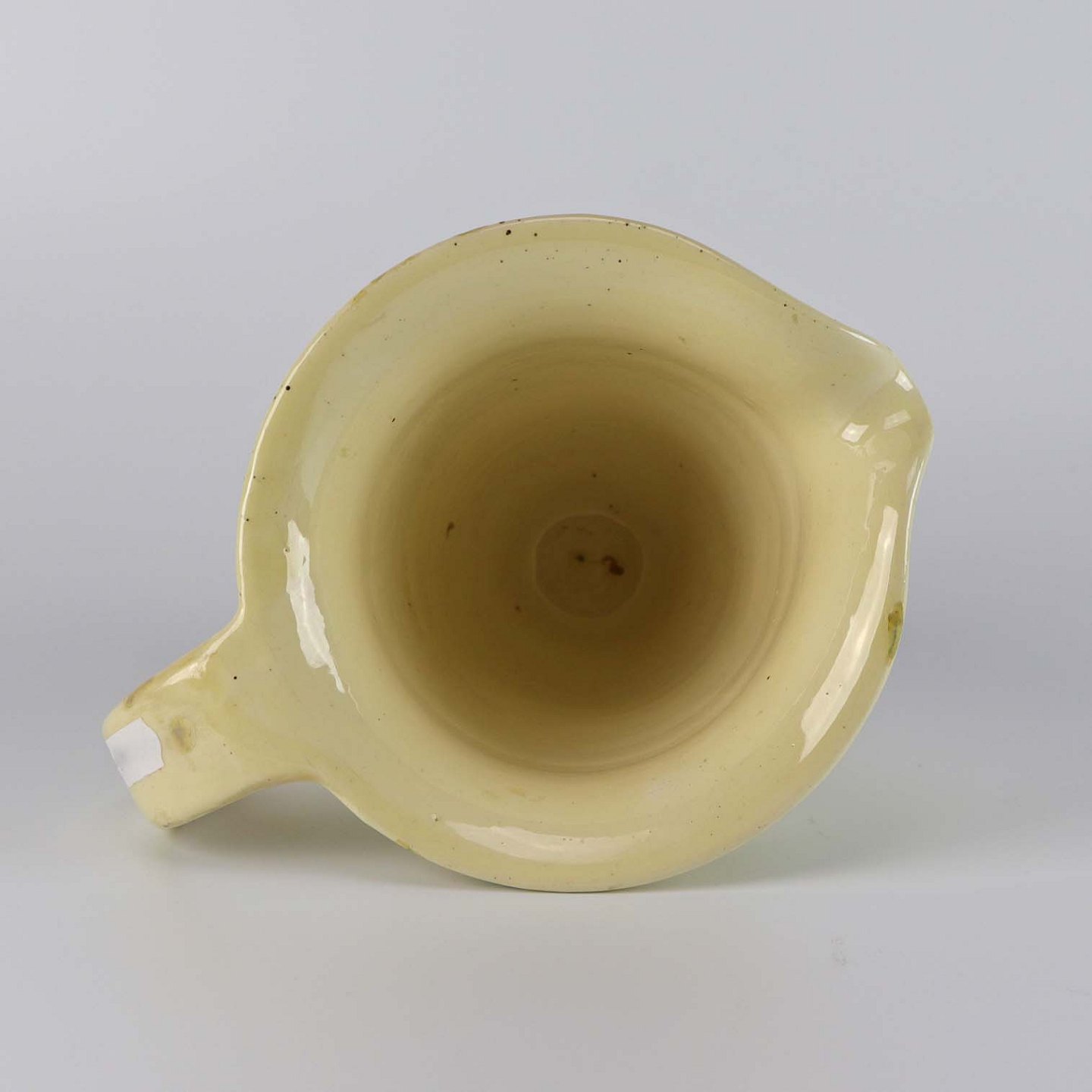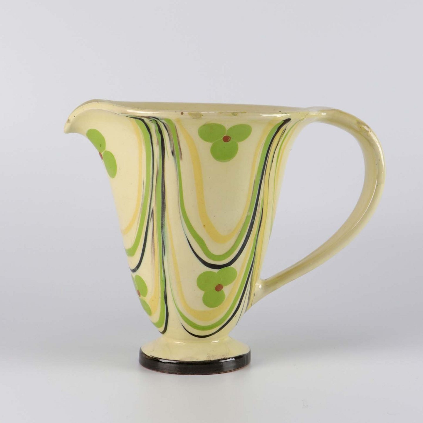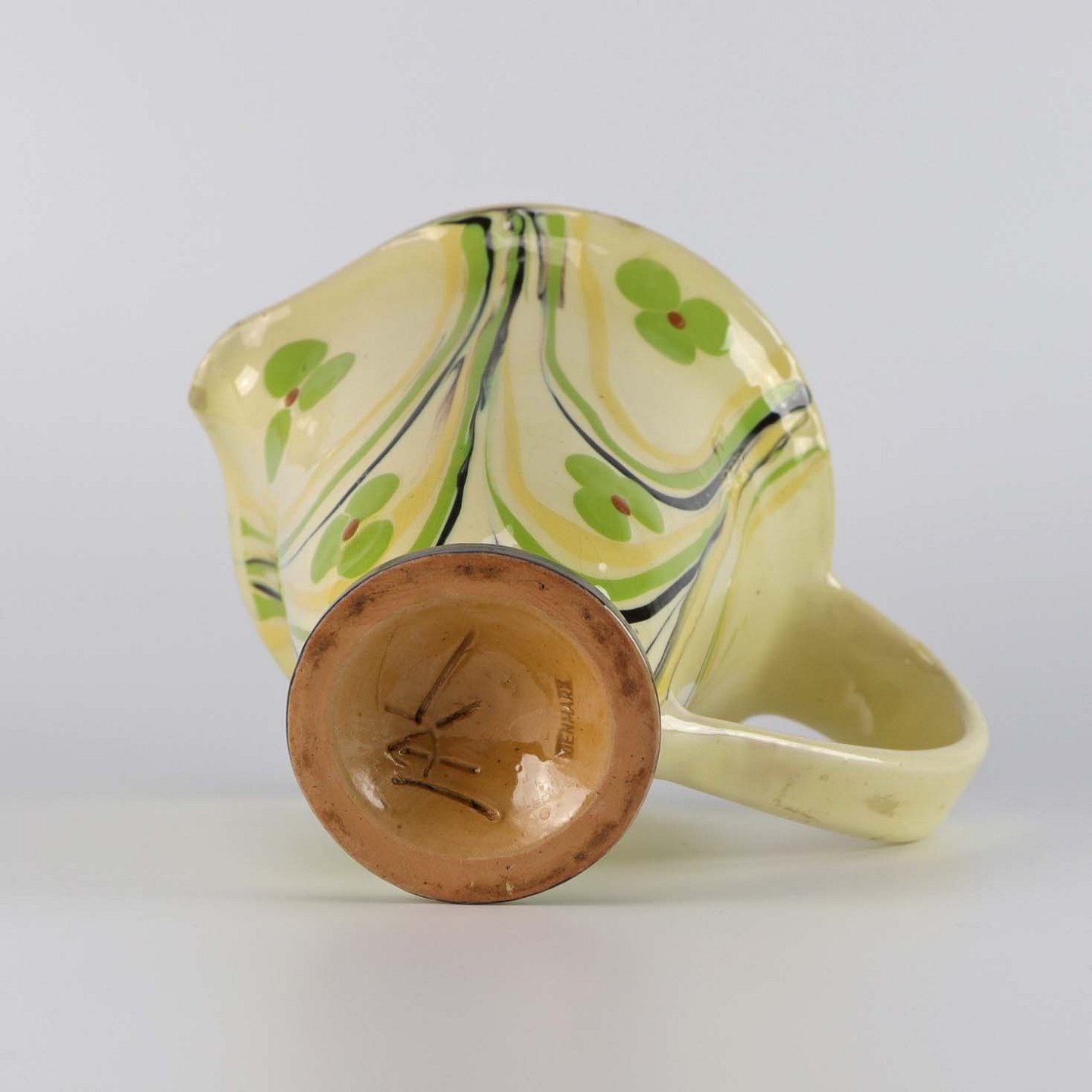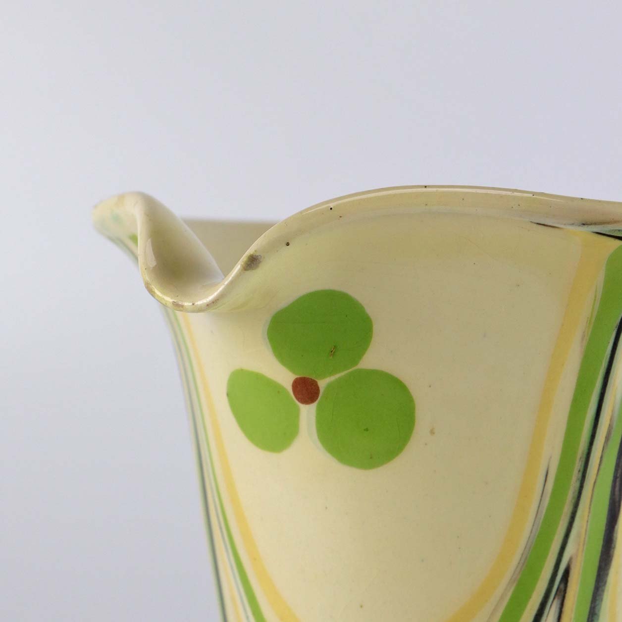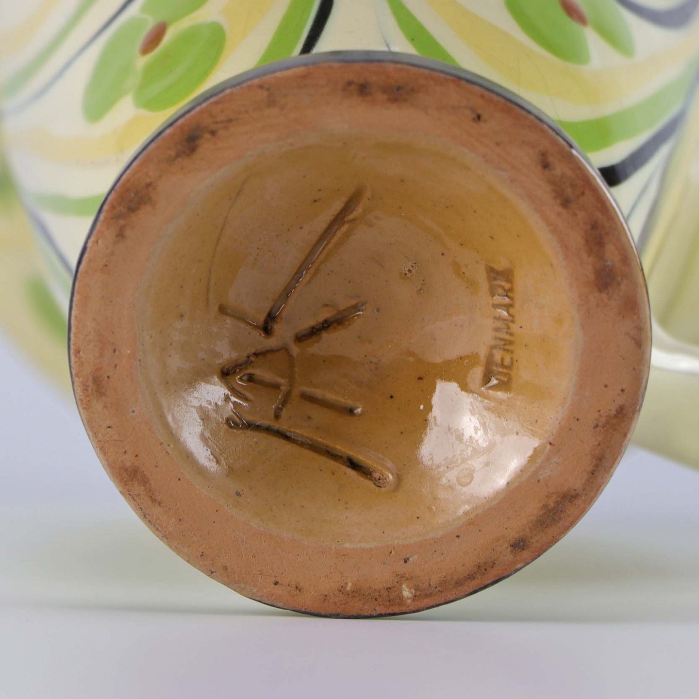 Kande af keramik i beige med mønstre i gul og grønne farver