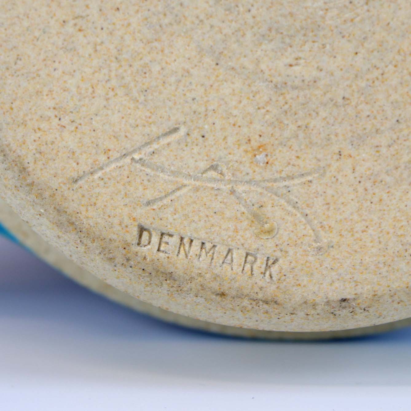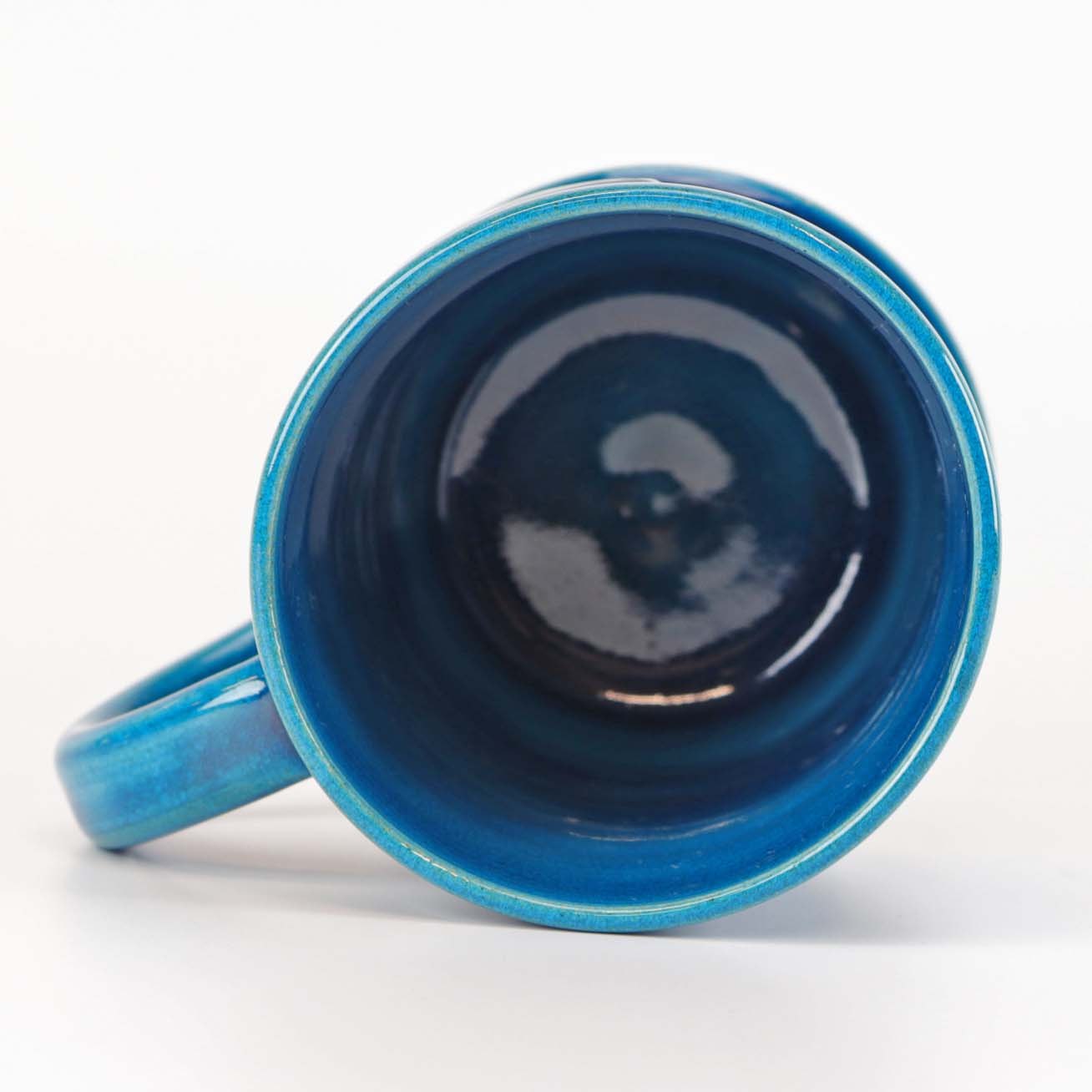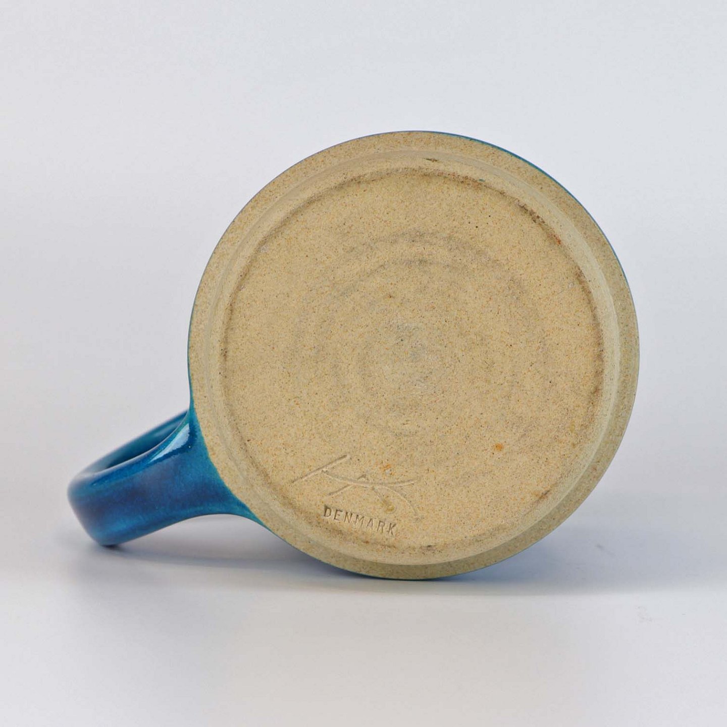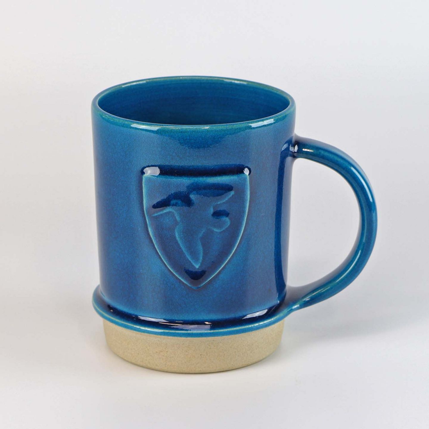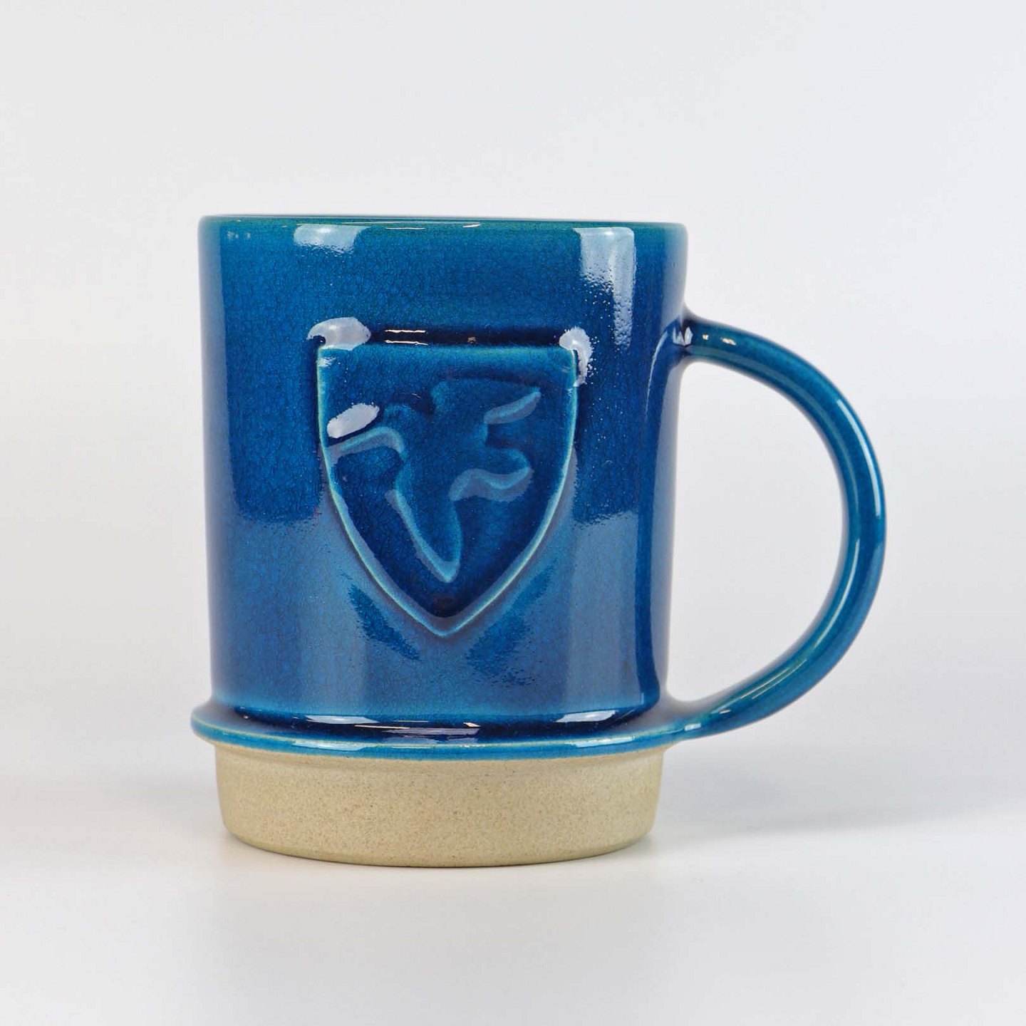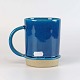 Krus med hank af glaseret keramik. Kruset er blåt med et segl hvori der er en fugl