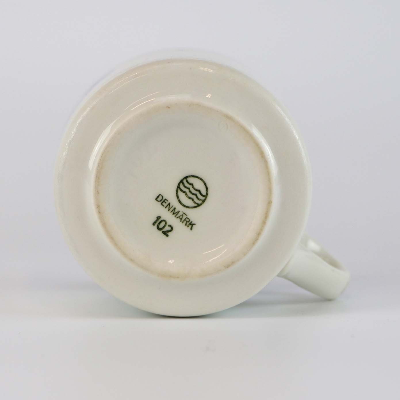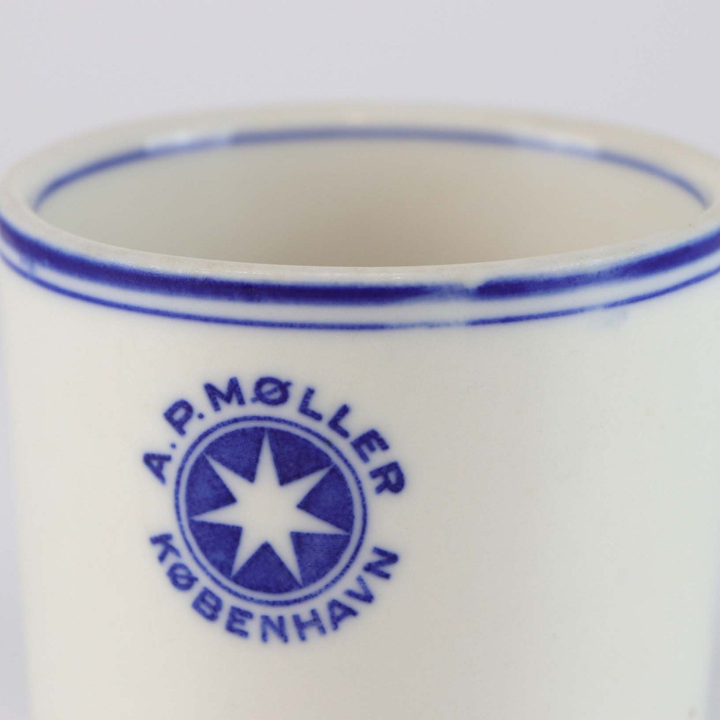 Krus af kraftigt porcelæn med teksten A.P. Møller København. No 102