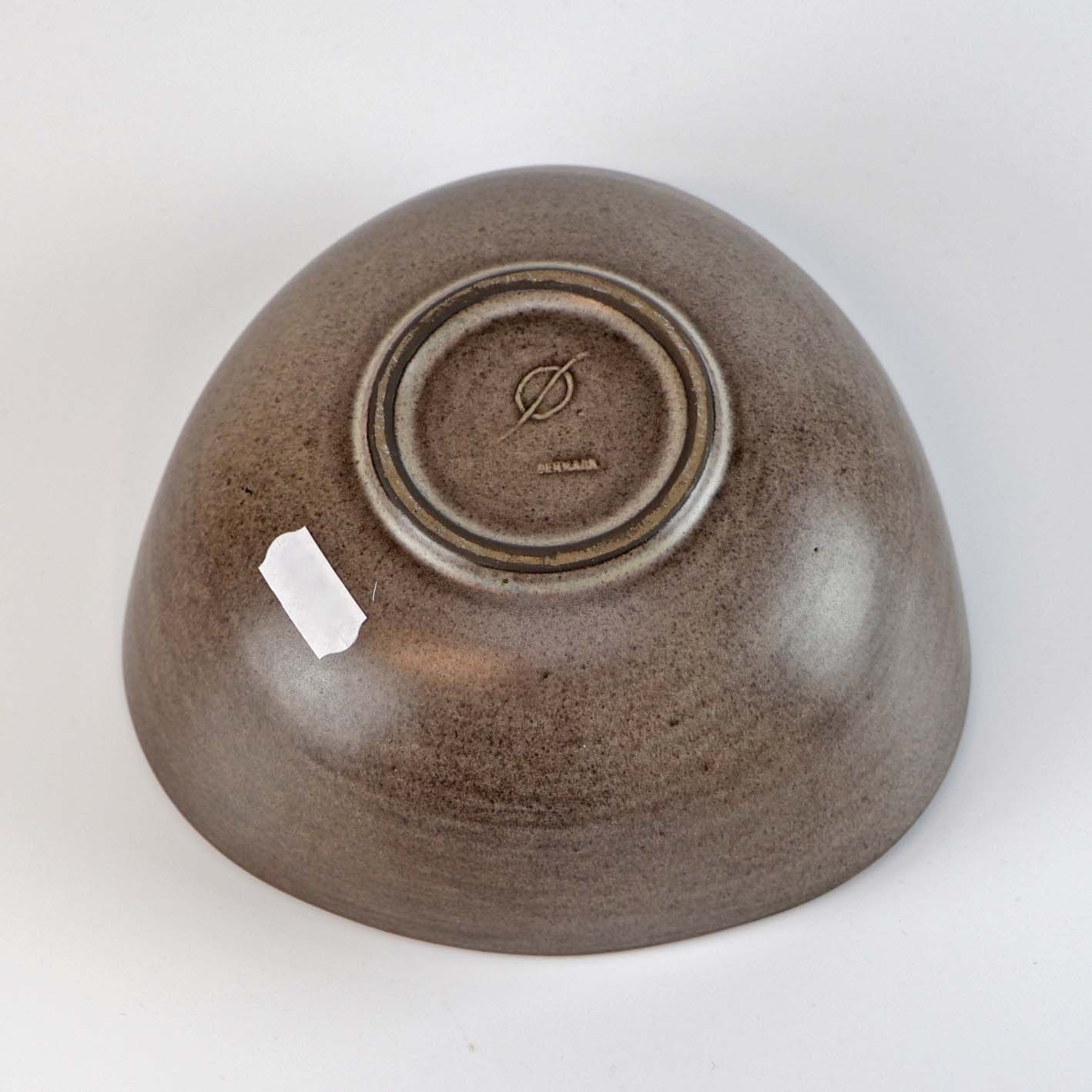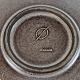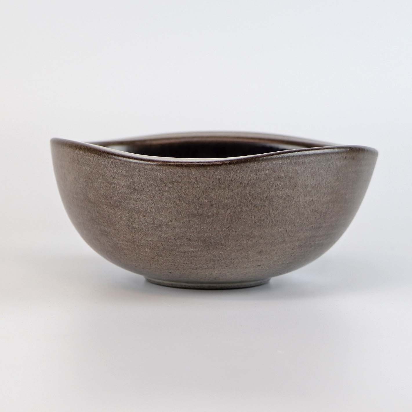 Trekantet keramikskål, brunmeleret udvendigt og blå indvendigt