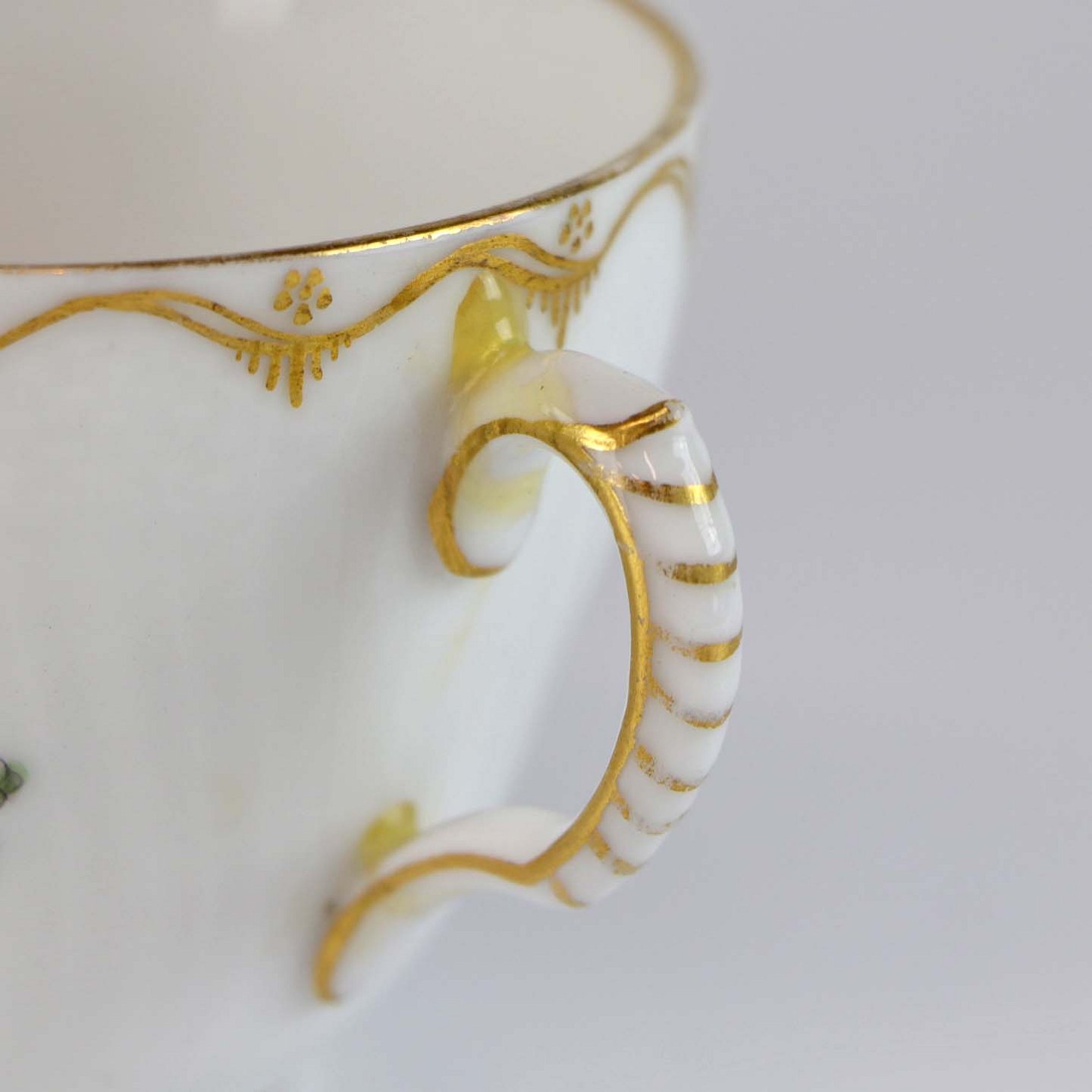Antik kop og underkop i svejfet hvidt porcelæn med motiv af grønne blomster og blade