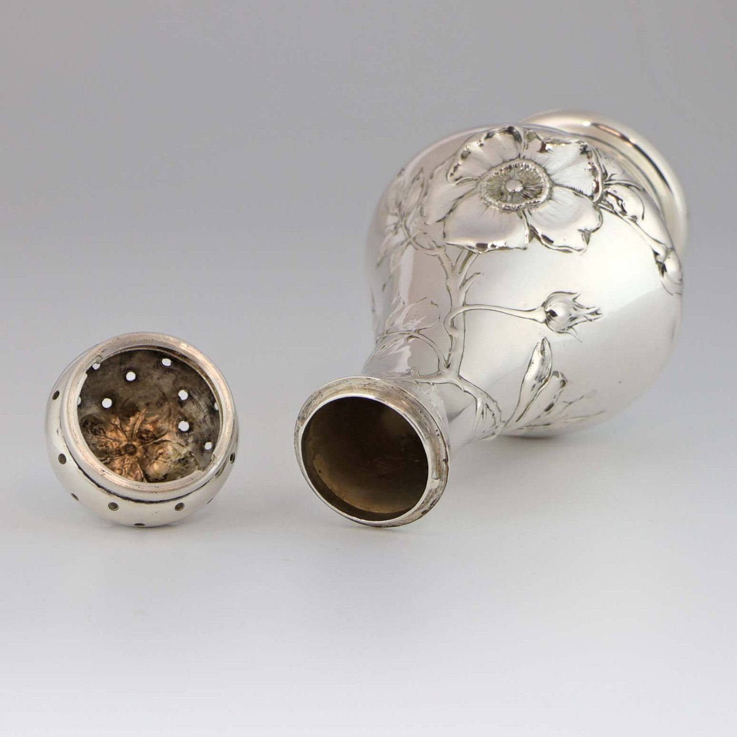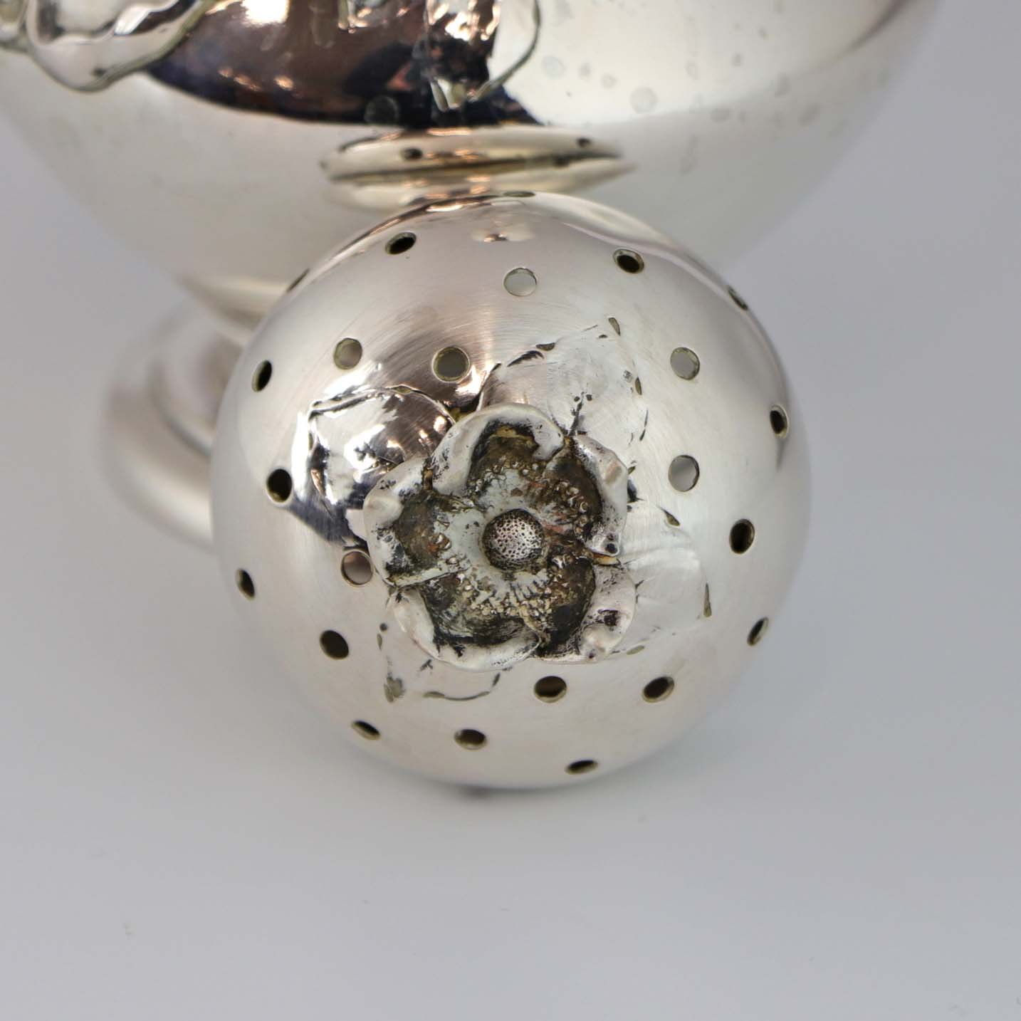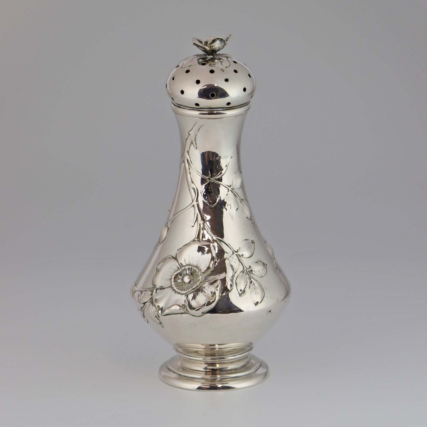 Sukkerstrø af tretårnet sølv dekoreret med blomster og blade