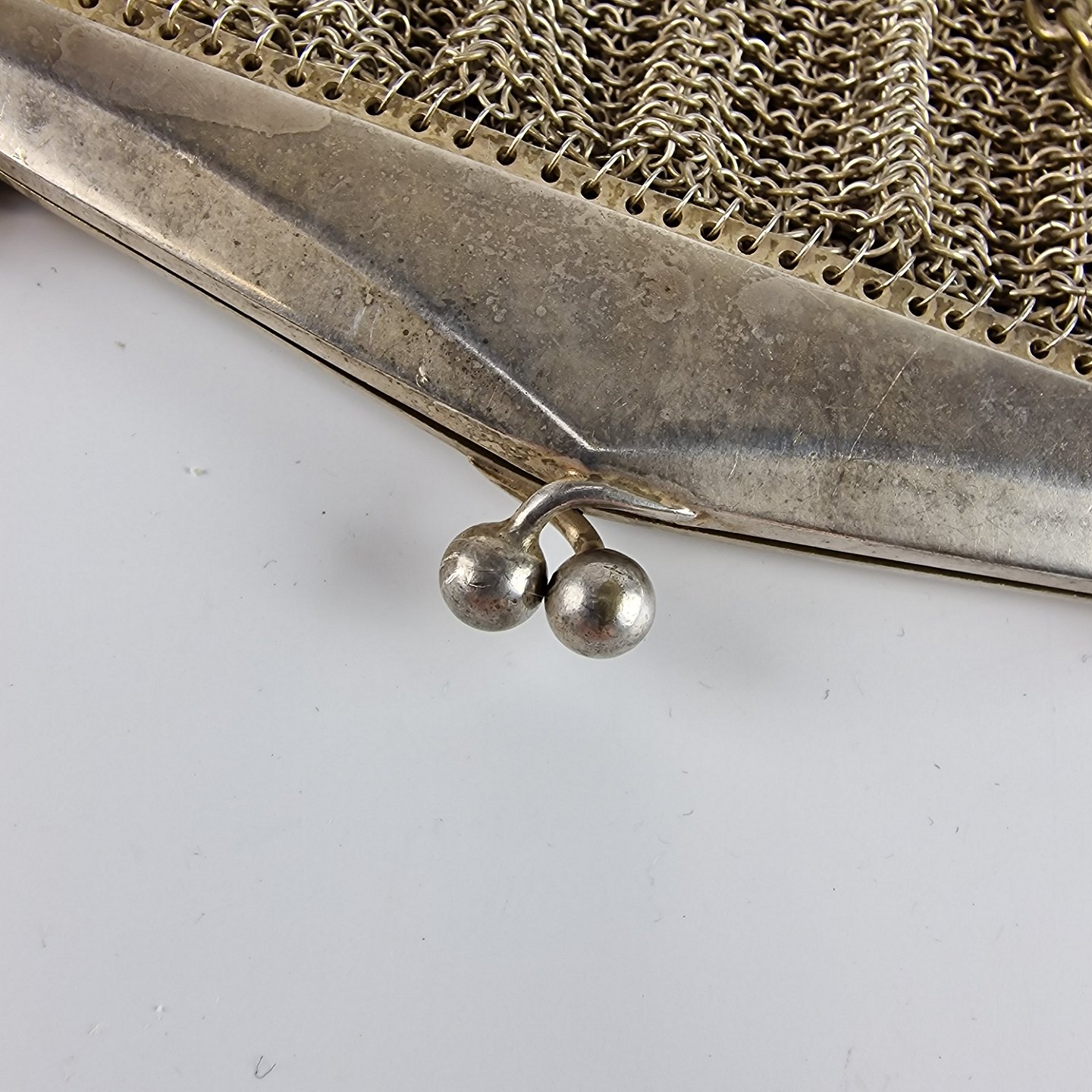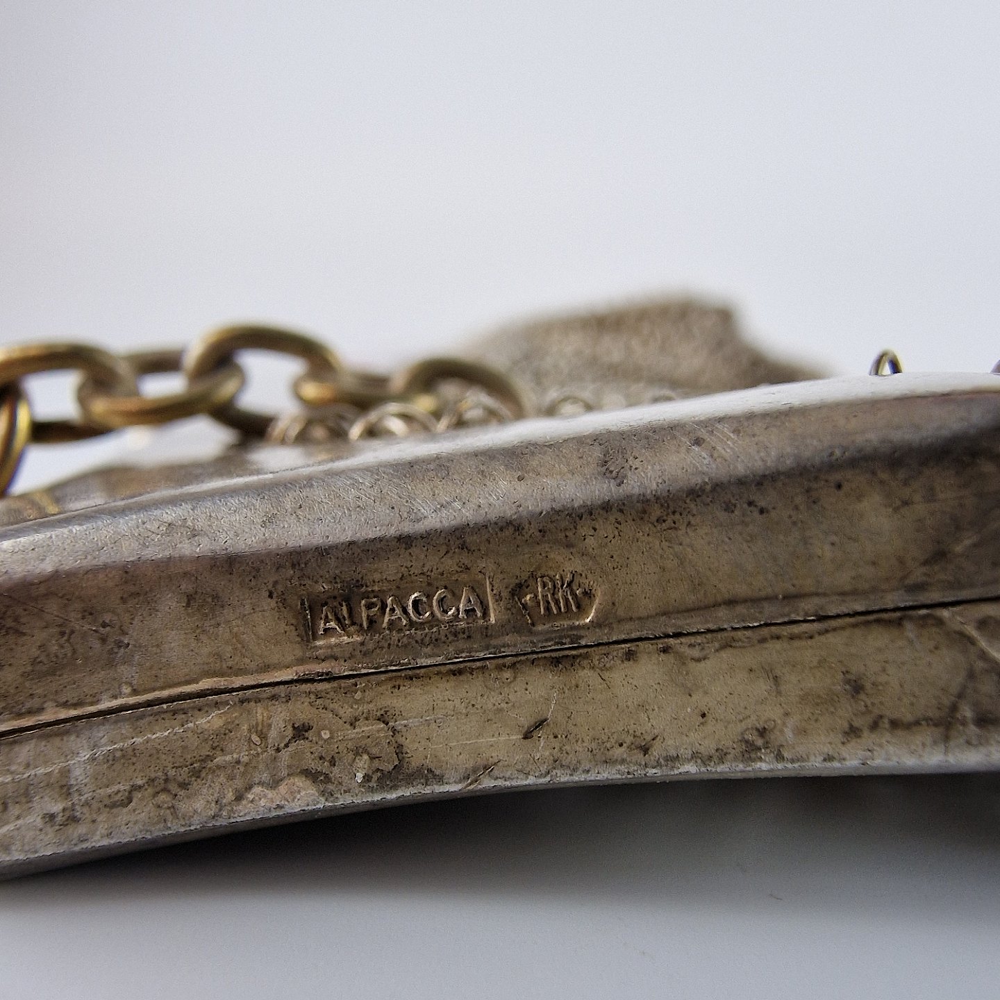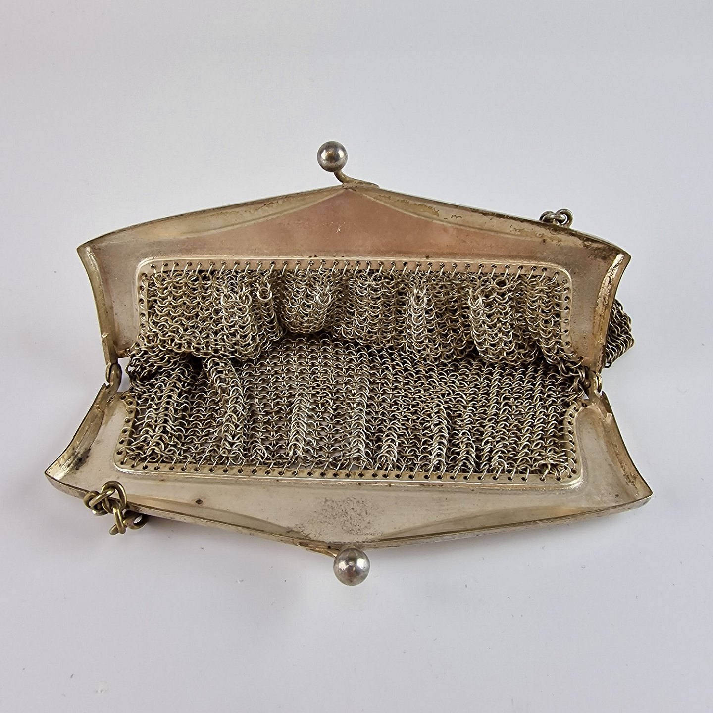 Aftentaske med kort rem. Tasken er lavet af små ringe som en brynje. Stemplet Alpacca og RK