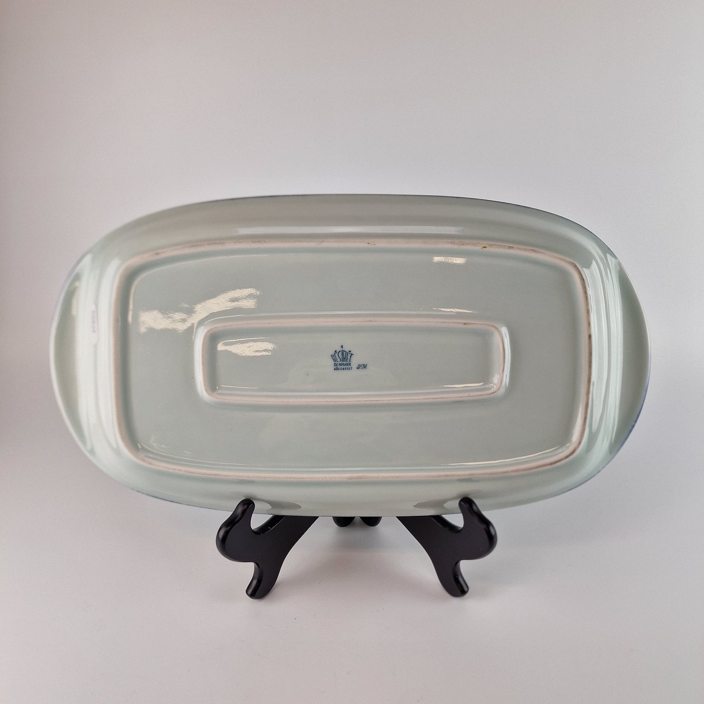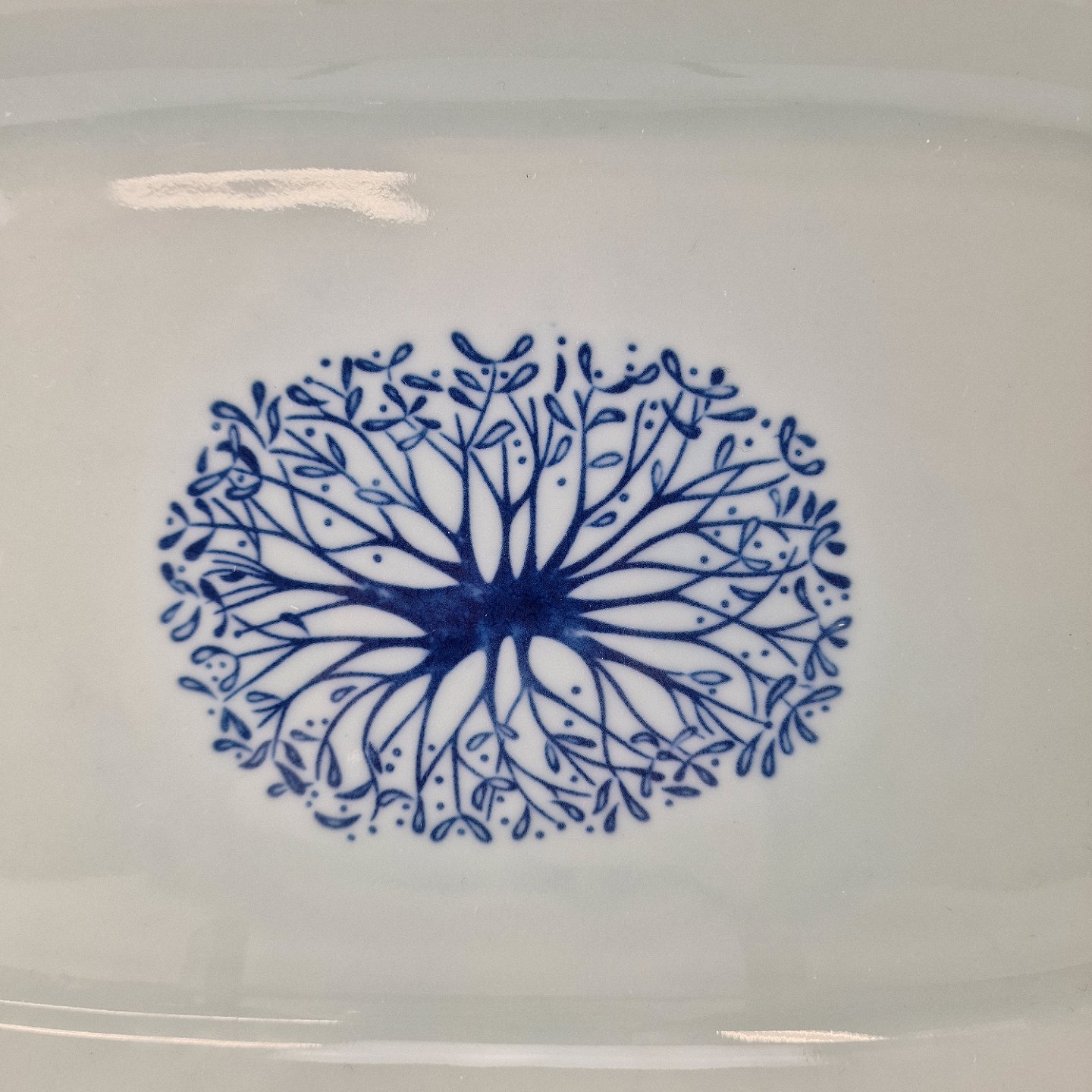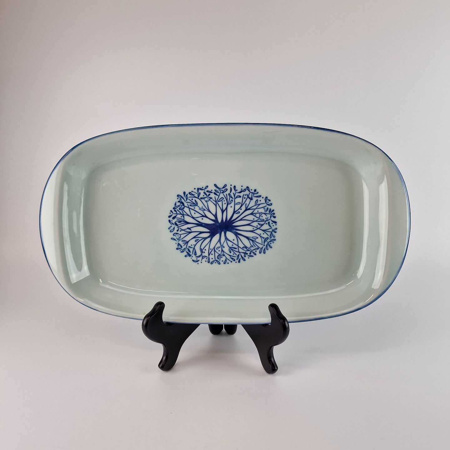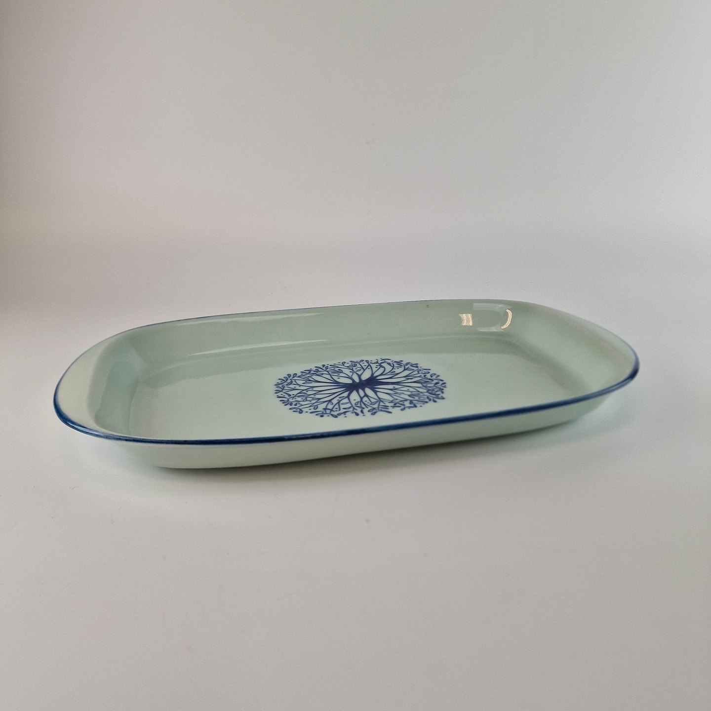 Stellets runde former er dækket med en silkeblød glasur og håndmalet med er lys almueblå farve lagt under glasuren. Stellet er ovnfast