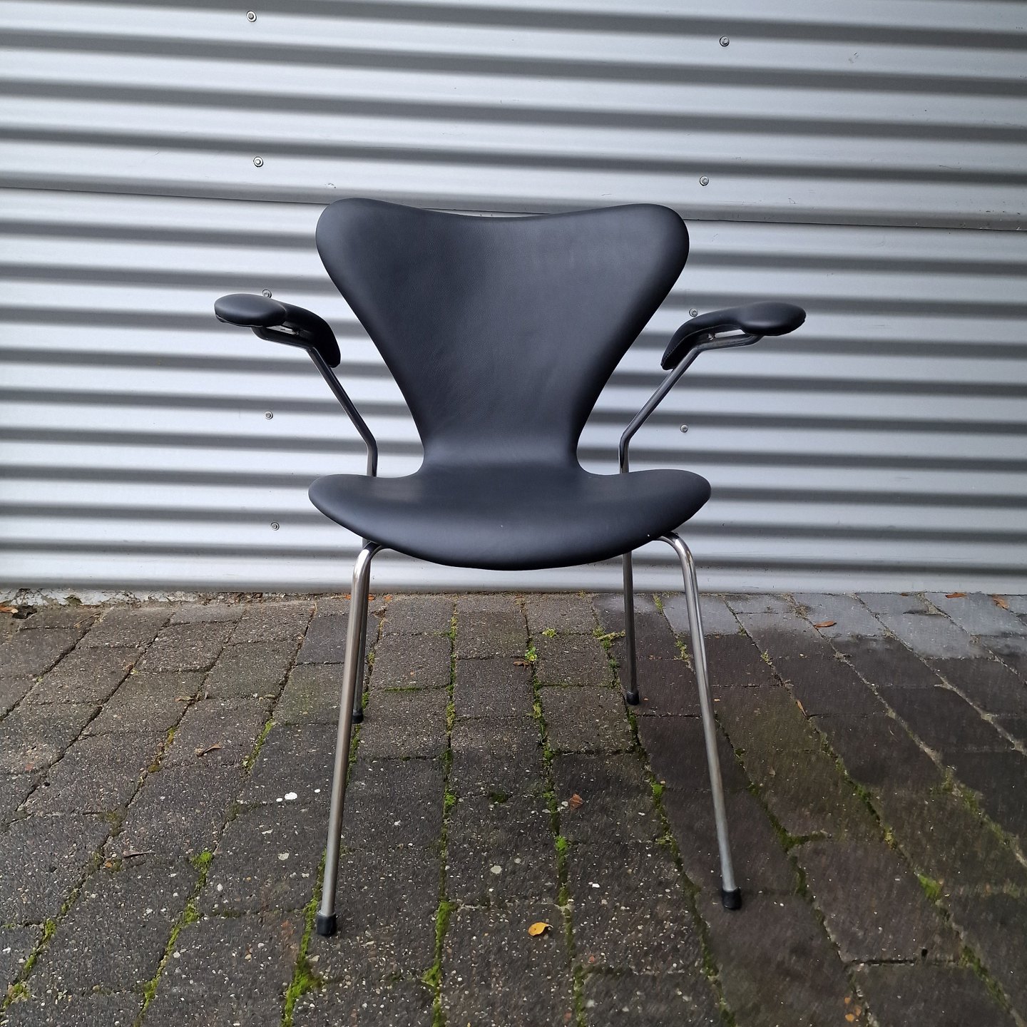 Stol i læder med metalben. 7 stol nypolstret med sort læder.