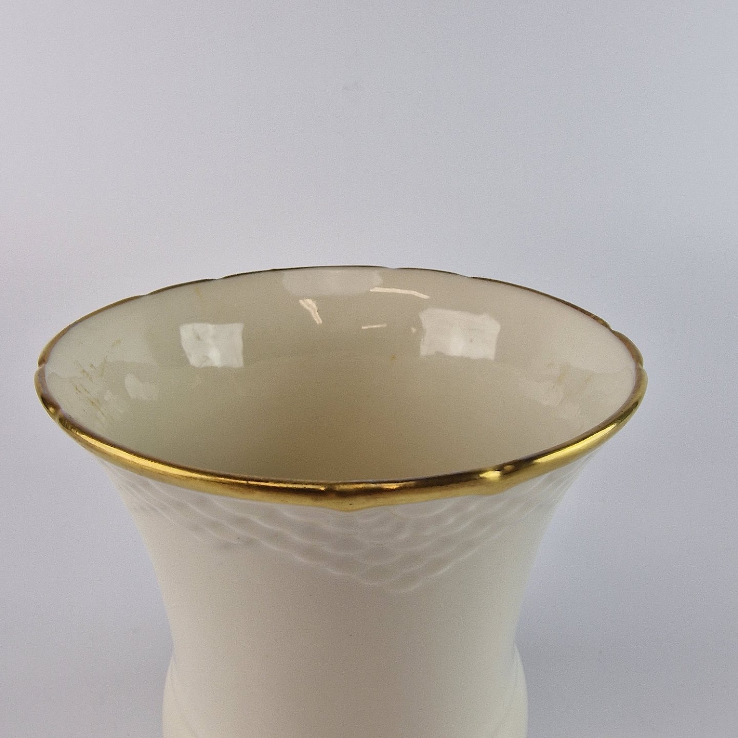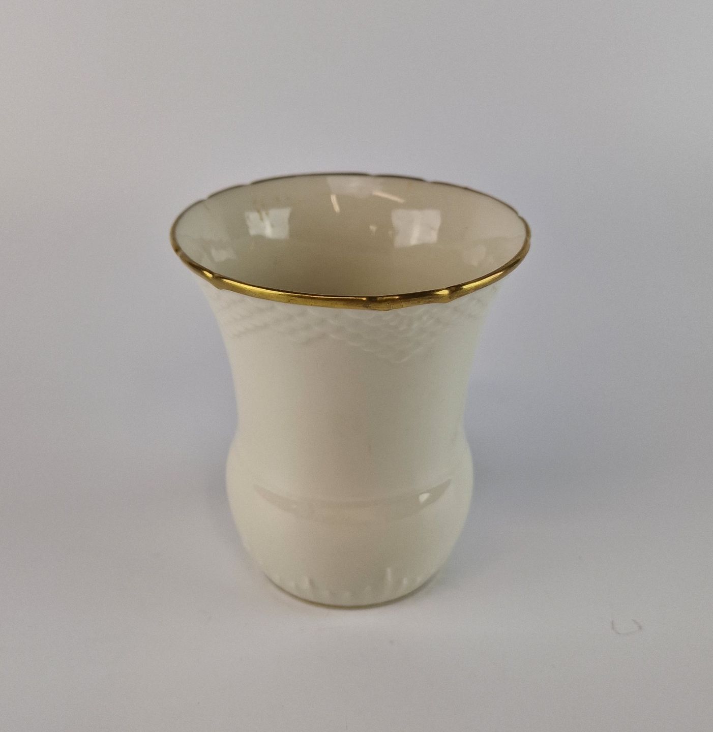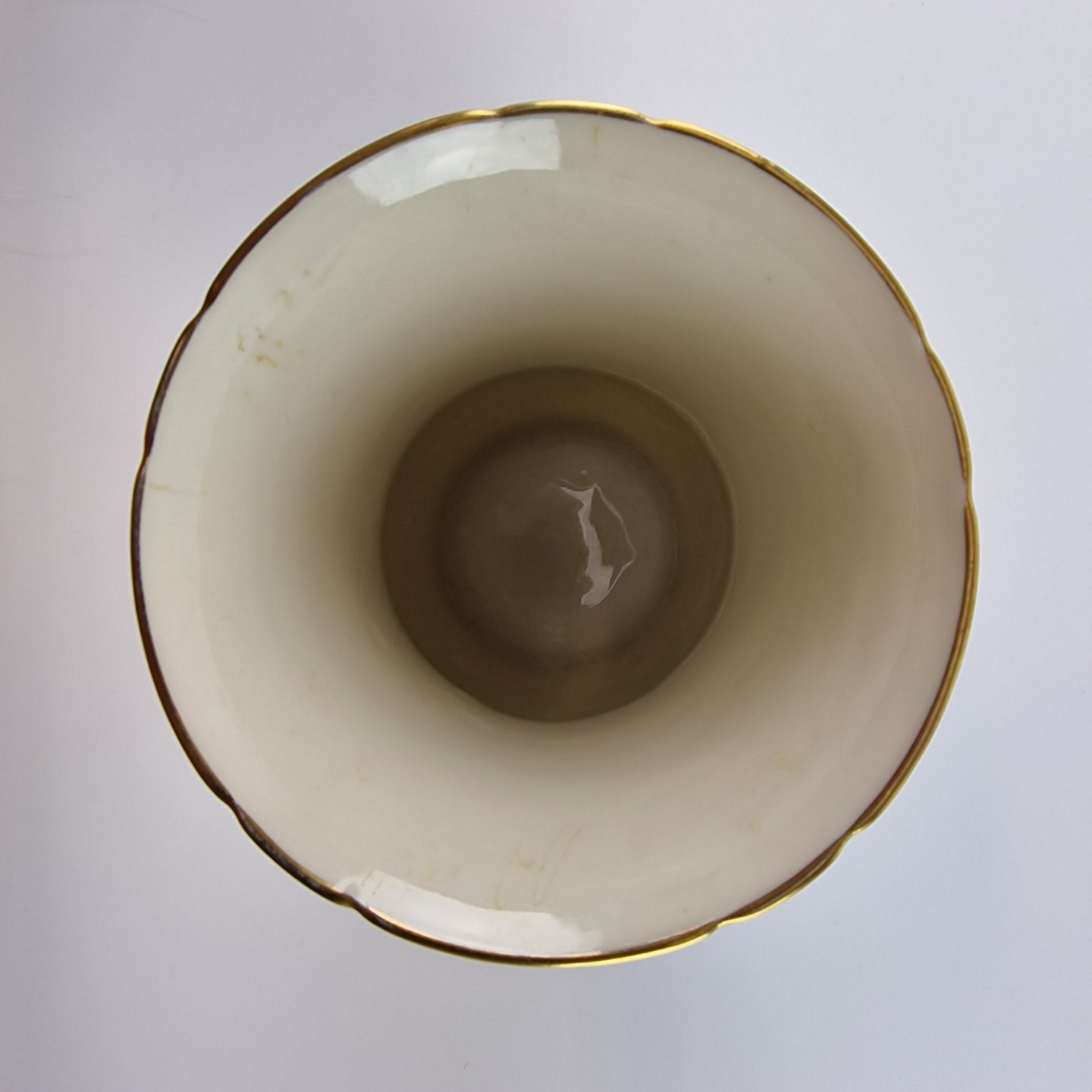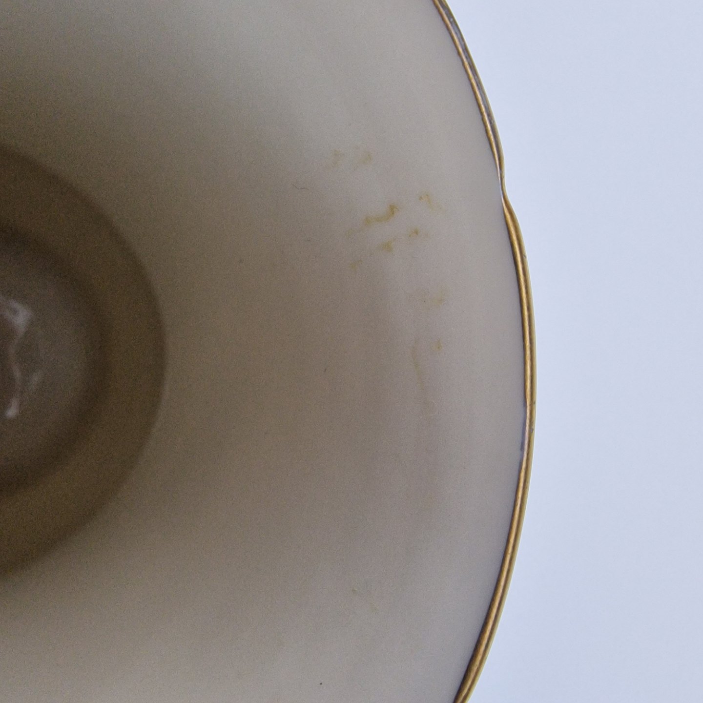 Åkjær er cremefarvet porcelæn med guldkant og mønster som ligner skæl