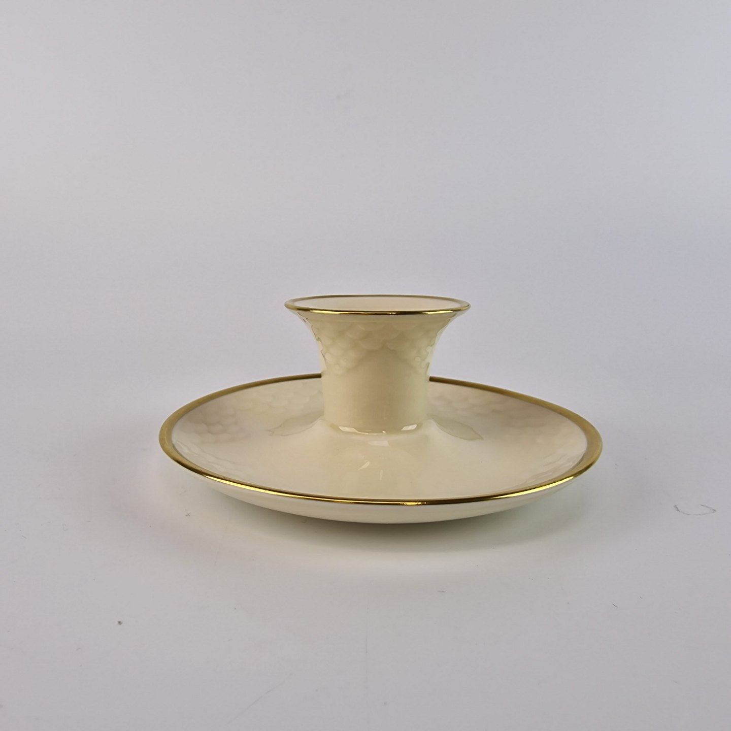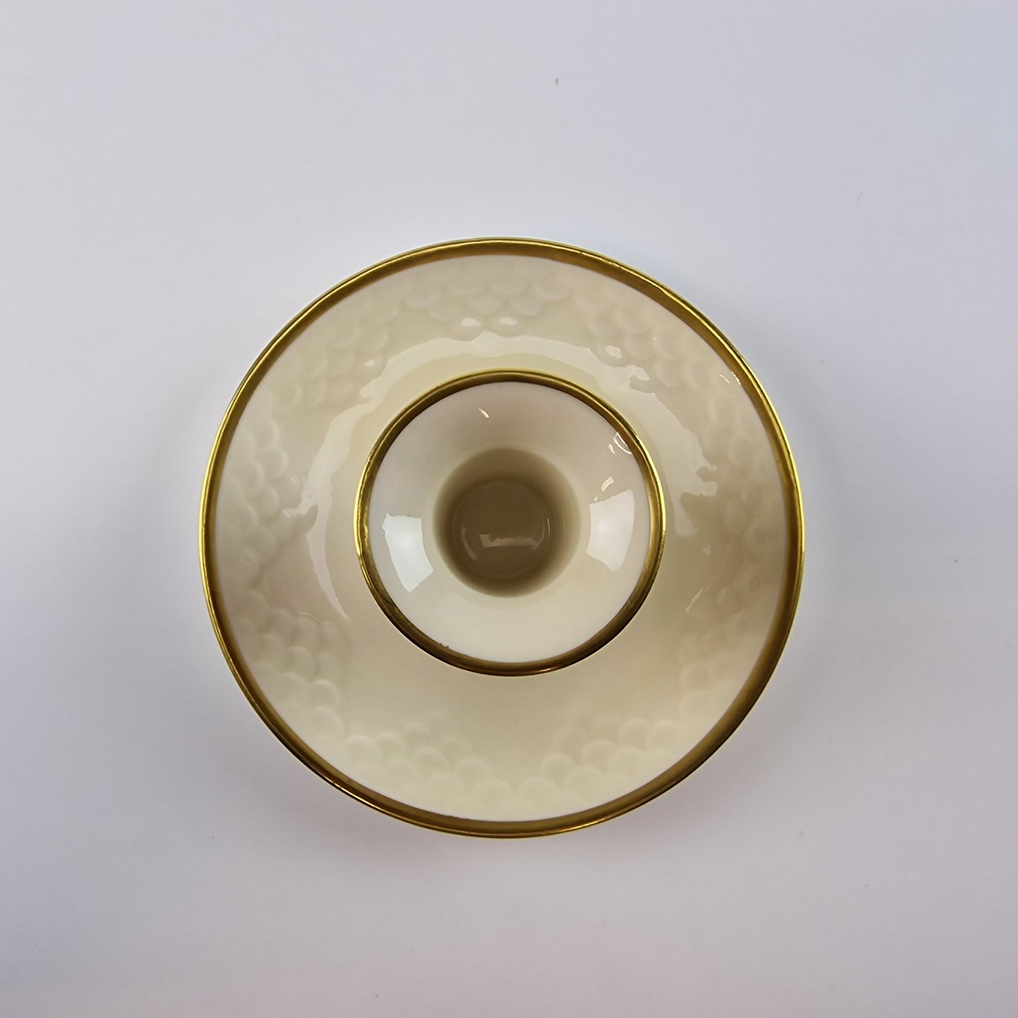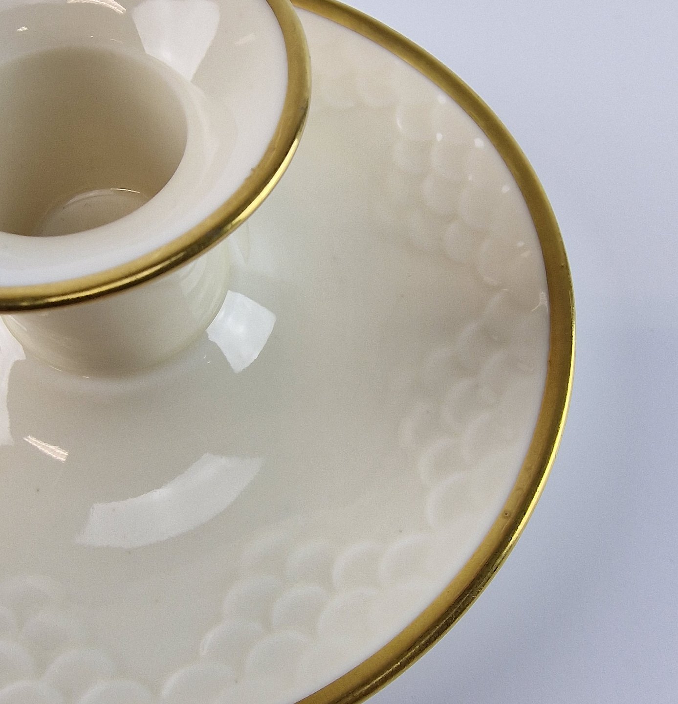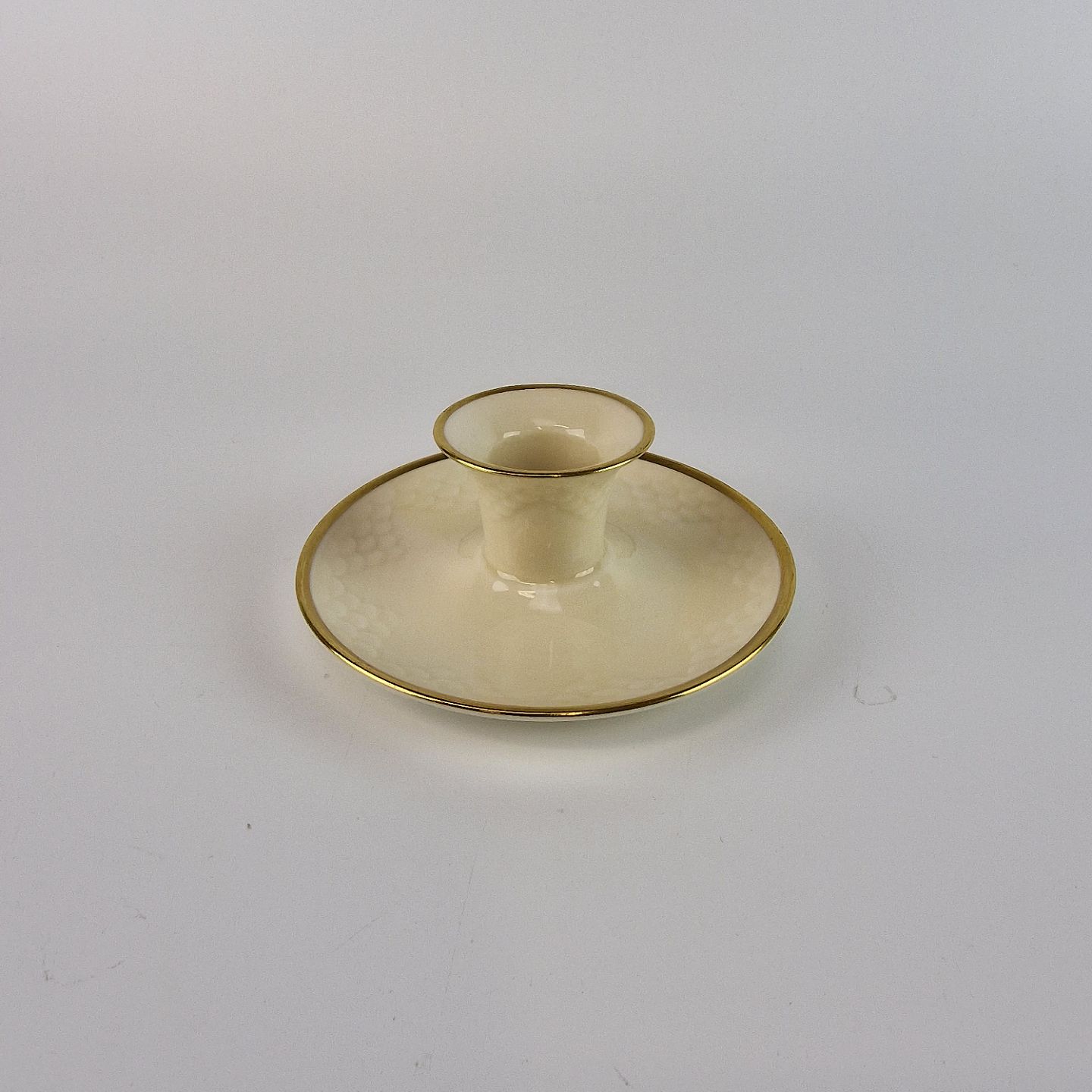 Åkjær er cremefarvet porcelæn med guldkant og mønster som ligner skæl