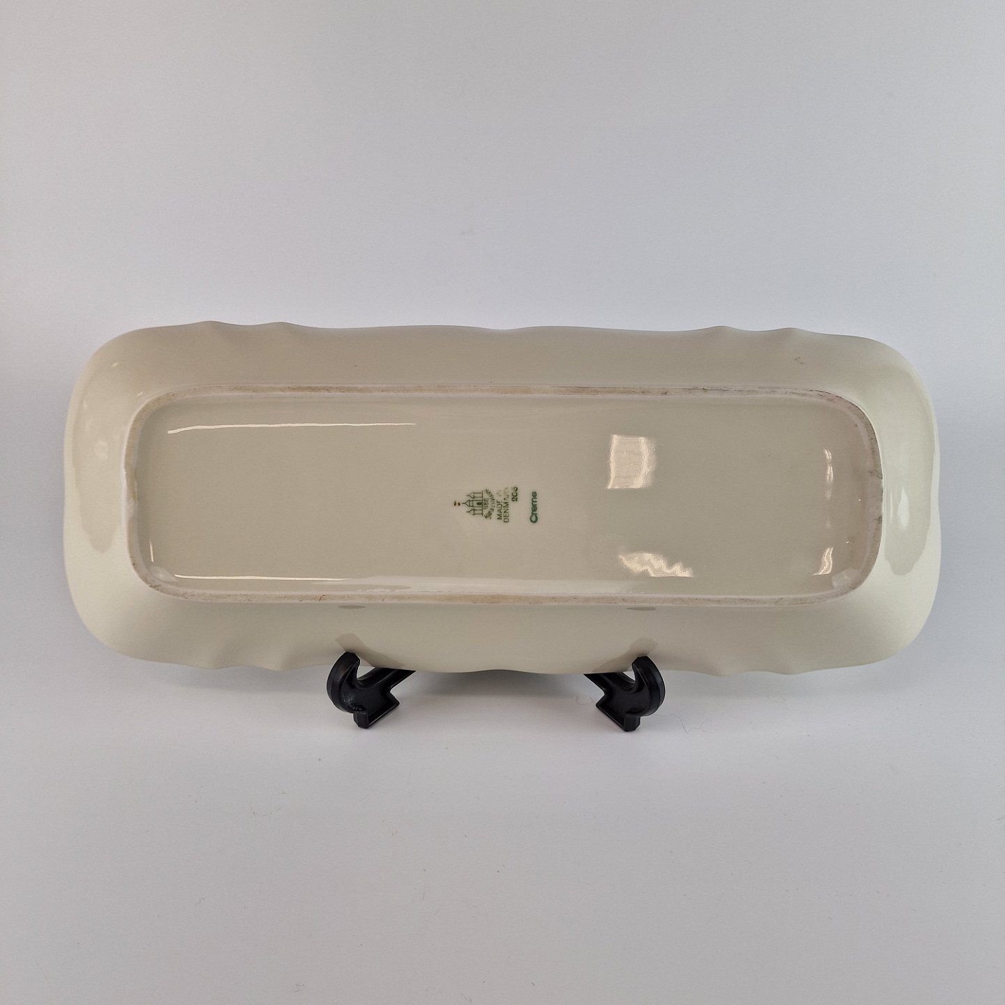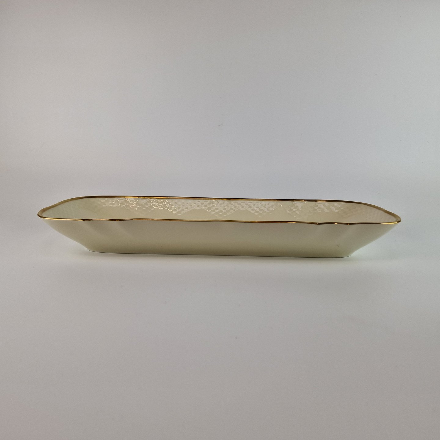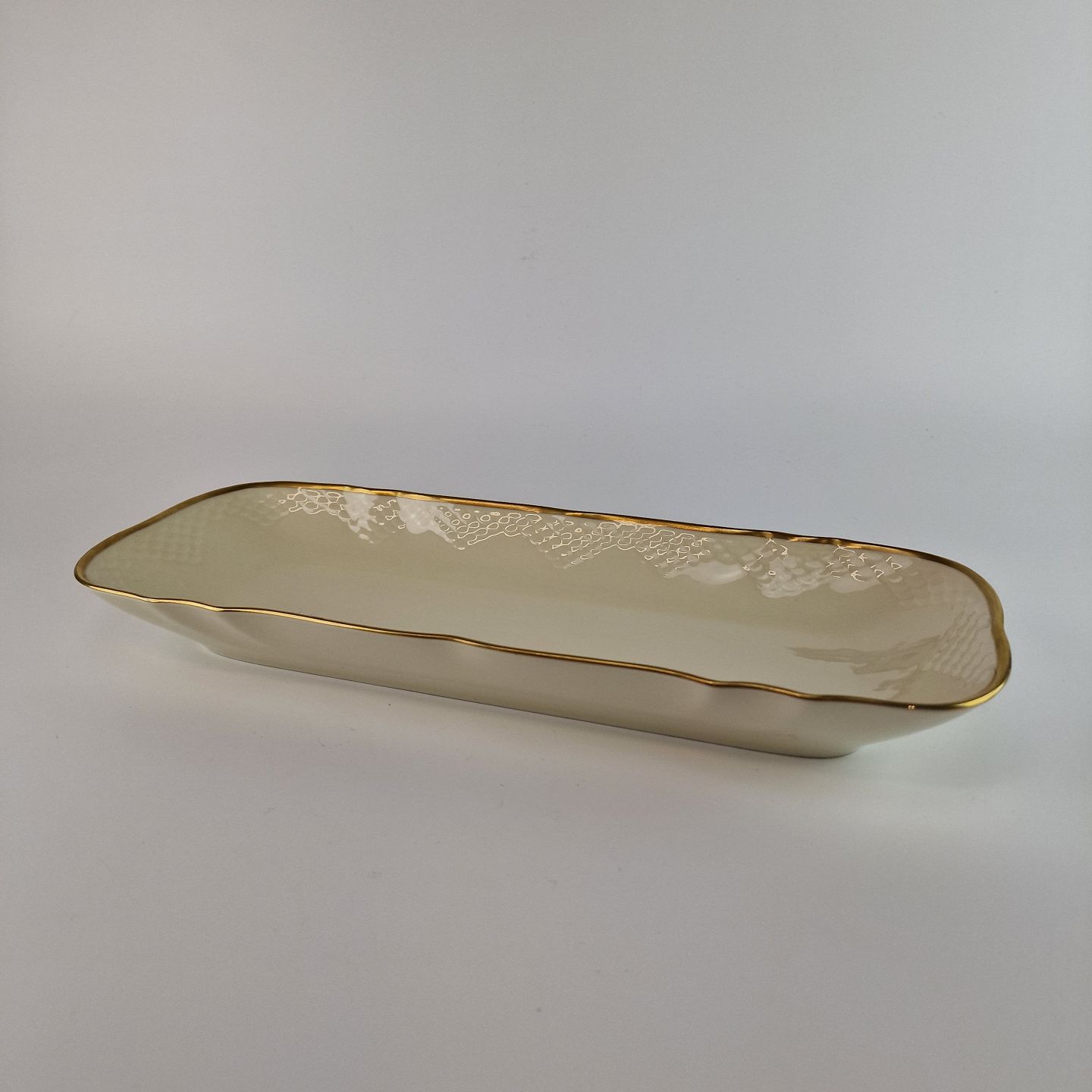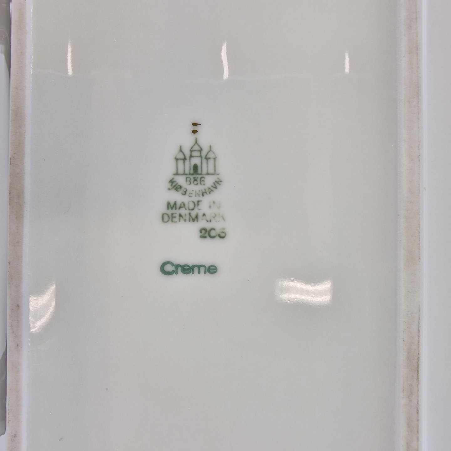 Åkjær er cremefarvet porcelæn med guldkant og mønster som ligner skæl