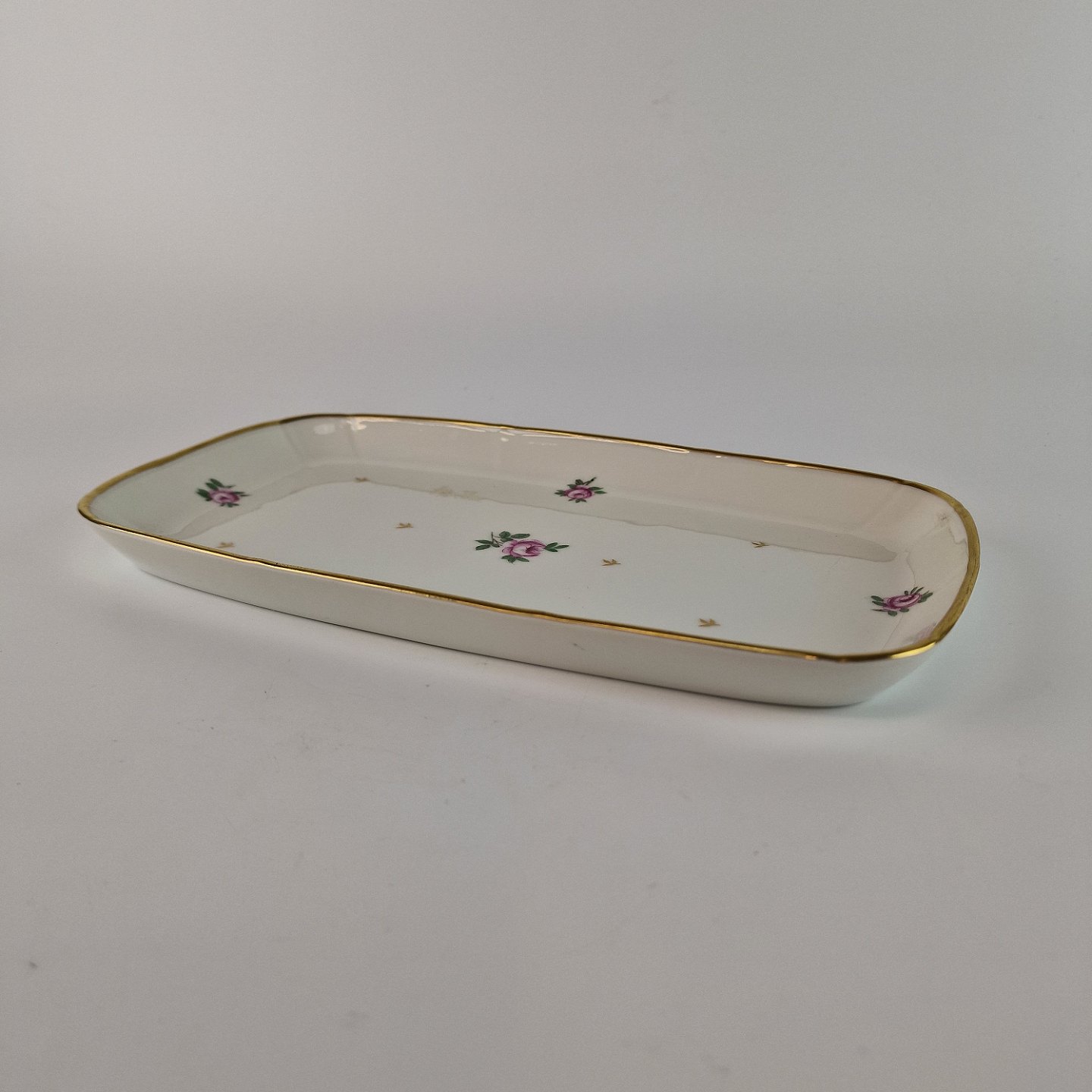 Roselil er kantet hvidt porcelæn med bred guldkant og er dekoreret med roser og blade
