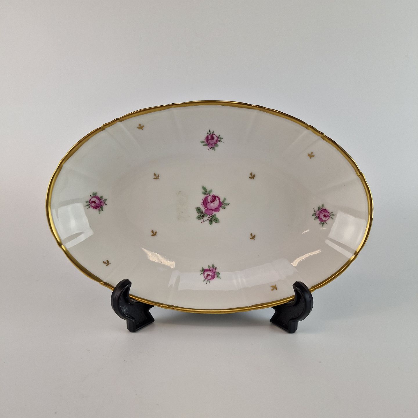 Roselil er kantet hvidt porcelæn med bred guldkant og er dekoreret med roser og blade