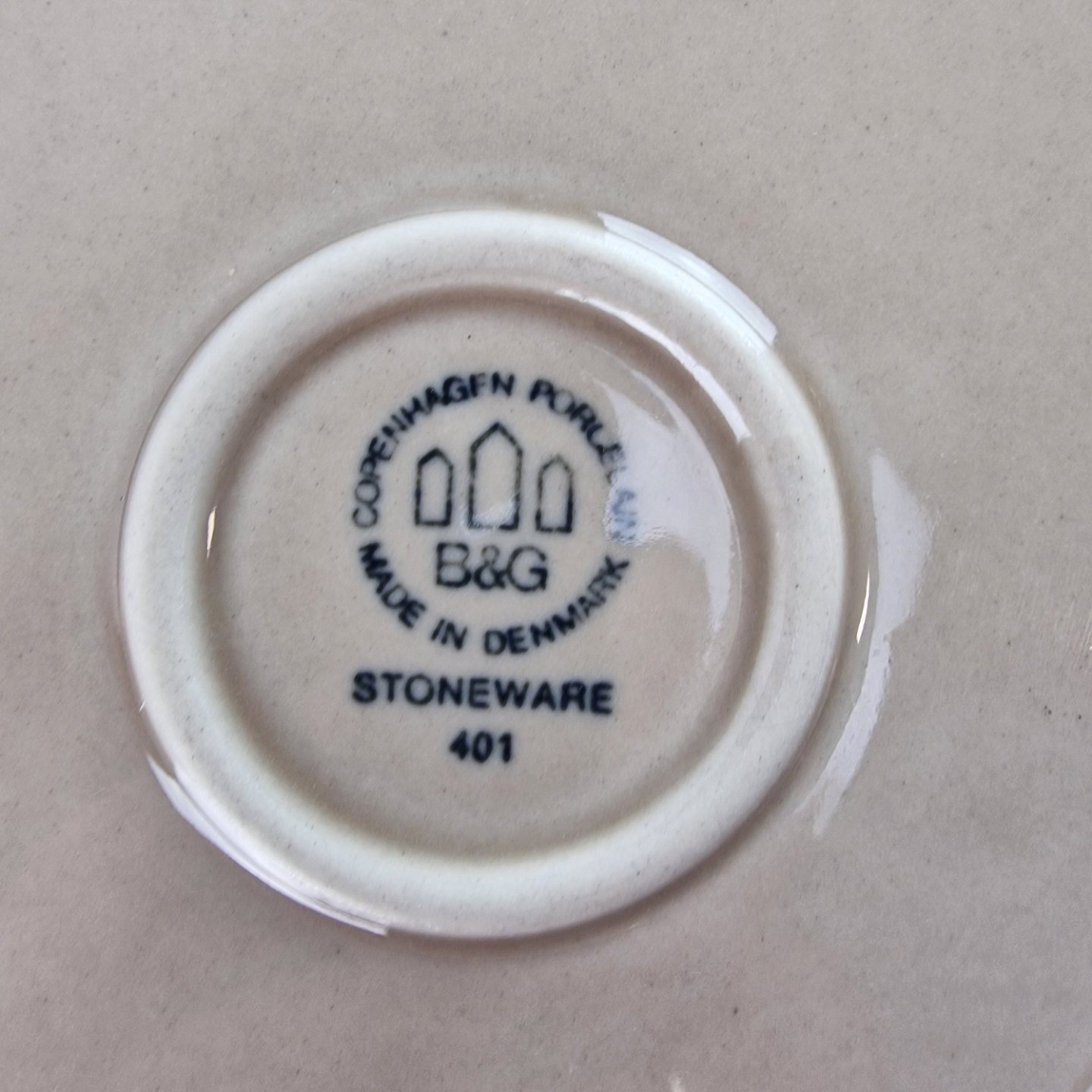 Stellet Peru er af stentøj, glaseret med lys grå farve og dekoreret med bånd af grøn/brunlige farve