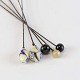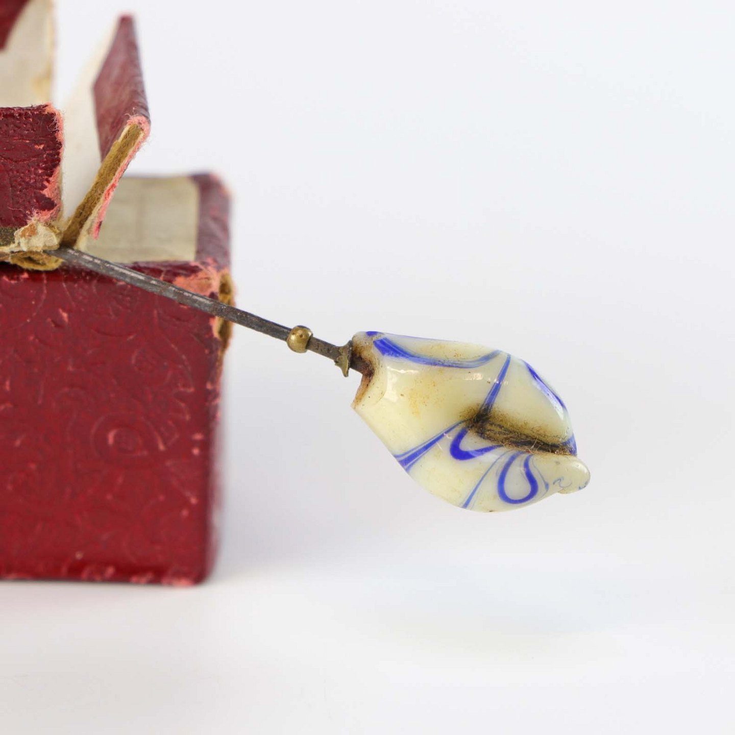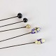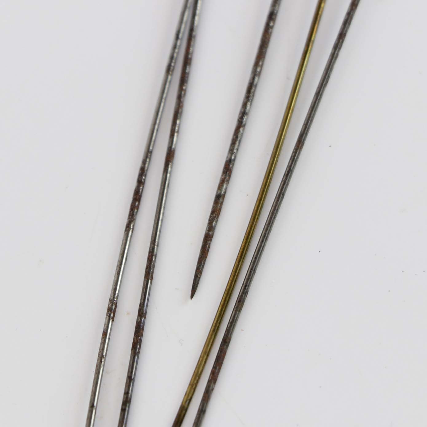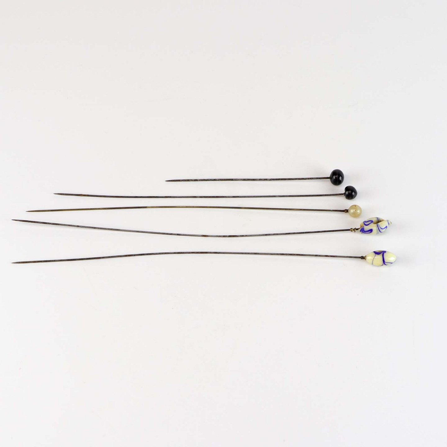 Fem styk hattenåle i forskellige længder. Nogle af porcelæn og en enkelt perle.