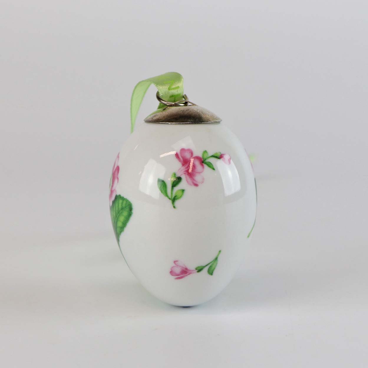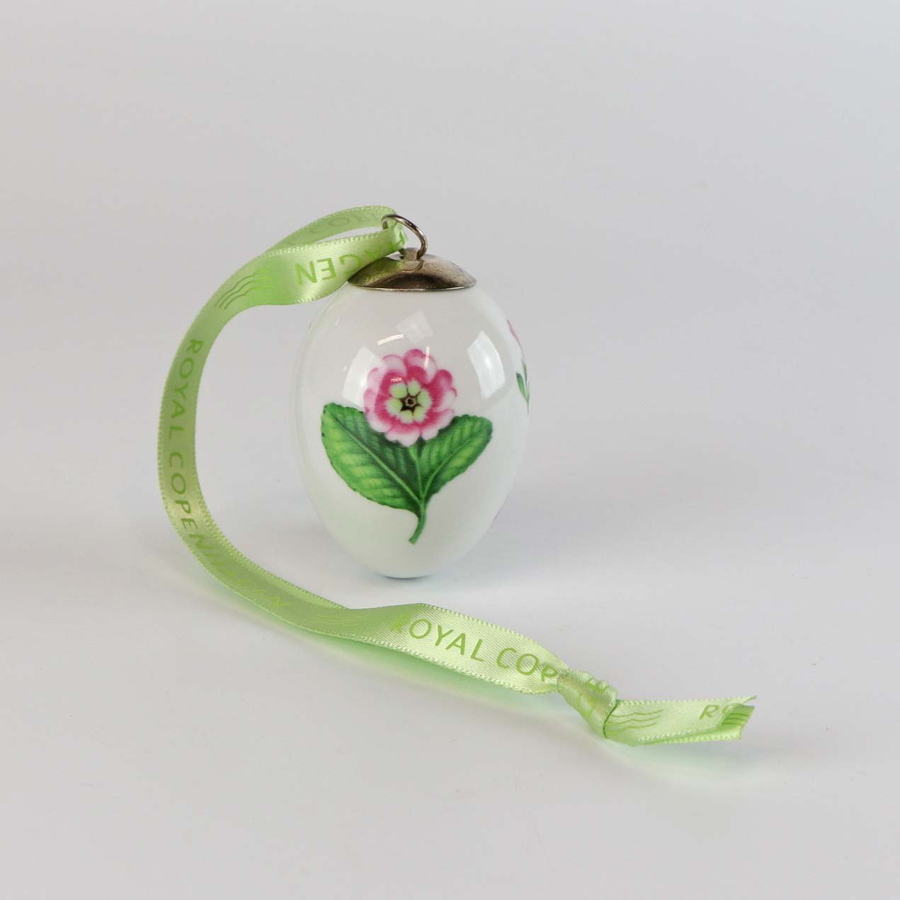 Håndlavet og håndmalet æg af porcelæn med bånd til ophæng. Fra serien Spring kollektion. Motiv af primula. Er i originalæske