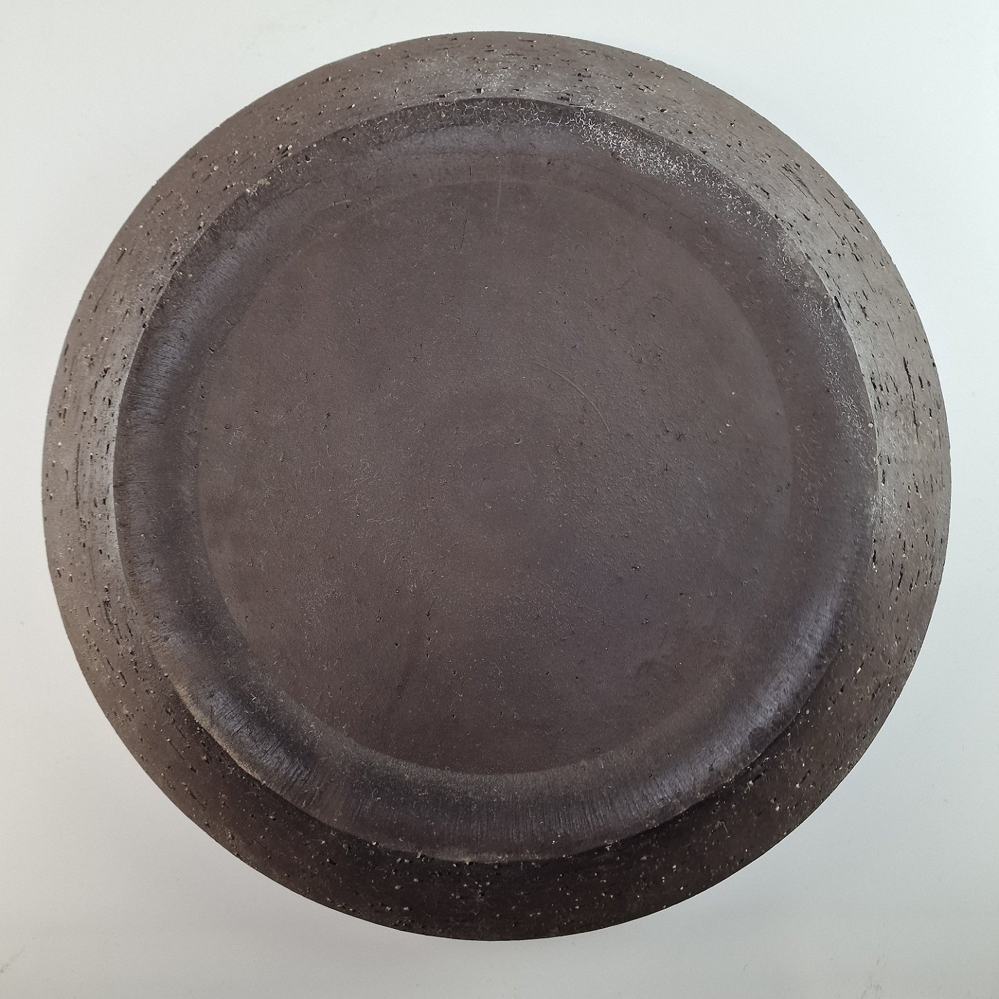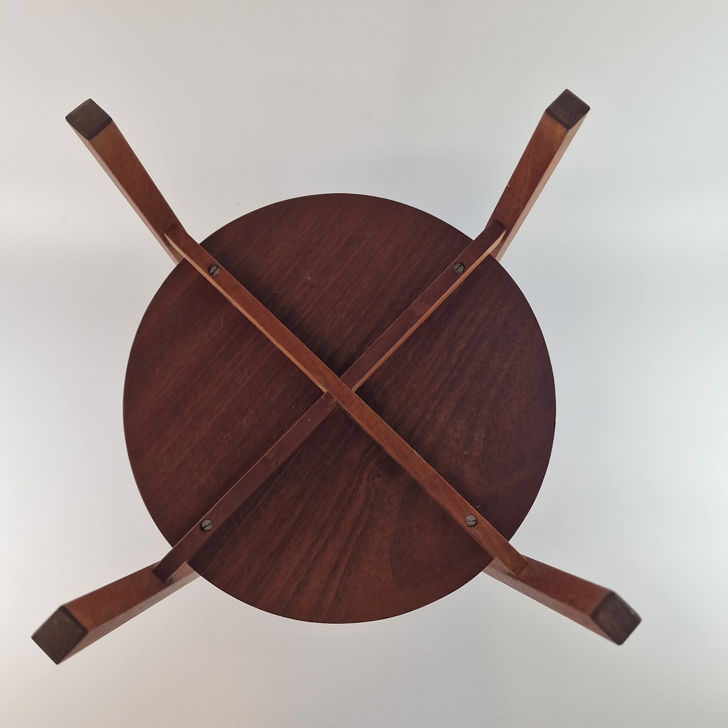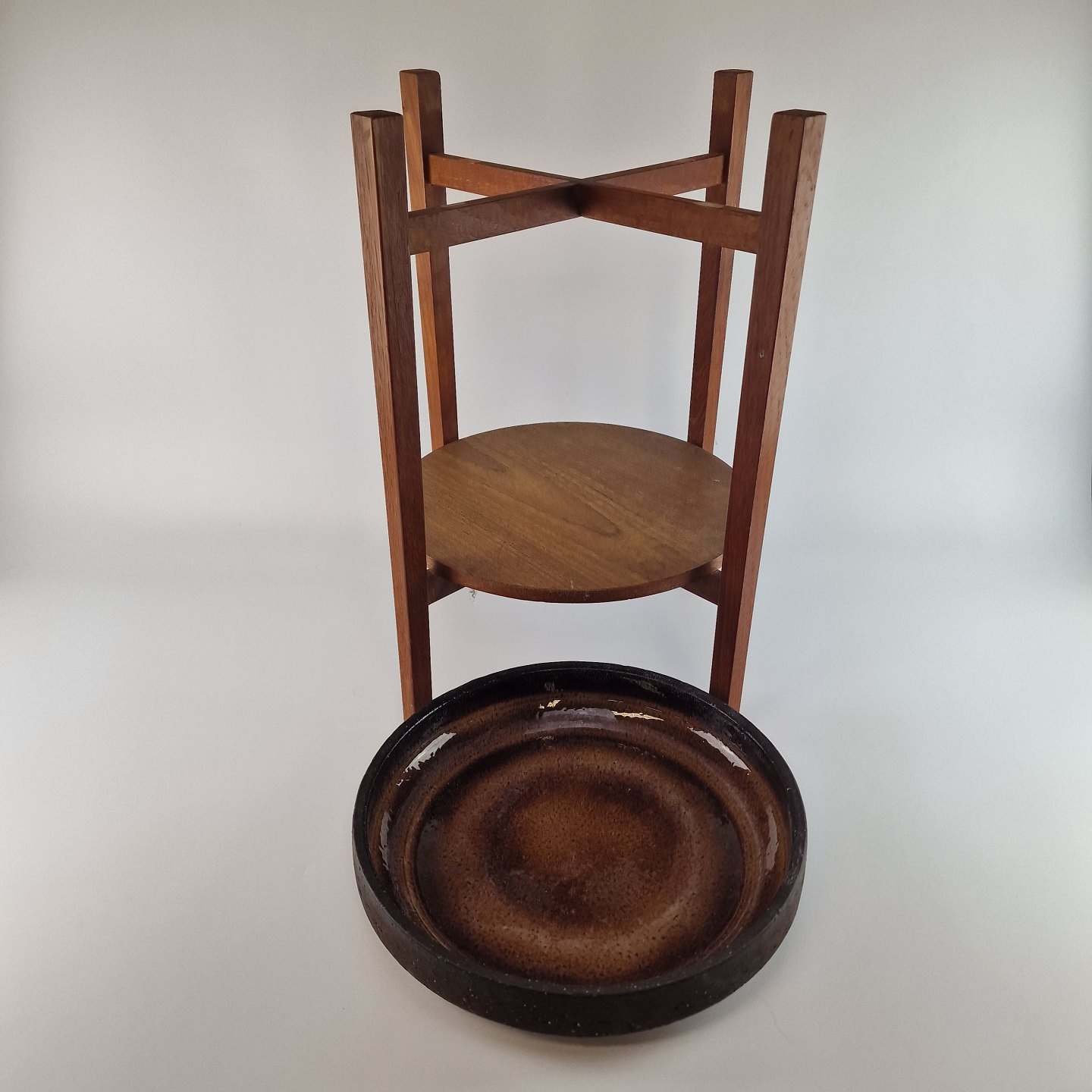 Rundt bord med fad af keramik og hylde forneden. Stellet er af teaktræ