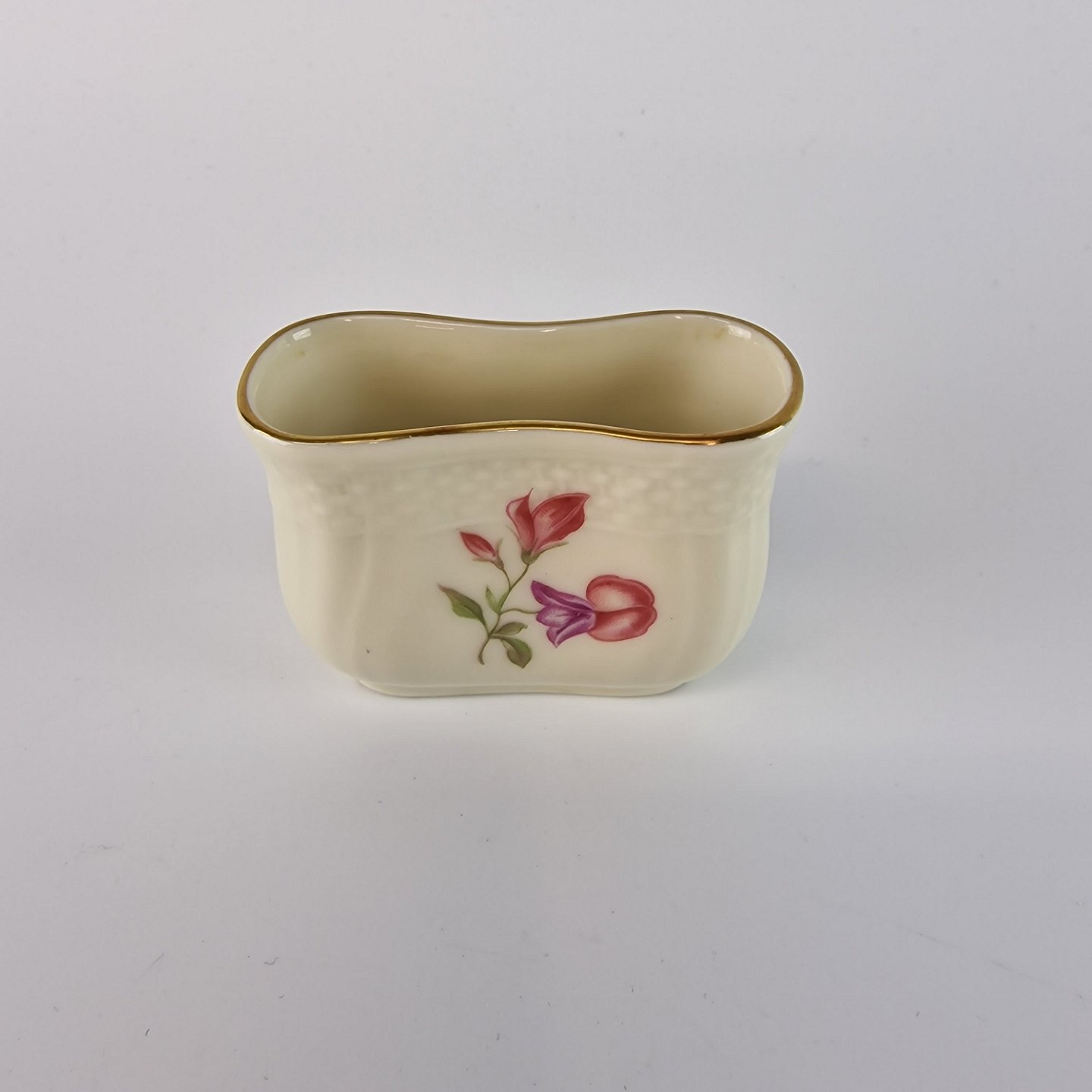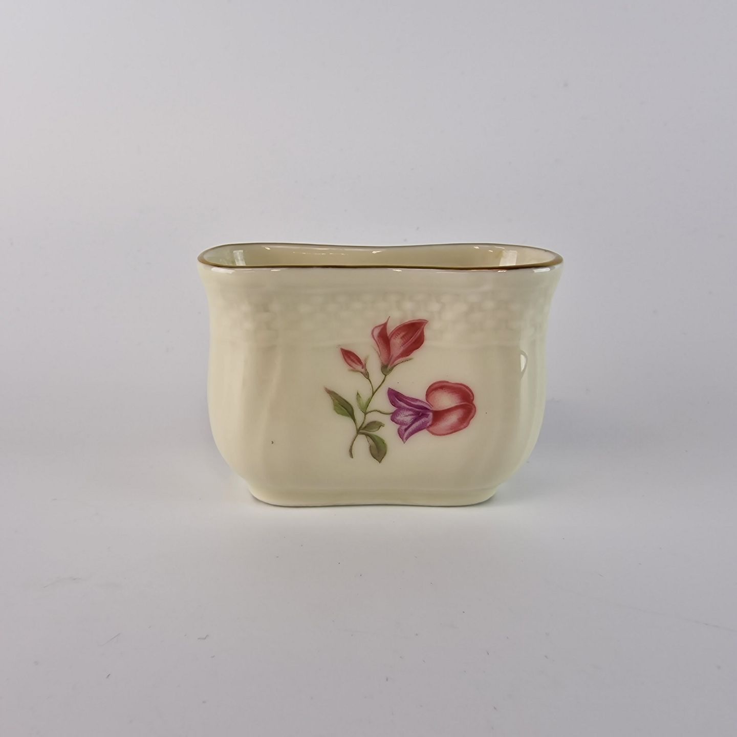 Frijsenborg har cremefarvet glasur og mangefarvede rokoko blomsterdekorationer, samt guldkant. Dette kaffe og spisestel er opkaldt efter den kendte herregård Frijsenborg ved Hammel som stammer fra 1672.