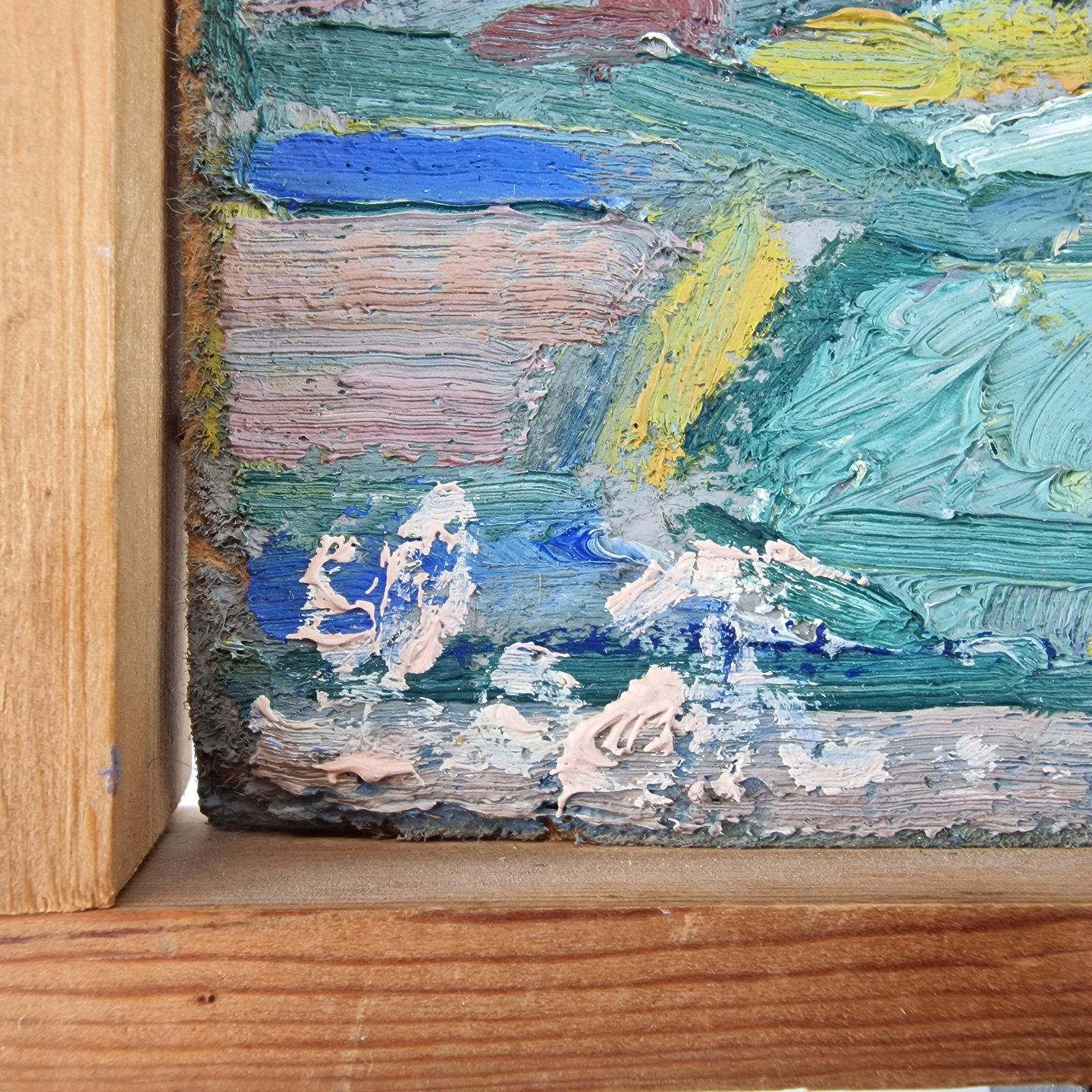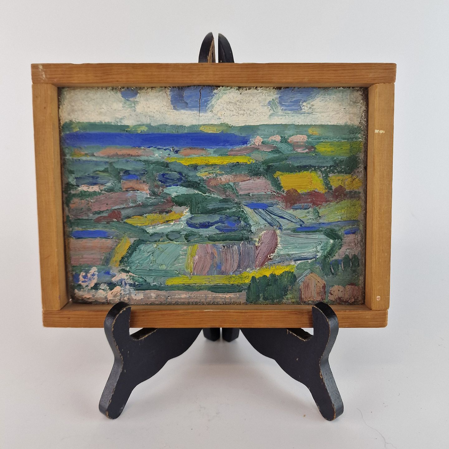 Oliemaleri på plade med abstrakt landskabsmaleri med motiv af udsigt over marker, søer og enge