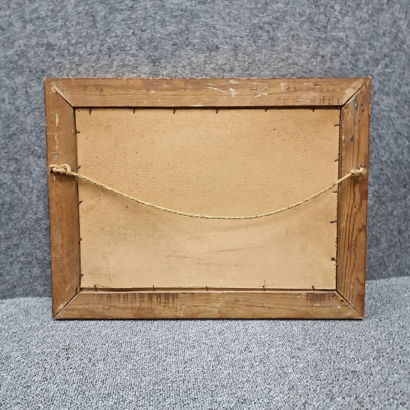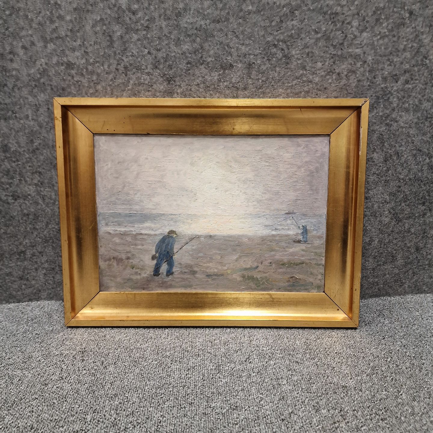 Oliemaleri på plade med gylden træramme. Kystlandskab med motiv af to fiskere på stranden