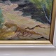 Oliemaleri på lærred i lys træramme. Landskabsmaleri af Piruphvarres bakker ved Saltum, juli 1954, med motiv af sti gennem hedeområde til nærliggende huse