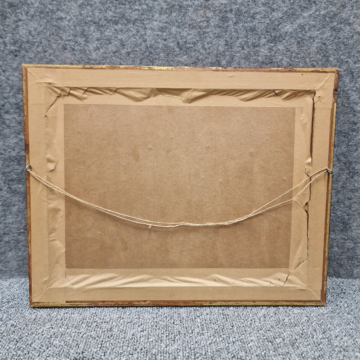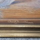 Oliemaleri i gylden træramme. Naturalistik maleri fra 1925 med stilleben motiv af seks dun liggende på et træbord