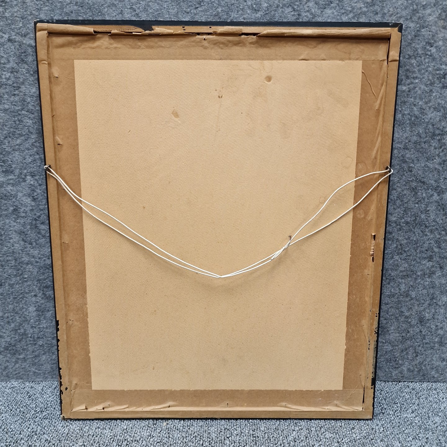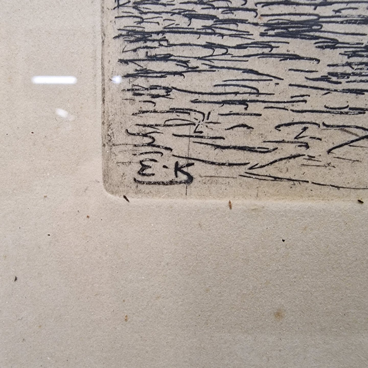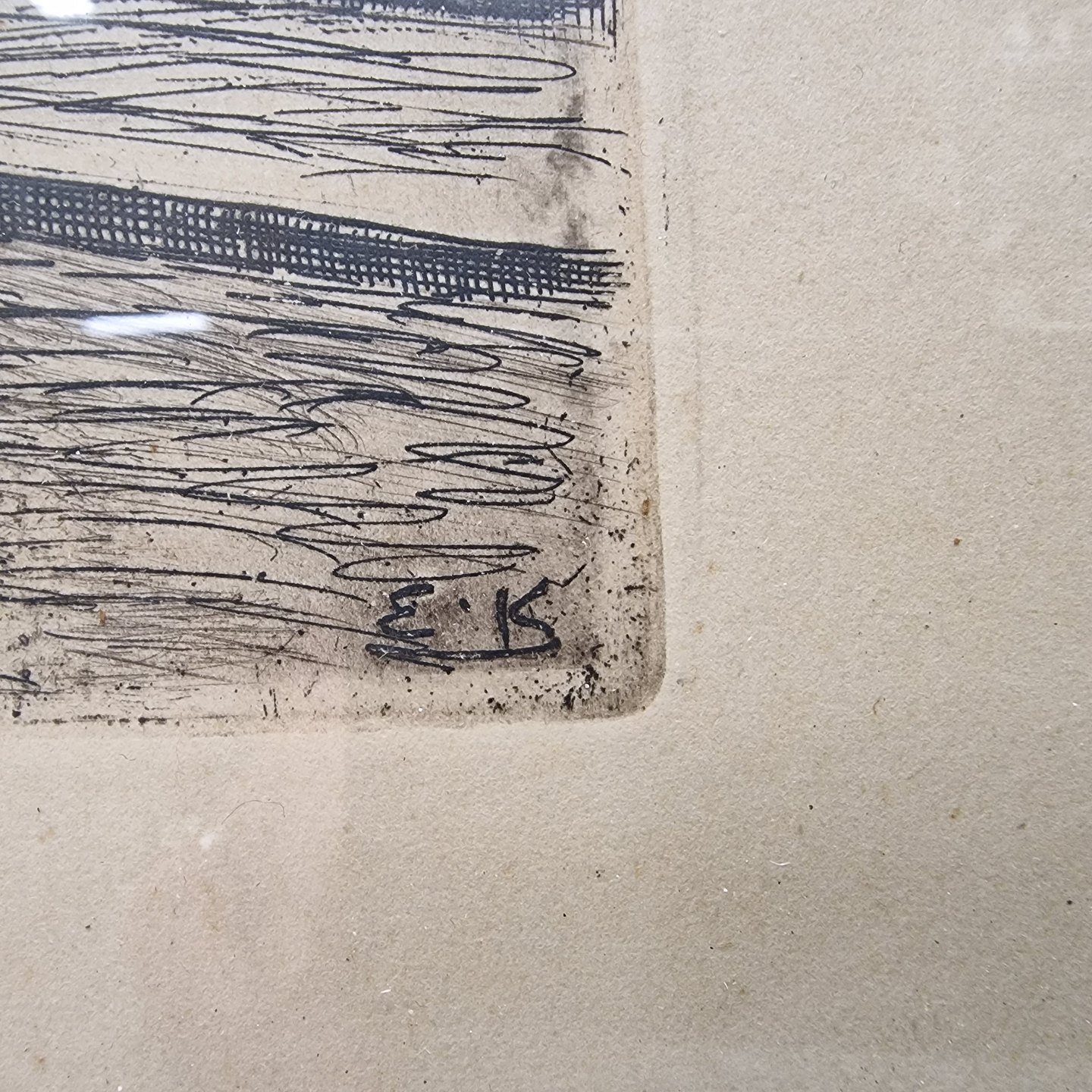 Indrammet radering i træramme. Raderingen viser et byskabsbillede med motiv af huse langs brolagt vej med mennesker og hestevogn