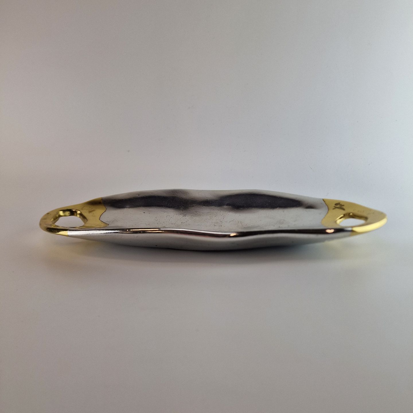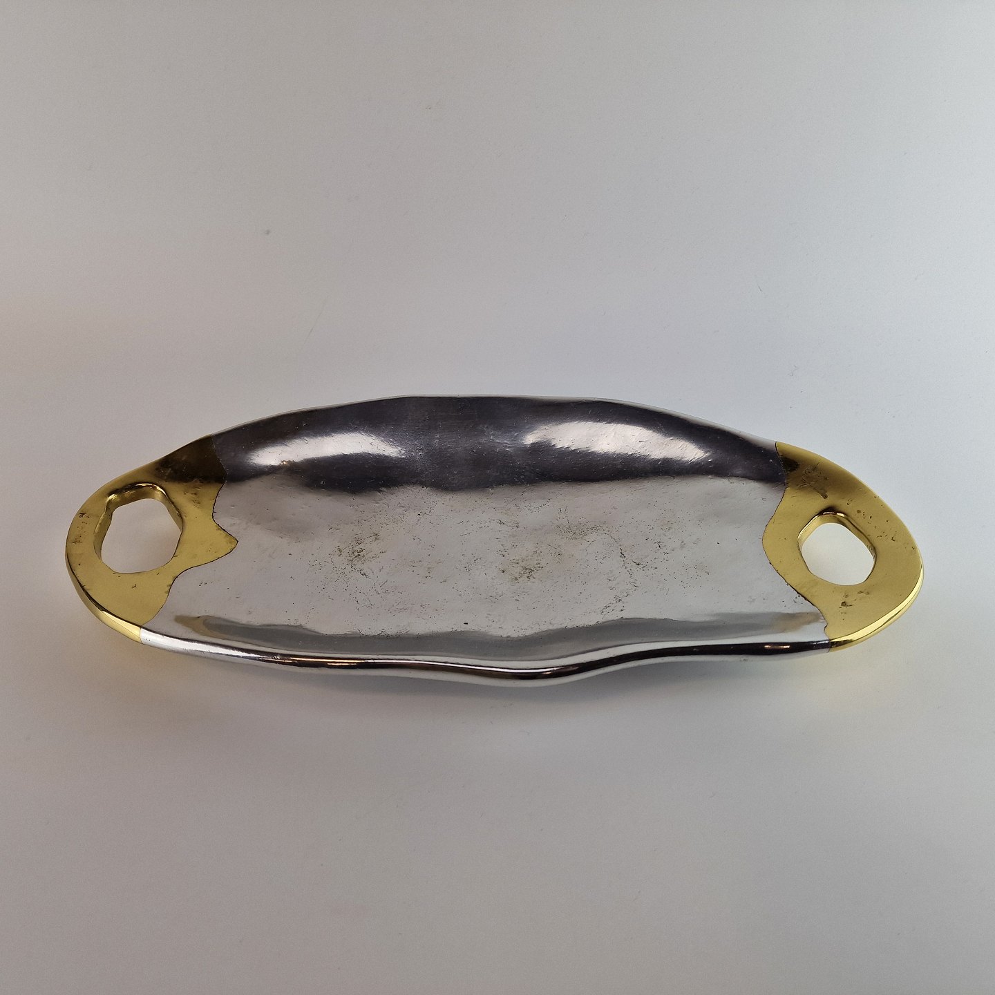 Stort abstrakt metalfad, håndstøbt i massiv aluminium med indstøbte messinghåndtag