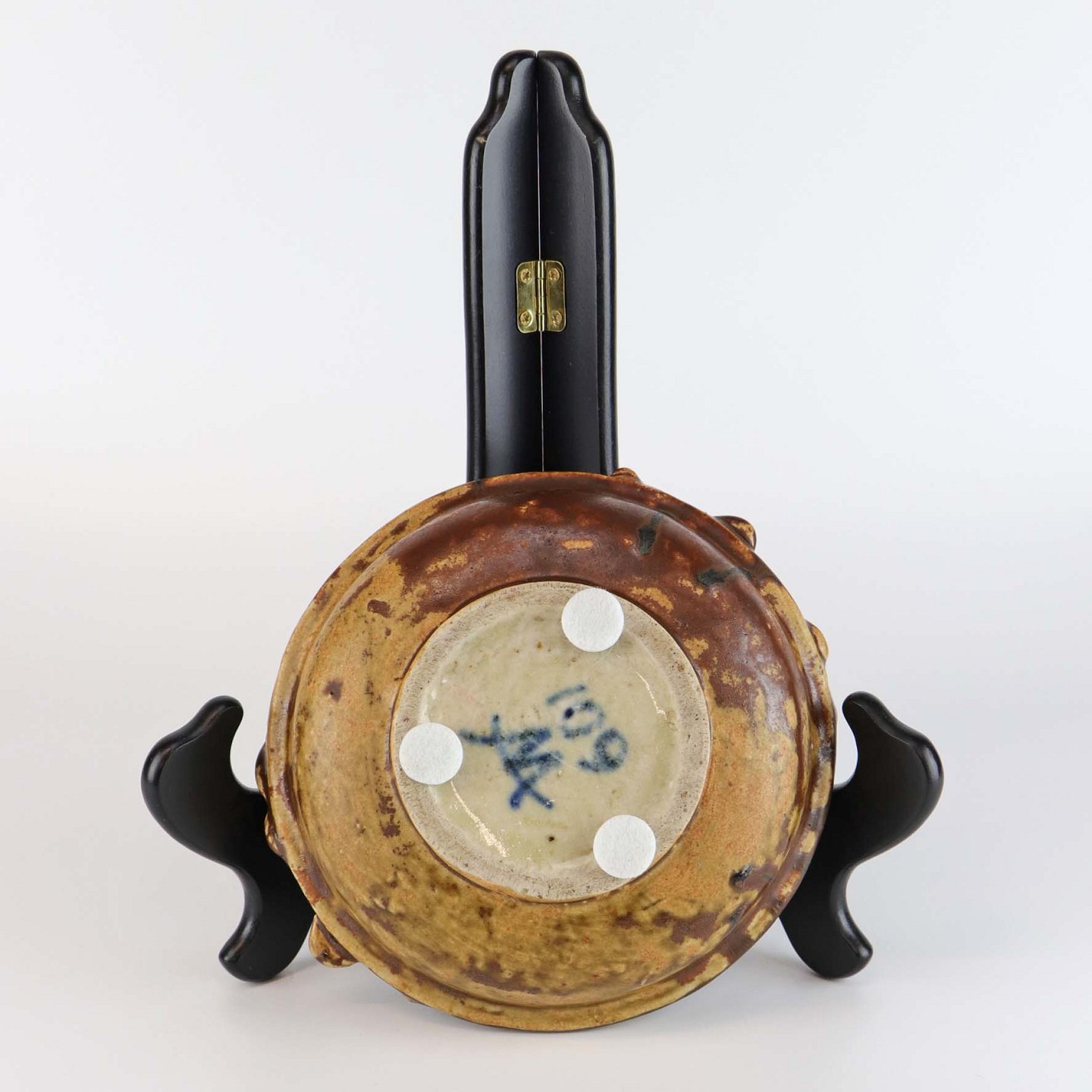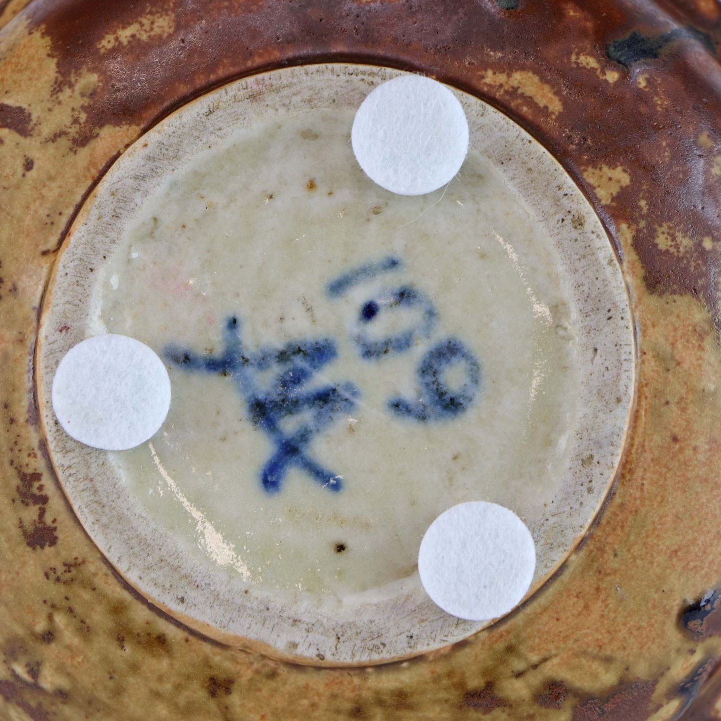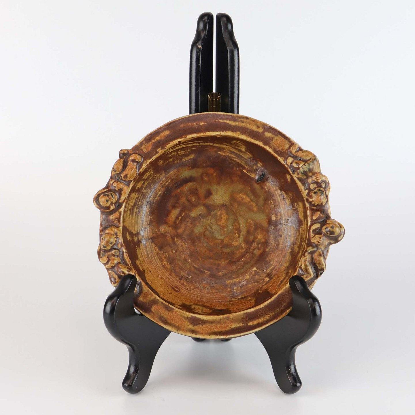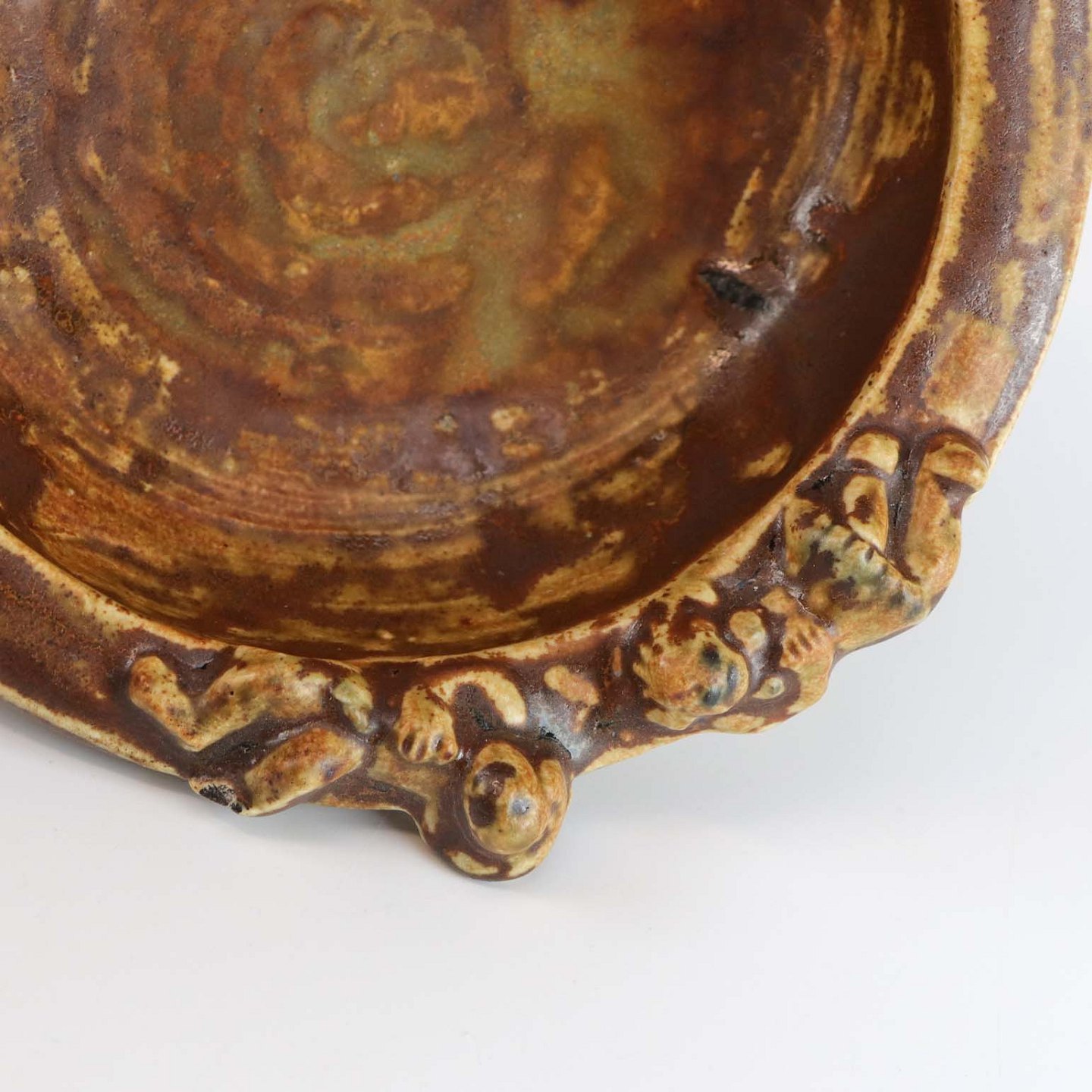 Lav skål af stentøj. Kanten er dekoreret med figurer af liggende mennesker