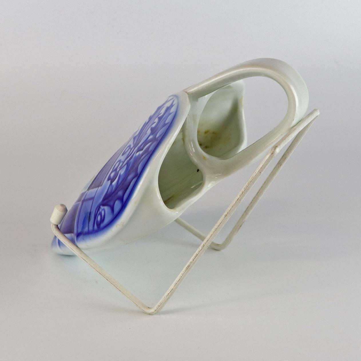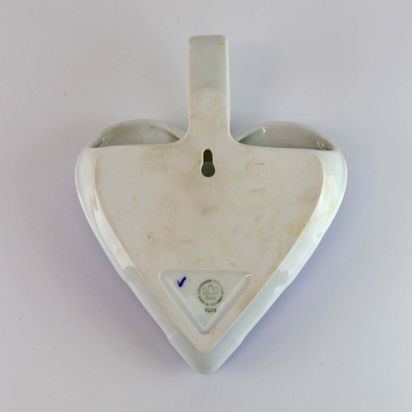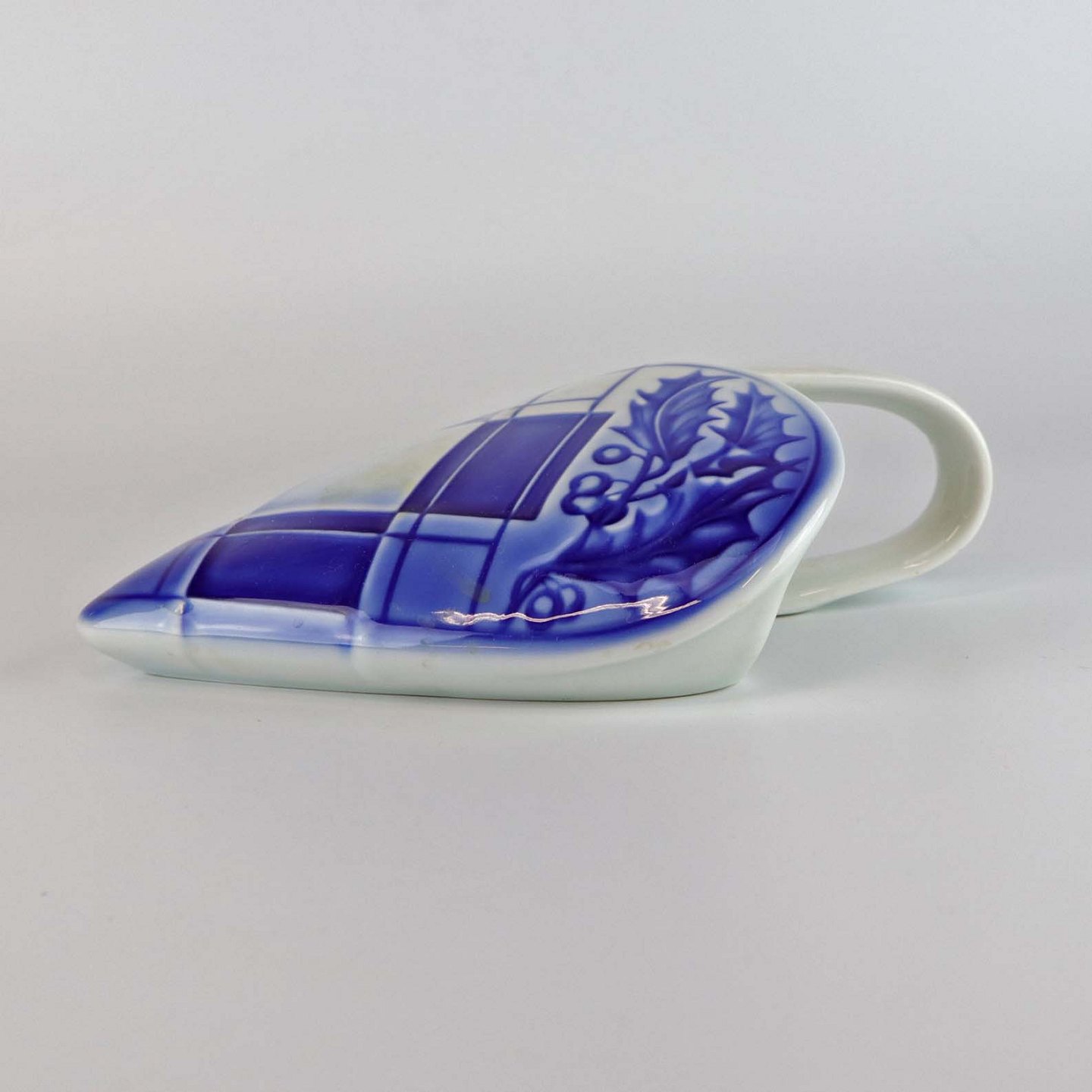 Hjerteophæng i porcelæn i blå og hvide farver. Dekoreret med kristtjørn og felter så det ligner hjertet er flettet. No 9205
